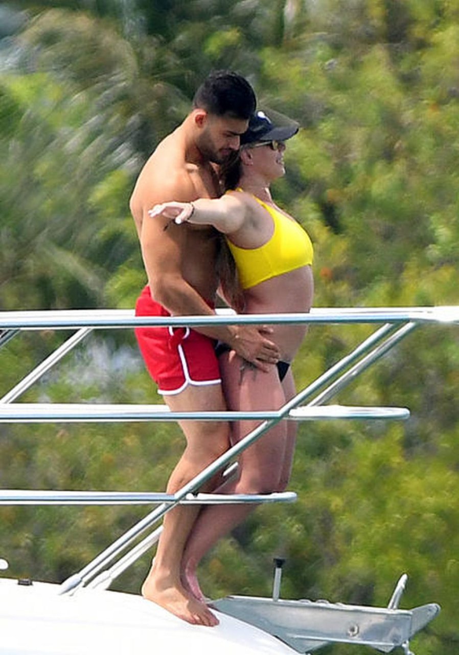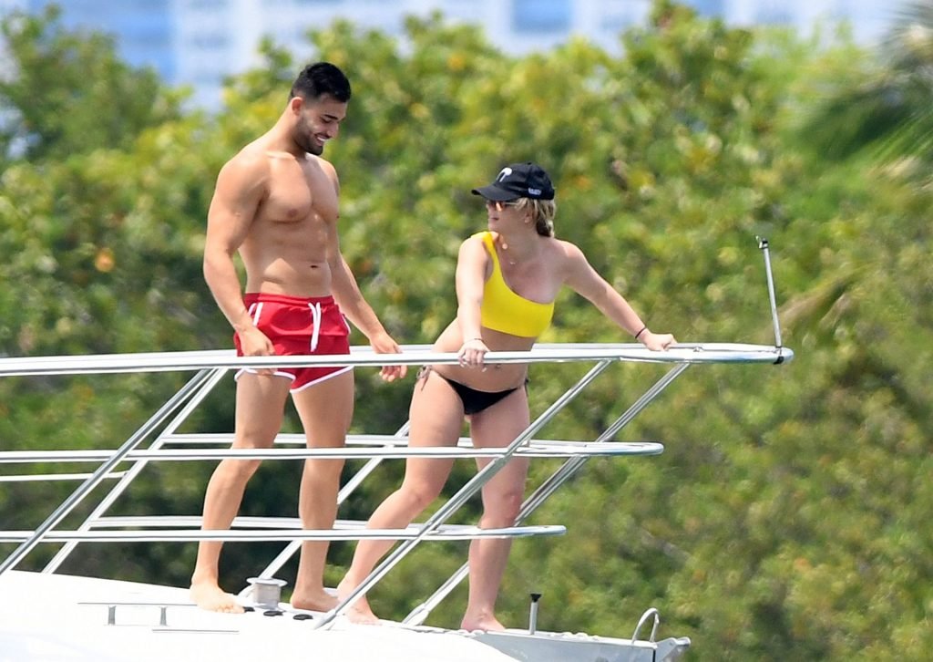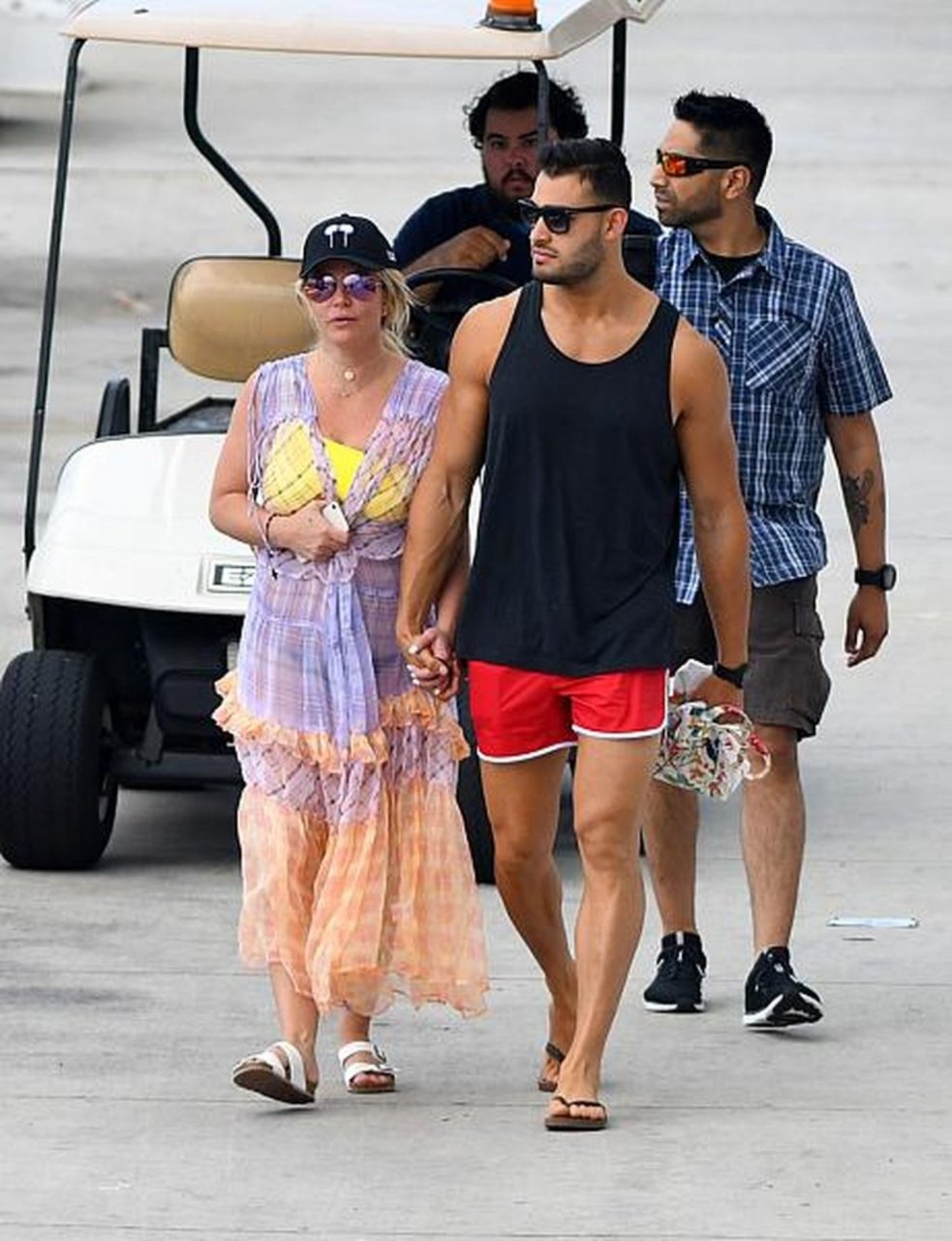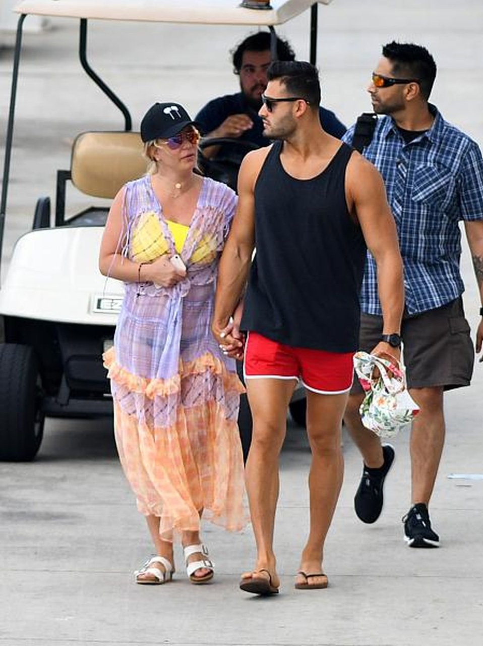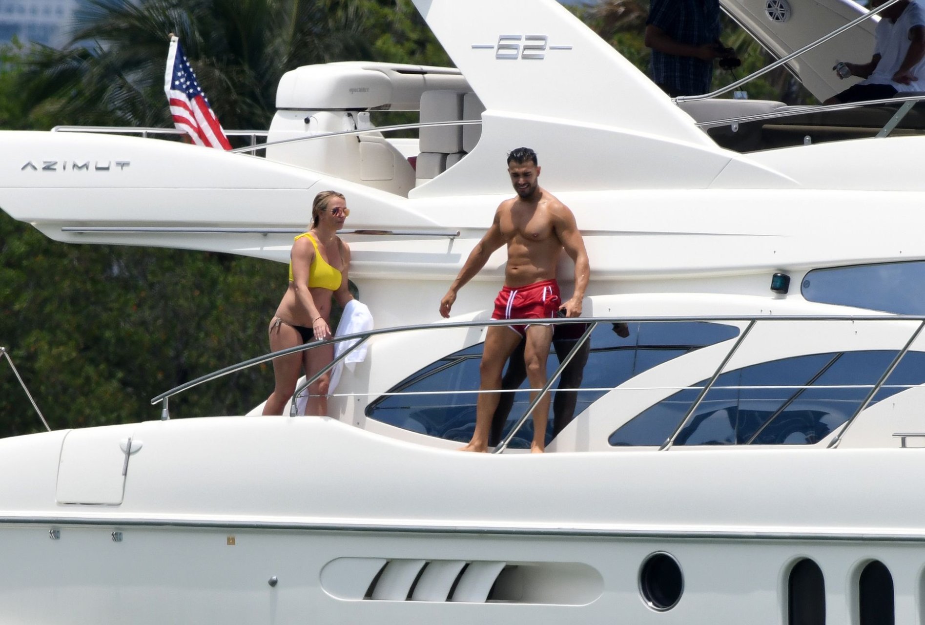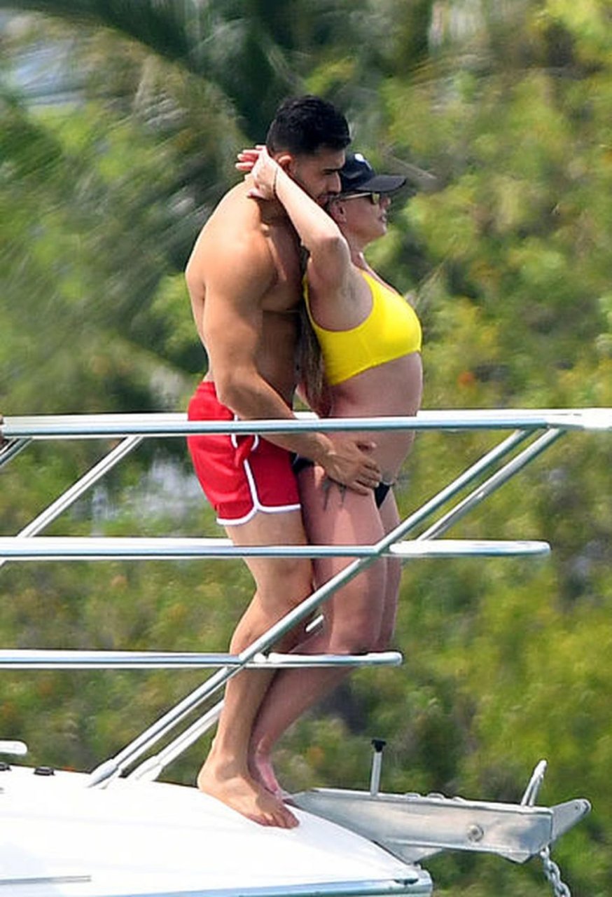 Britney Spears носит желтый бикини, проводя насыщенный событиями день на яхте с бойфрендом Сэмом Асгари в Майами, 06/08/2019.