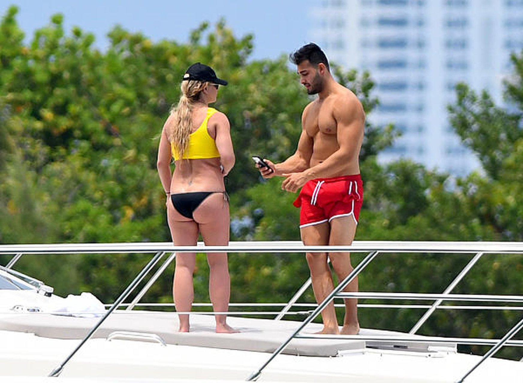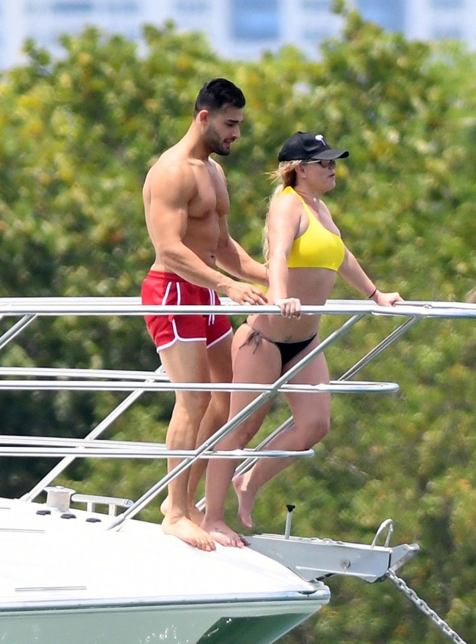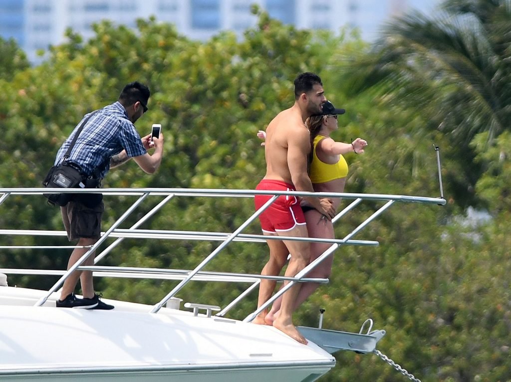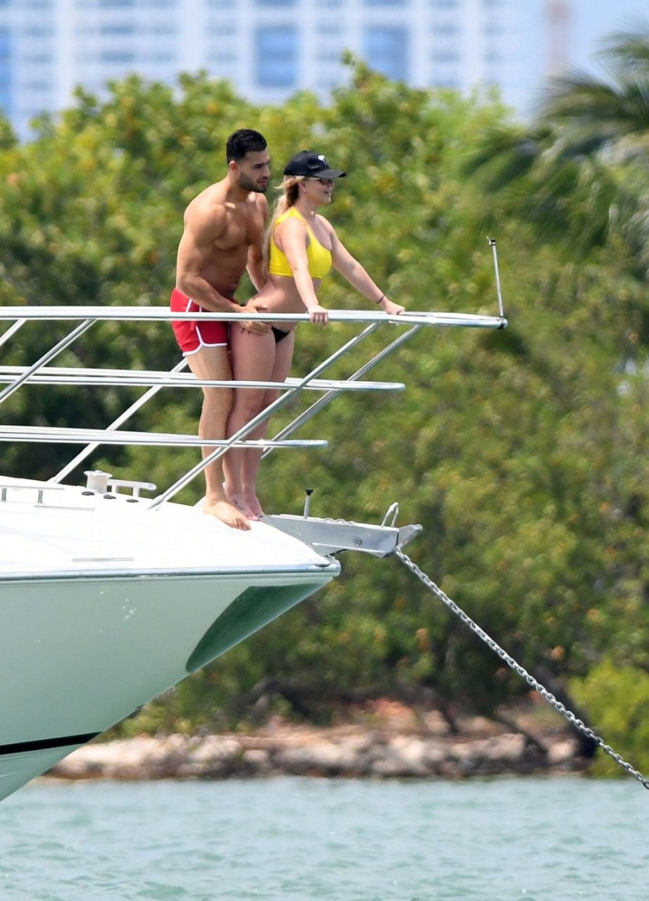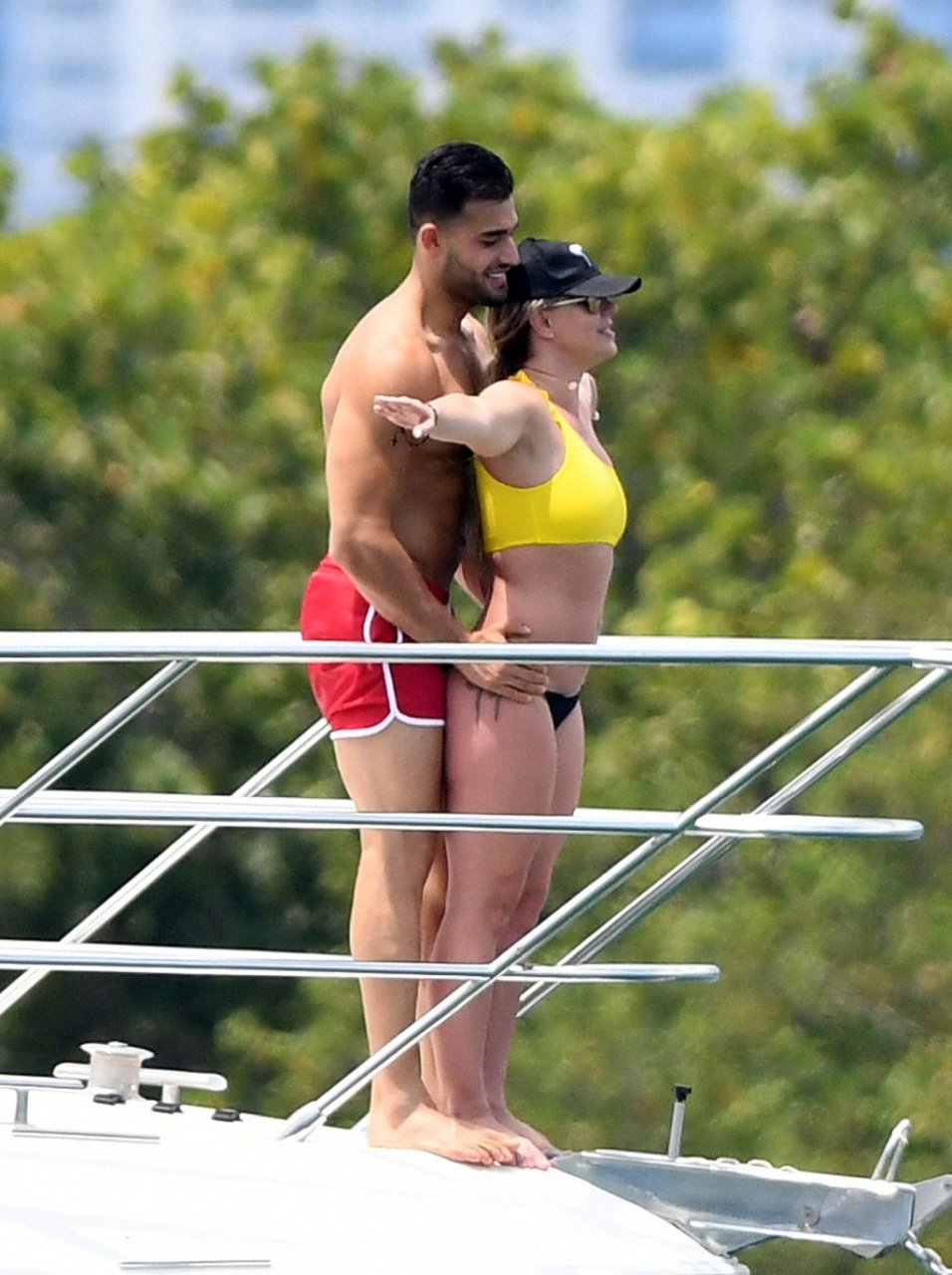Britney Spears носит желтый бикини, проводя насыщенный событиями день на яхте с бойфрендом Сэмом Асгари в Майами, 06/08/2019.