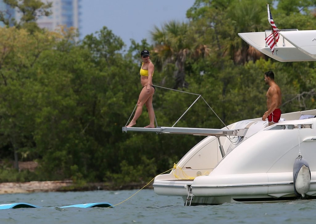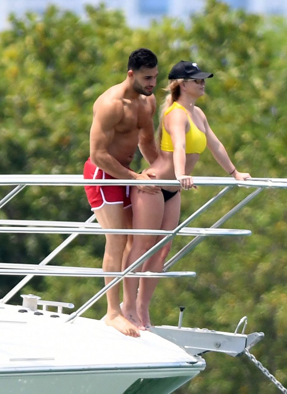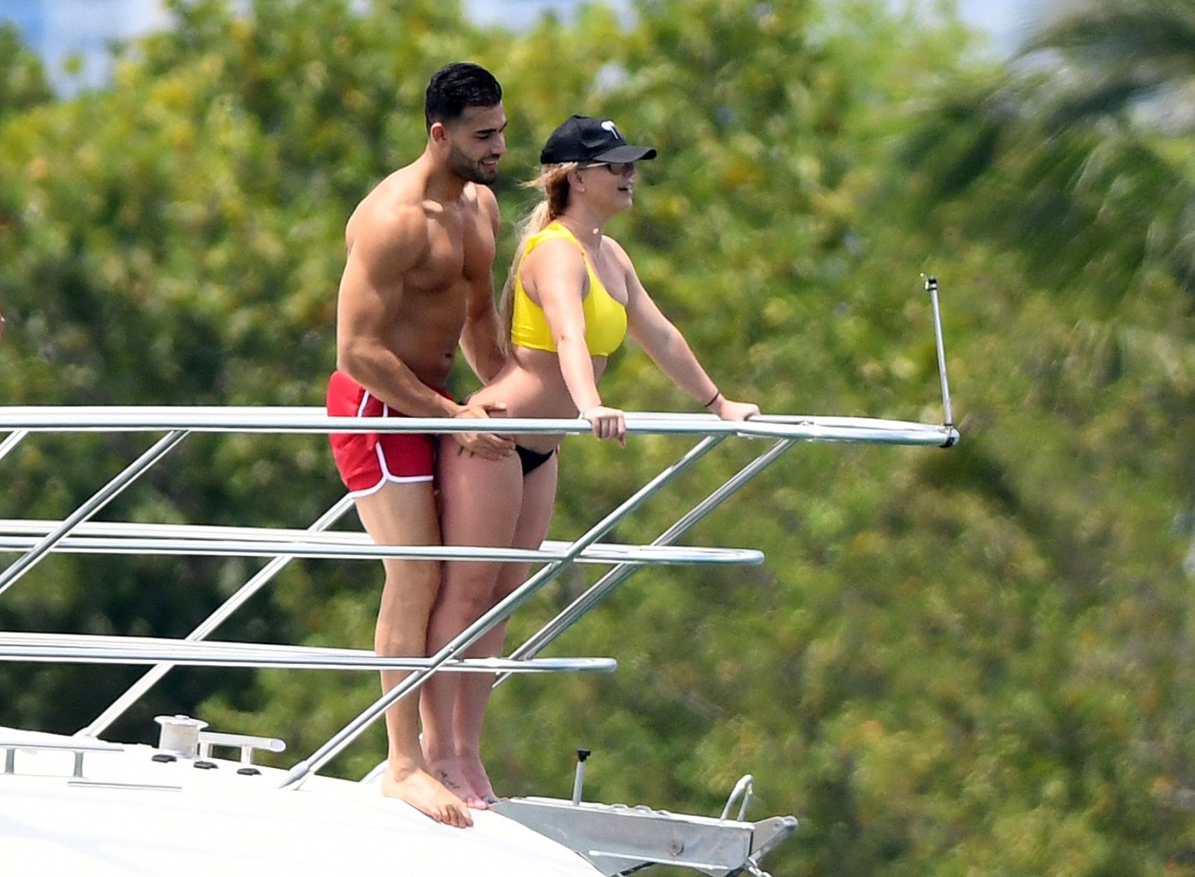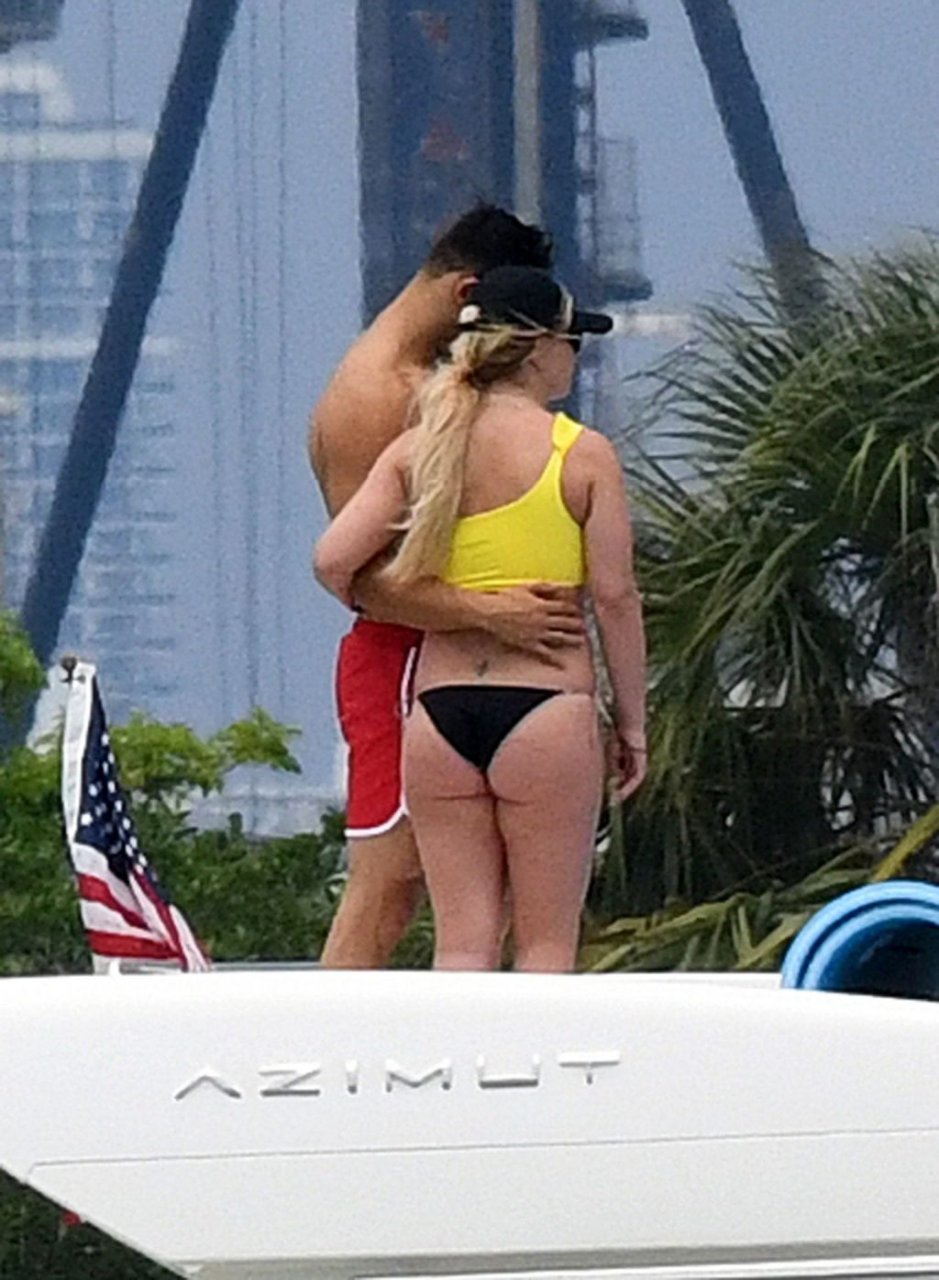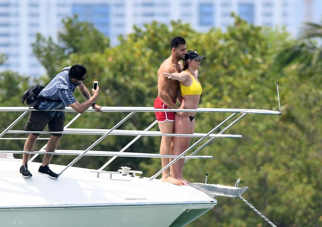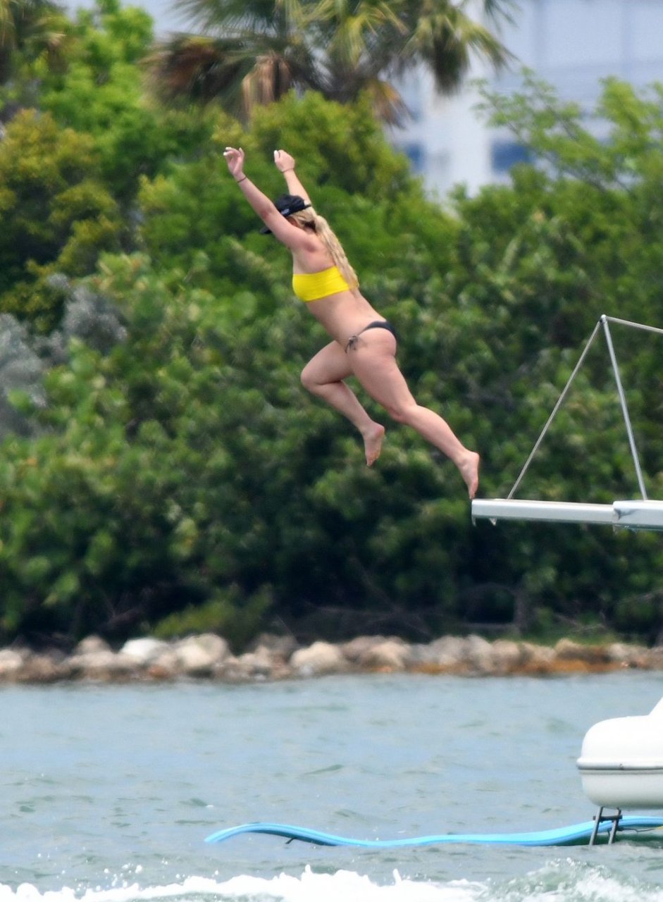 Britney Spears носит желтый бикини, проводя насыщенный событиями день на яхте с бойфрендом Сэмом Асгари в Майами, 06/08/2019.