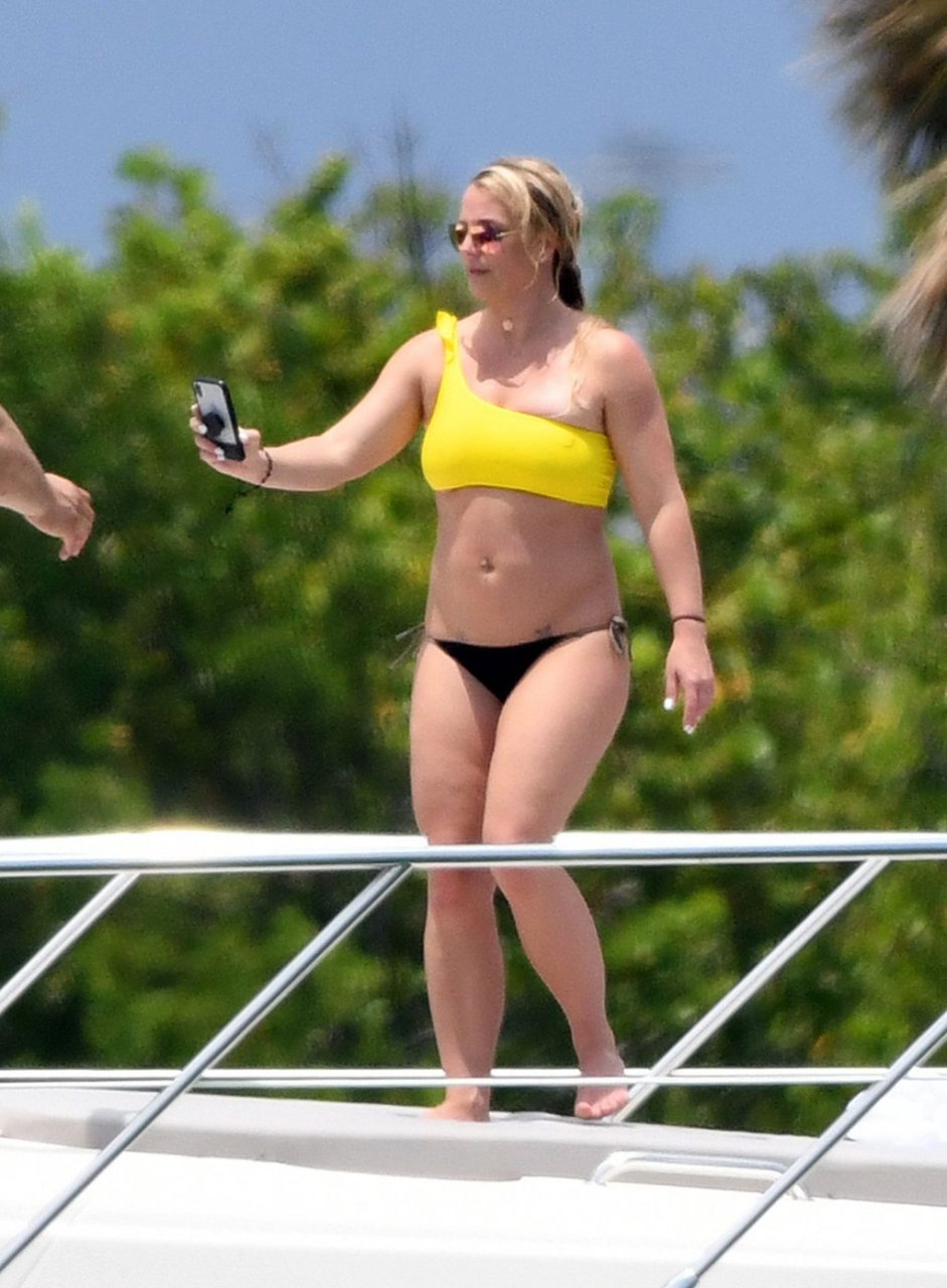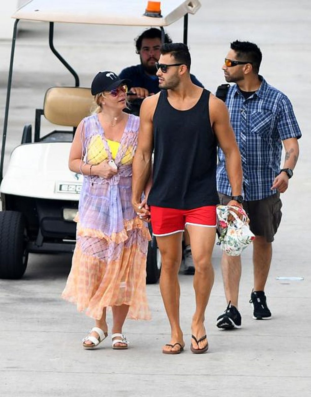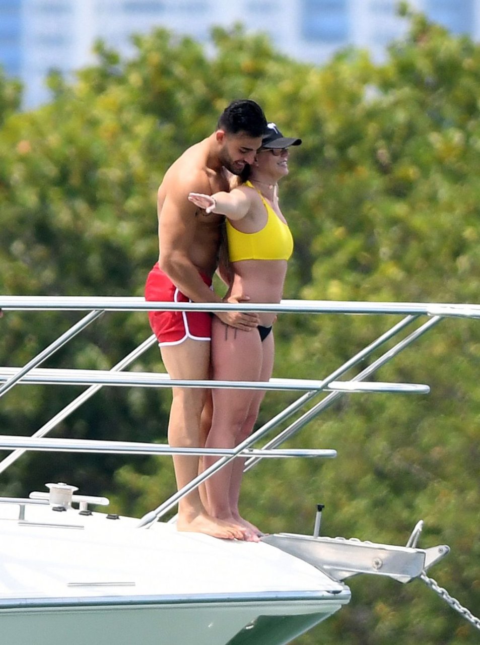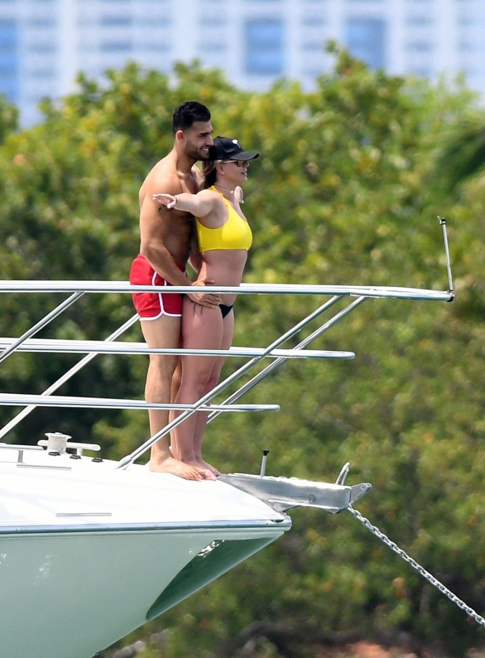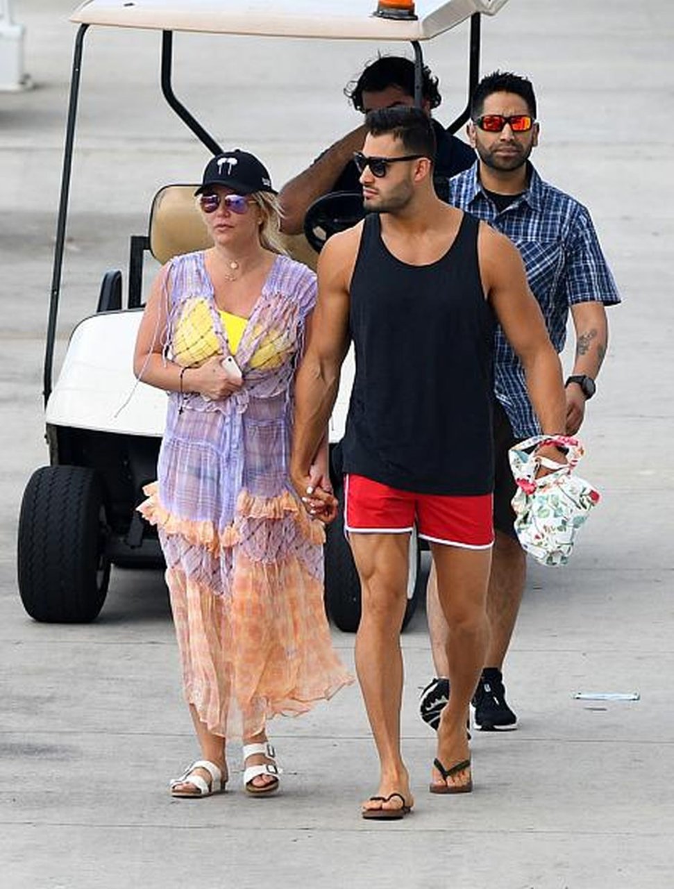 Britney Spears носит желтый бикини, проводя насыщенный событиями день на яхте с бойфрендом Сэмом Асгари в Майами, 06/08/2019.