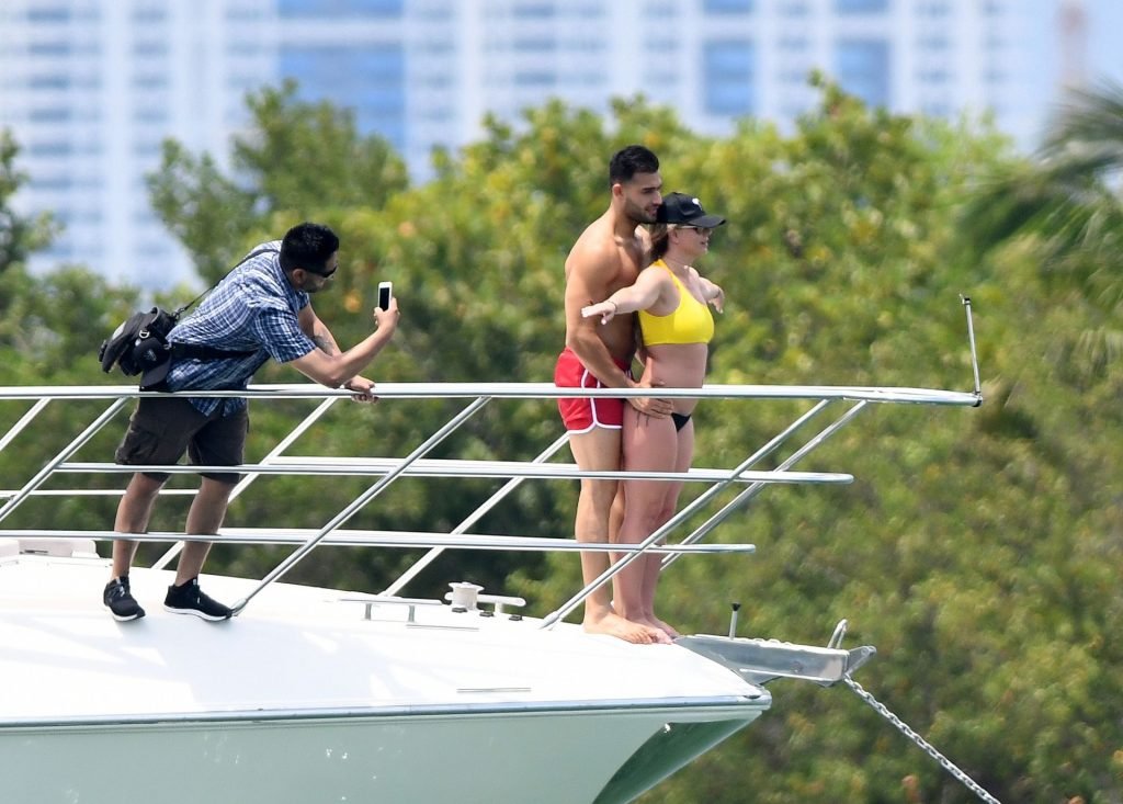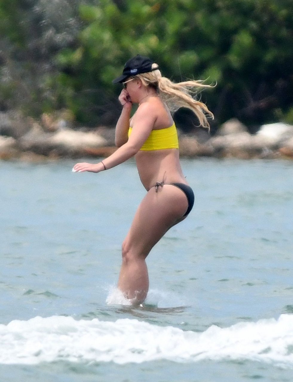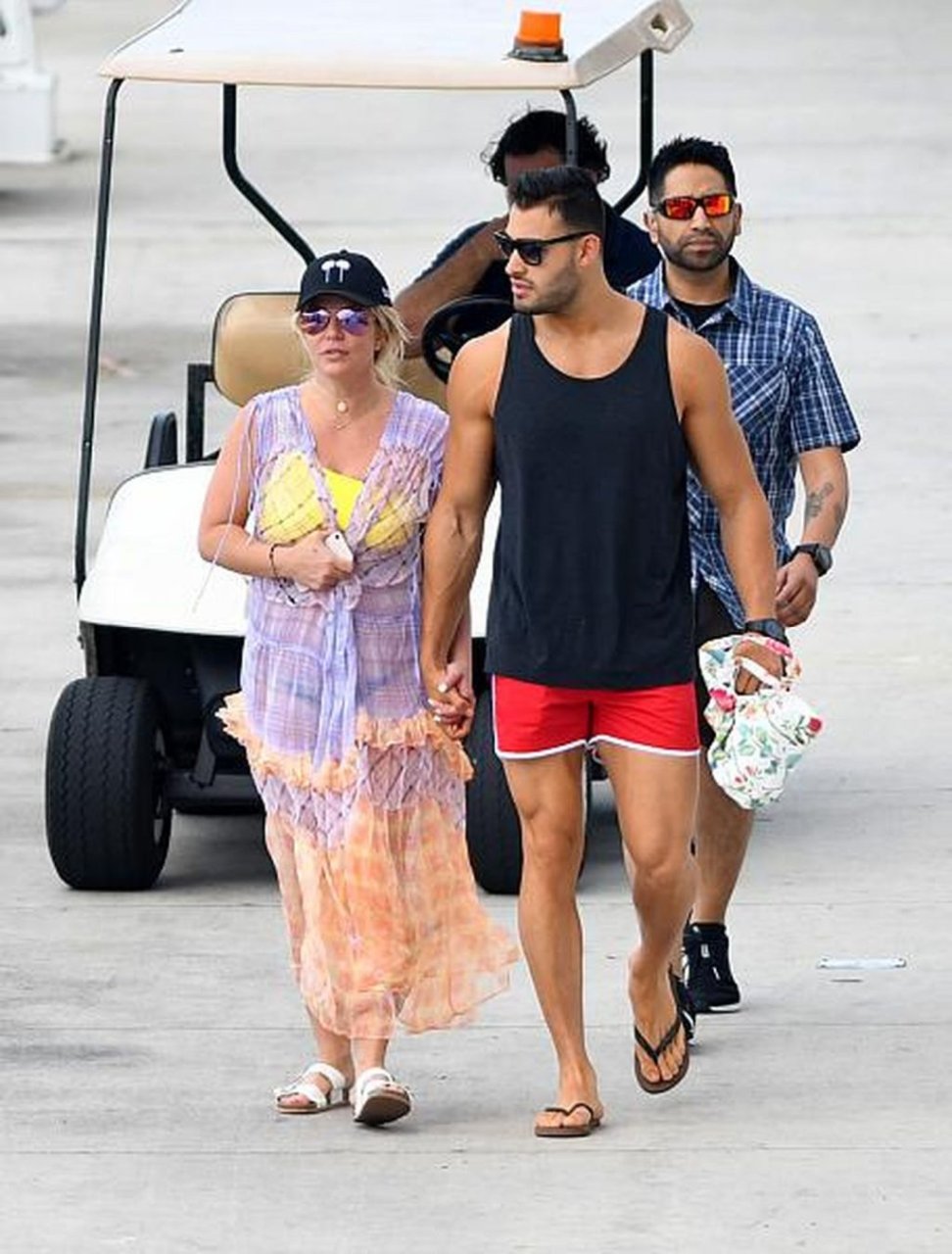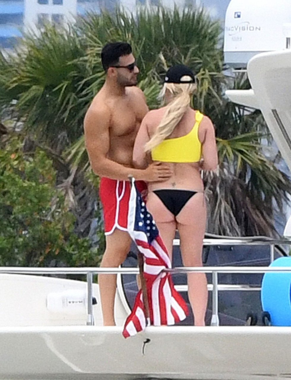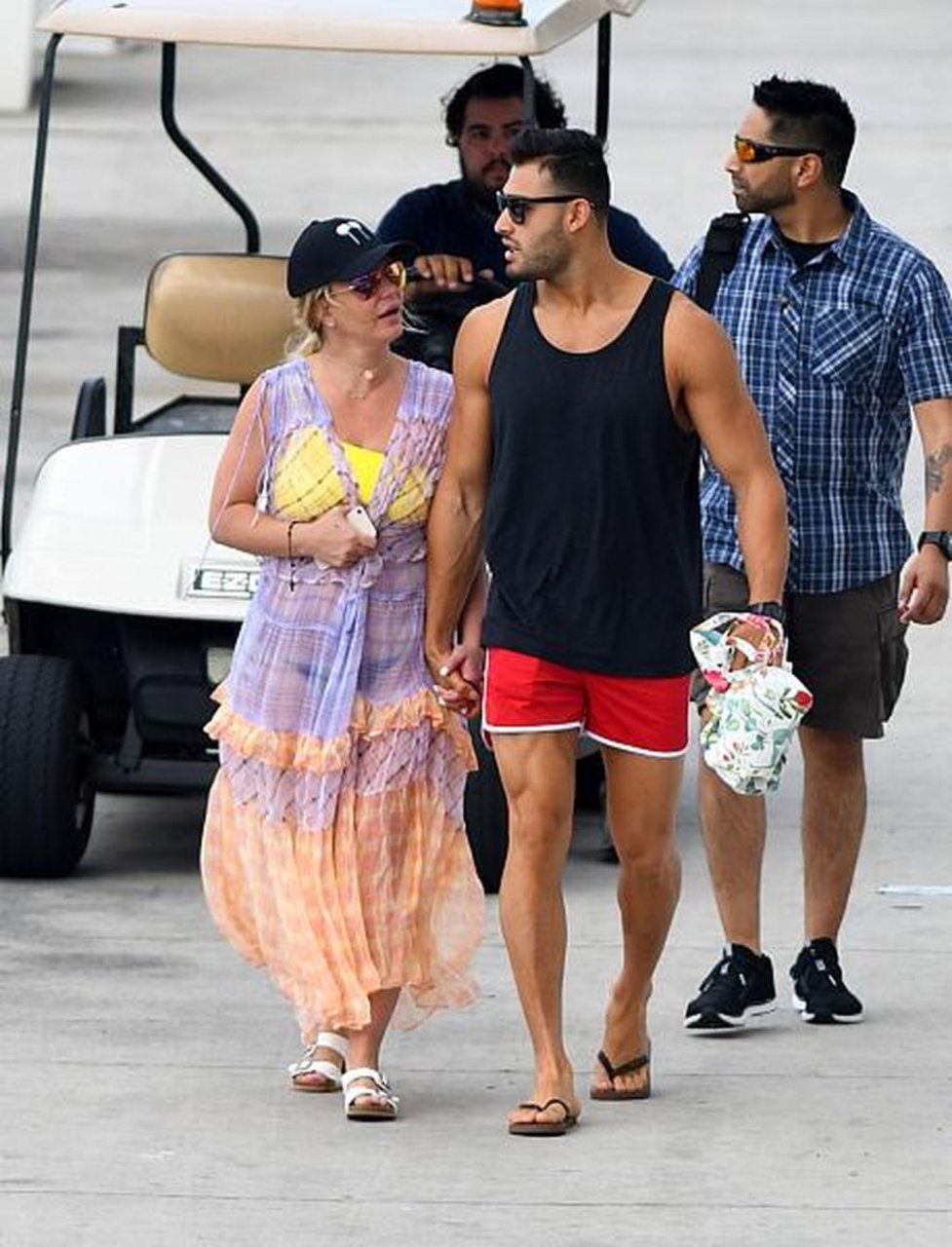 Britney Spears носит желтый бикини, проводя насыщенный событиями день на яхте с бойфрендом Сэмом Асгари в Майами, 06/08/2019.