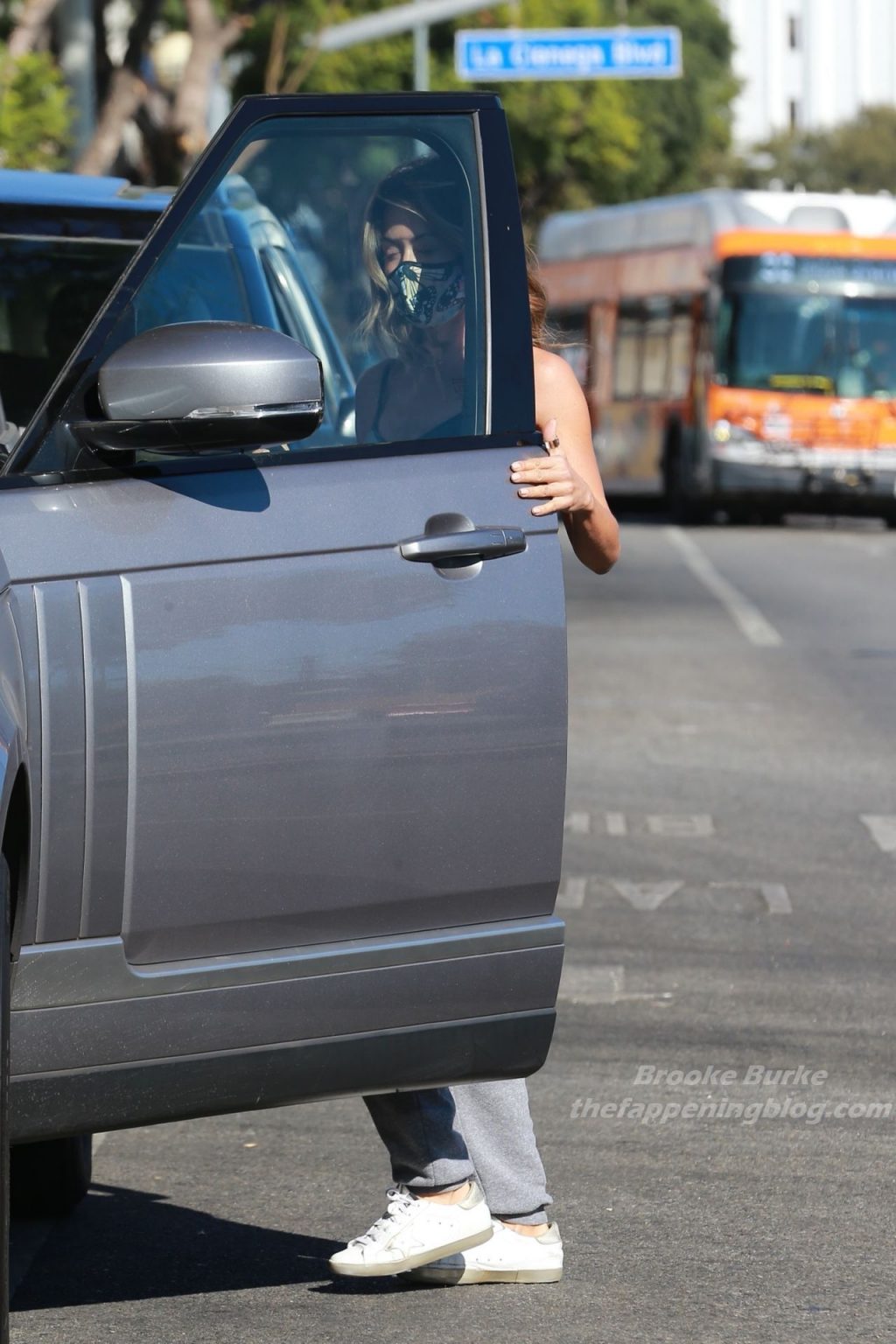 Брук Берк (49) завершает очередную тренировку в Вест-Голливуде, 11.11.2020. Она была в прозрачном купальнике с серыми леггинсами сверху.