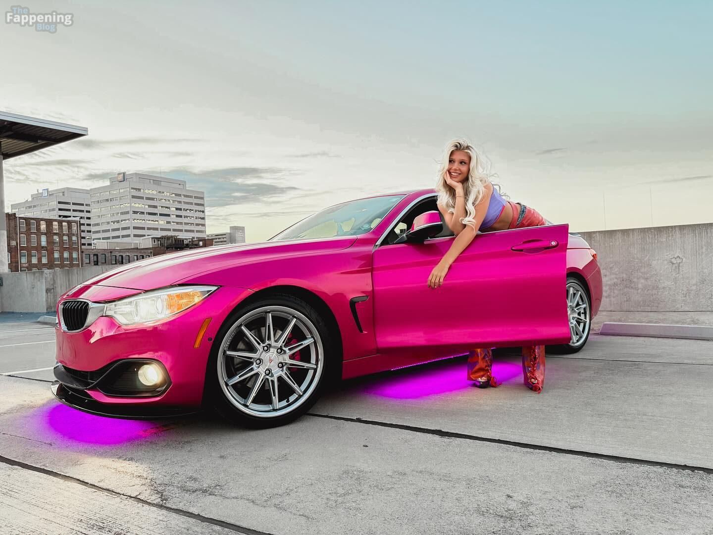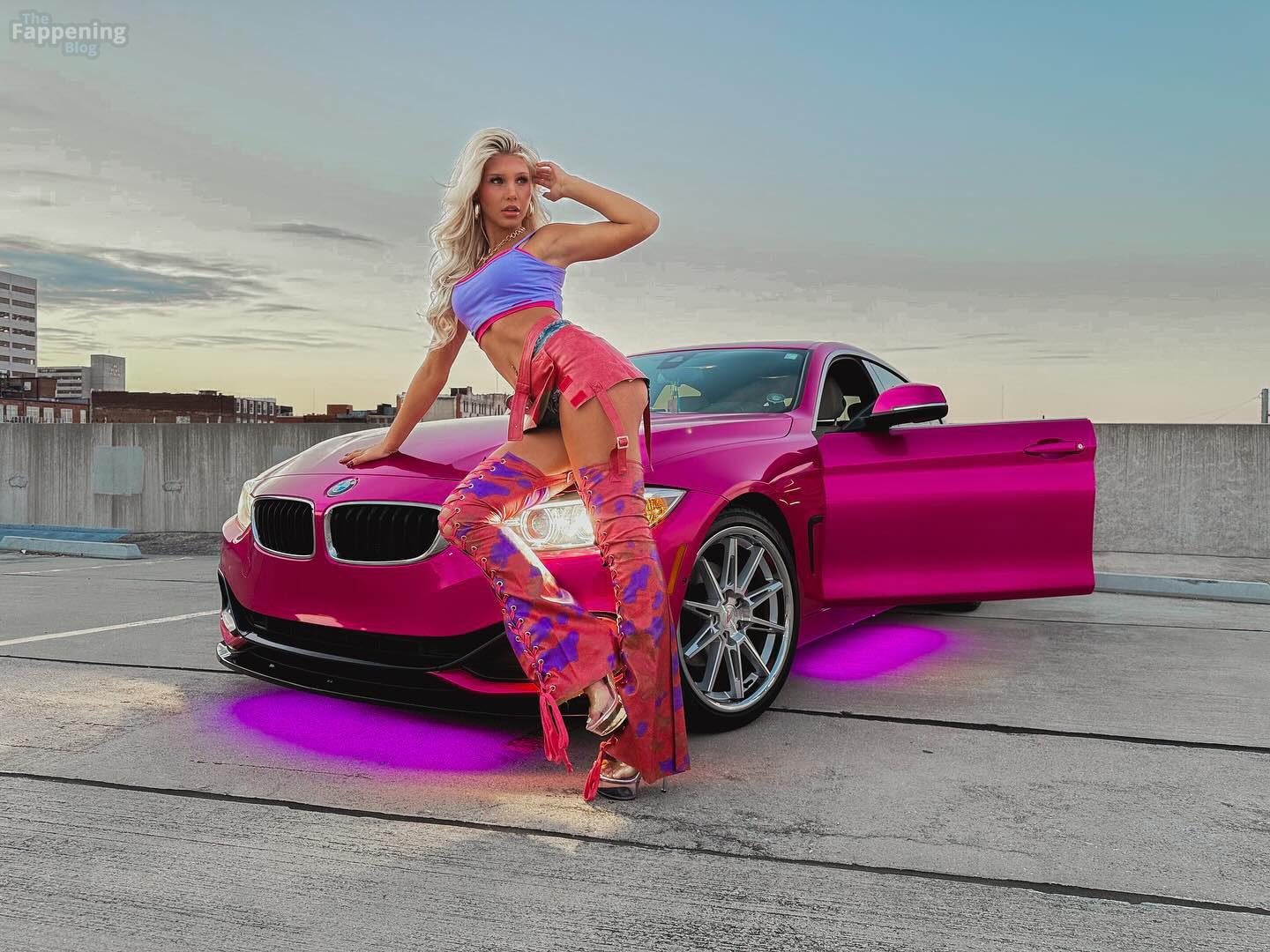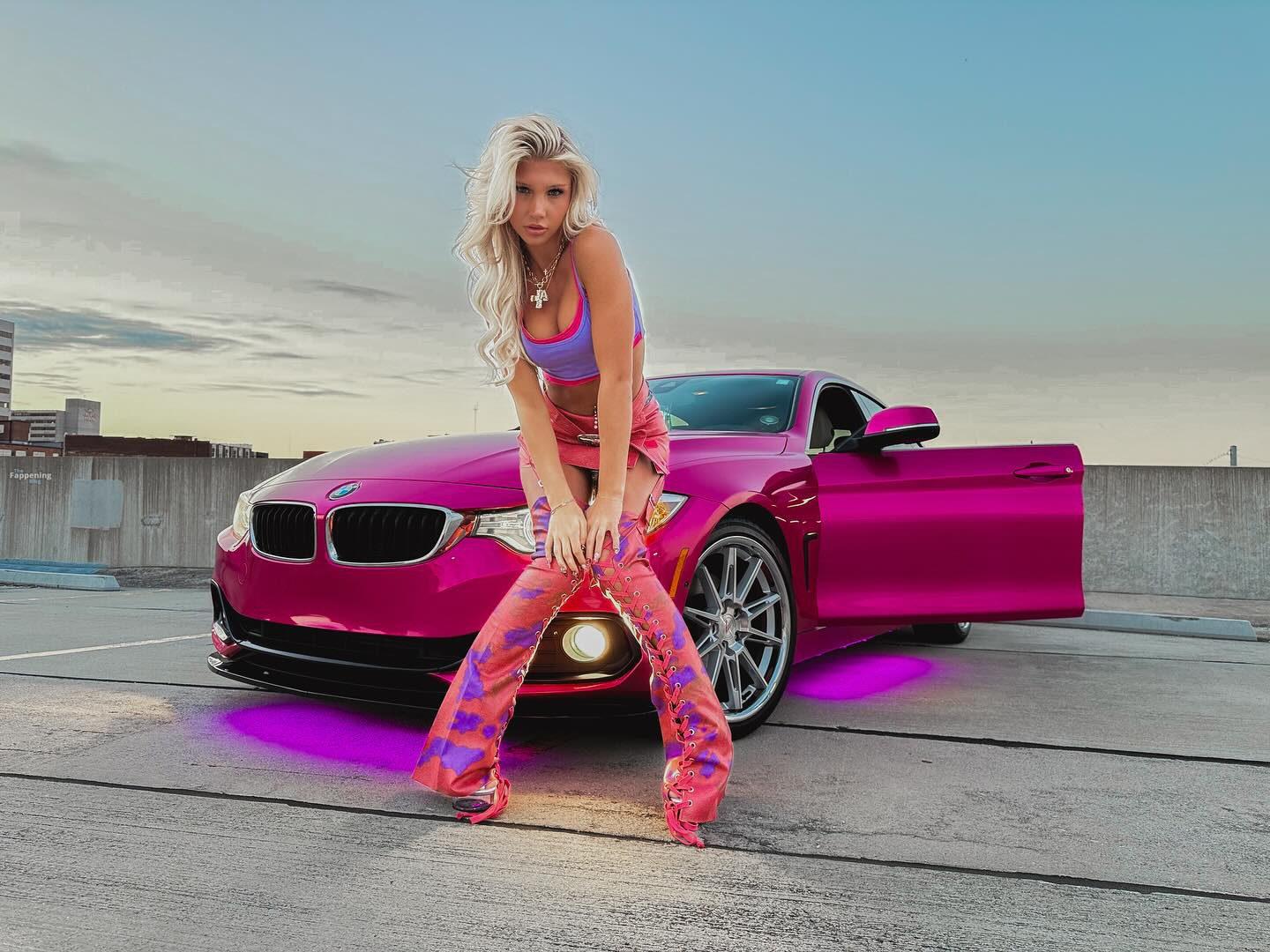 Бруклин Райли блистала на съемке на крыше, в ярком кроп-топе, мини-юбке и ботинках рядом с ярко-розовым BMW.