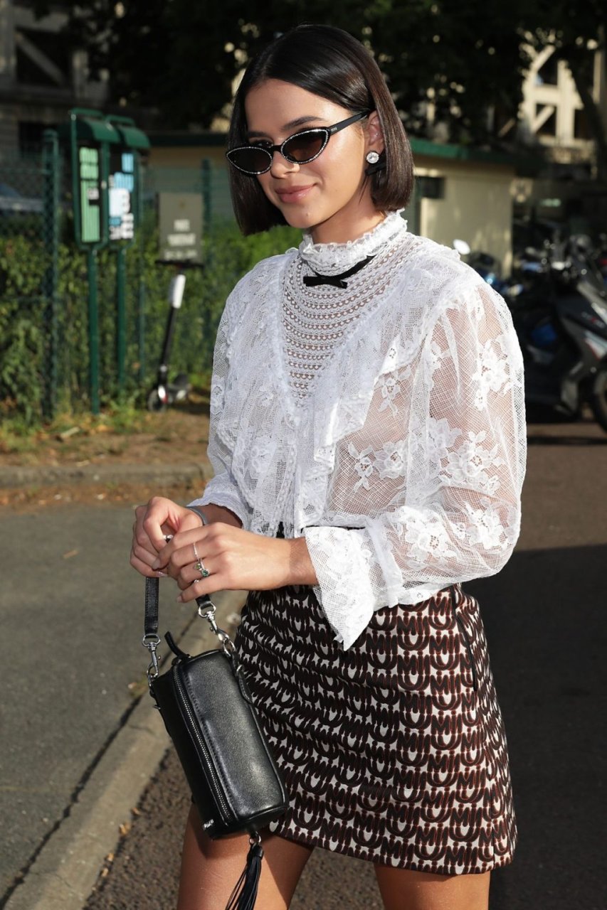 Длинноногая модель Бруна Маркезине была замечена в прозрачной белой блузке, через которую просвечивала ее сосок, покидая показ Miu Miu Resort 2020 во время Недели высокой моды в Париже, 29.06.2019.