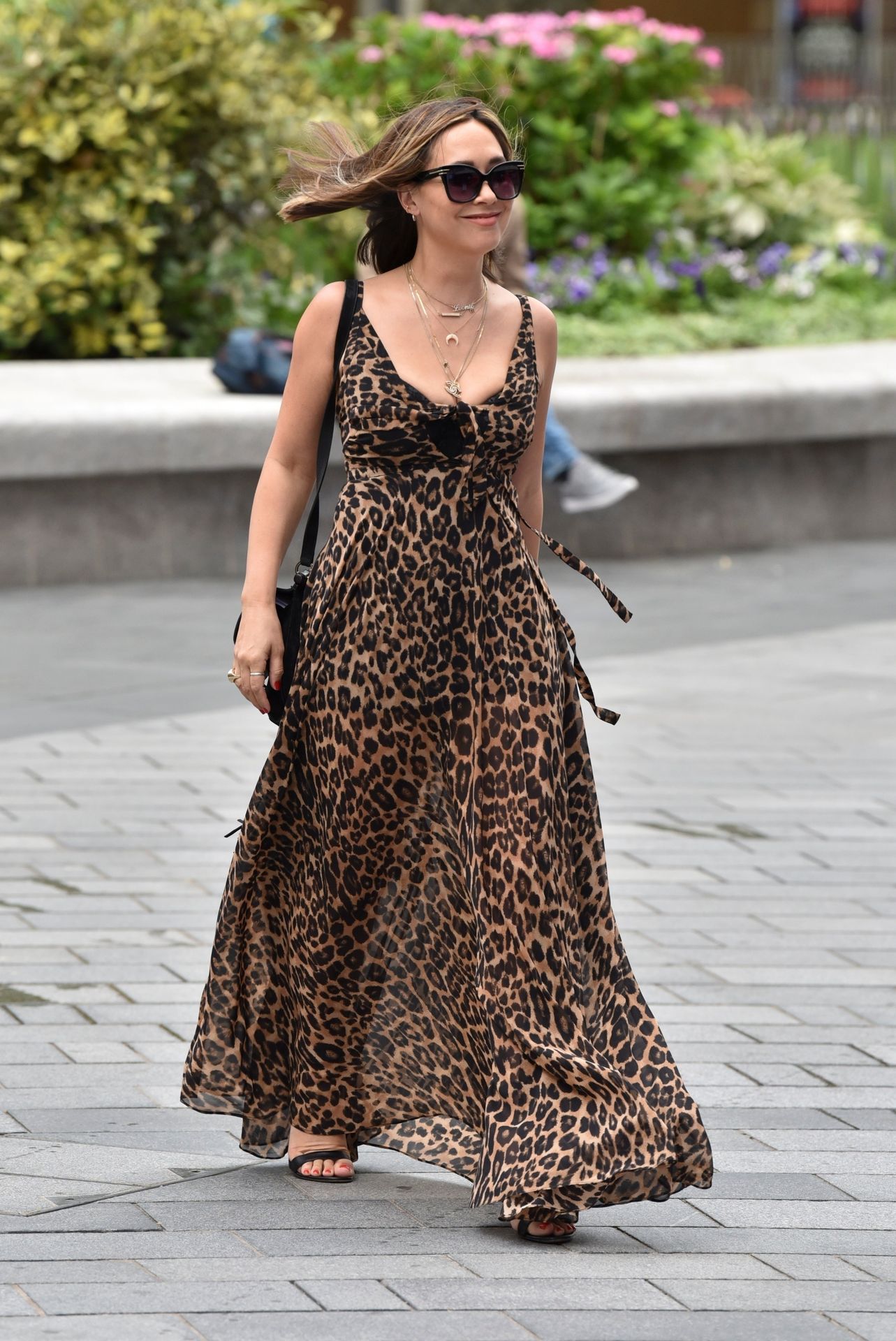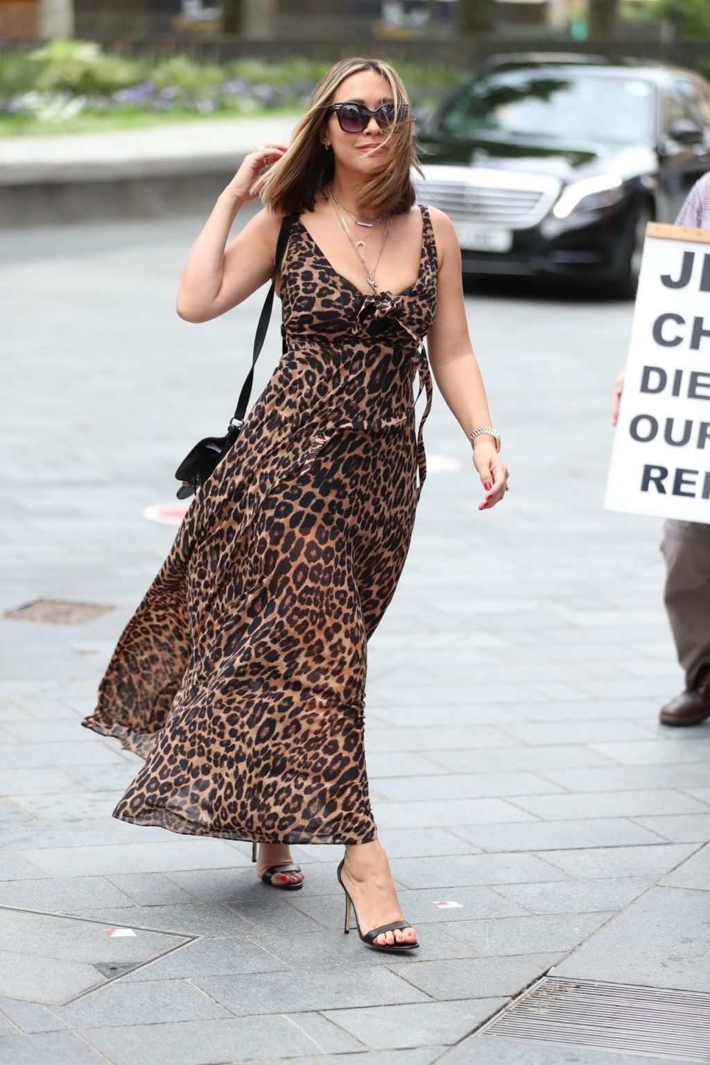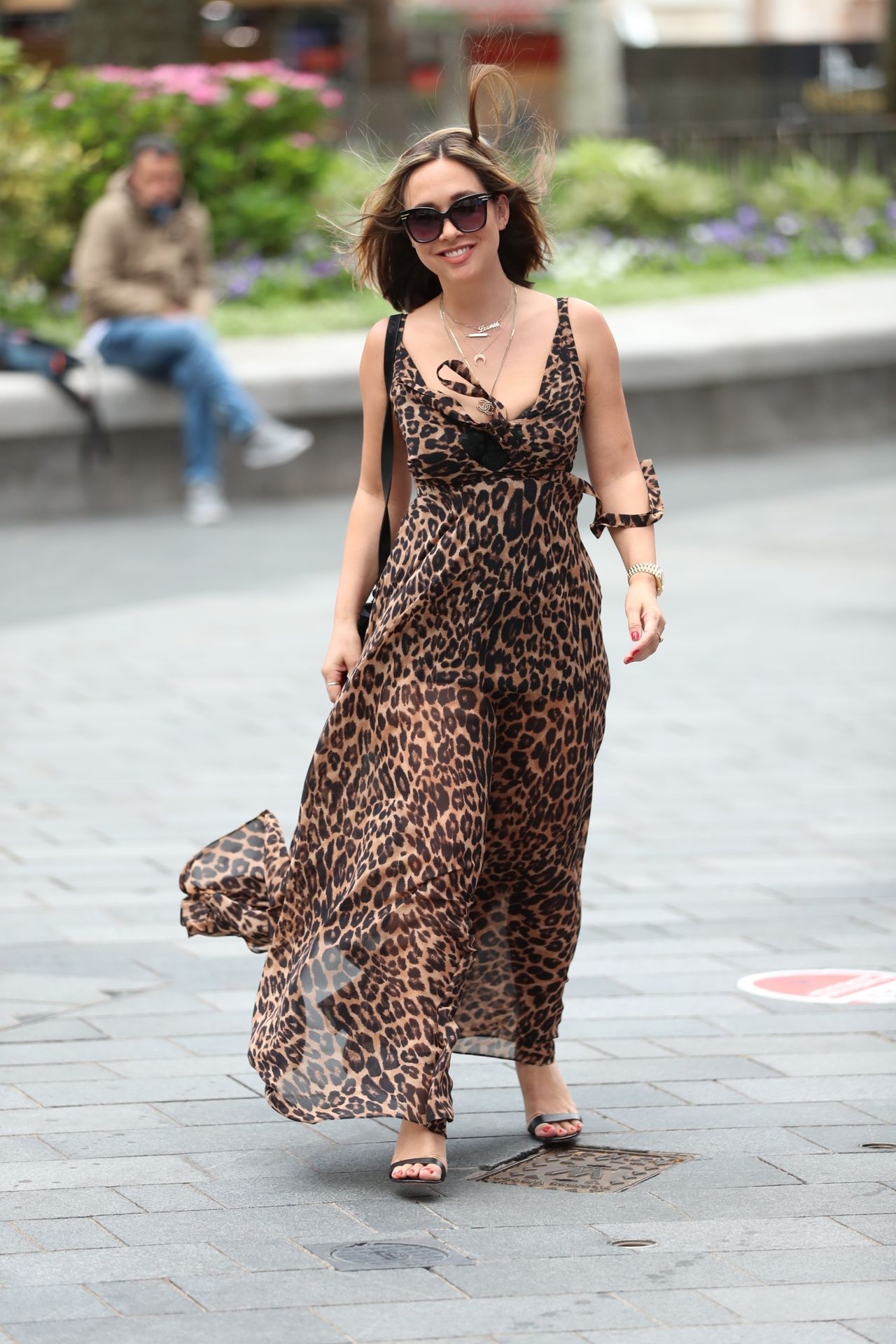 Майлин Класс приходит на Smooth Radio с новыми светлыми волосами в леопардовом платье с глубоким вырезом в Лондоне, 07/06/2020.