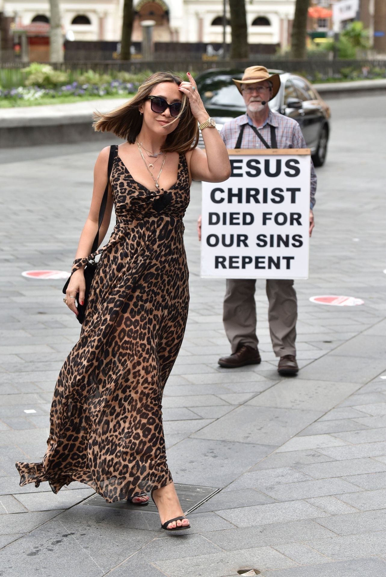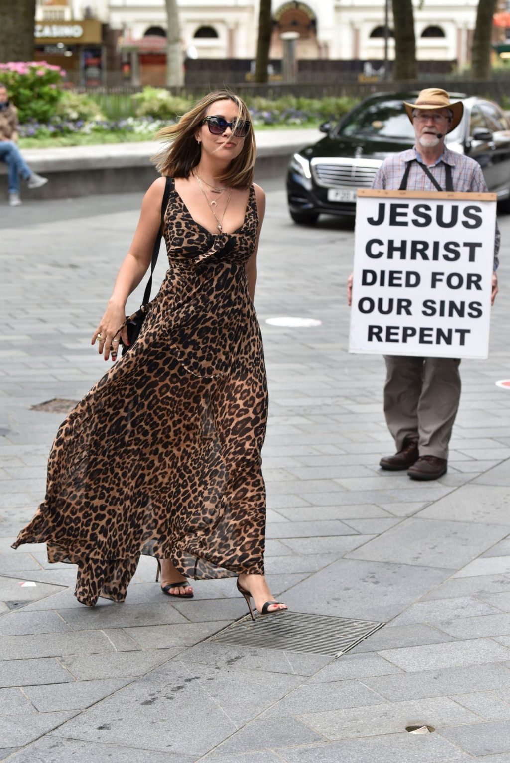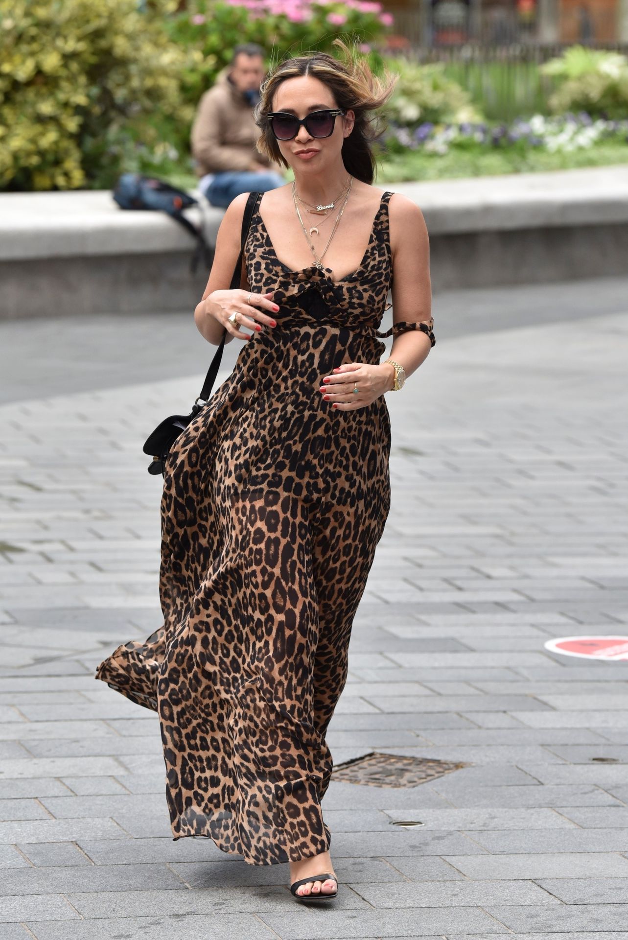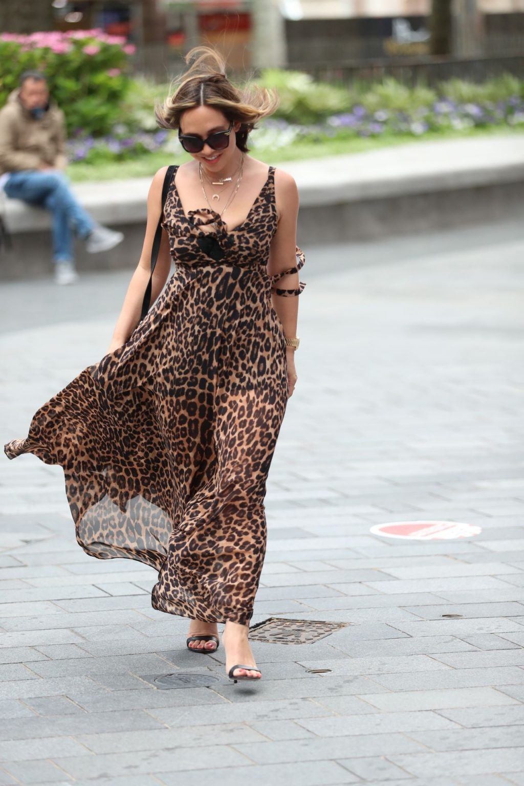 Майлин Класс приходит на Smooth Radio с новыми светлыми волосами в леопардовом платье с глубоким вырезом в Лондоне, 07/06/2020.