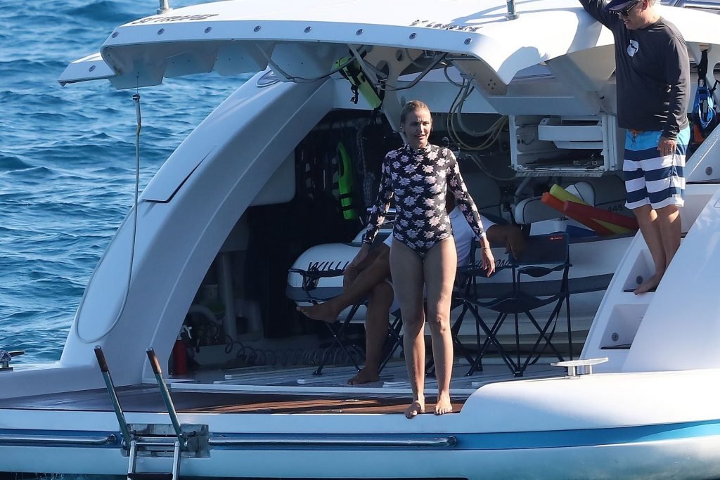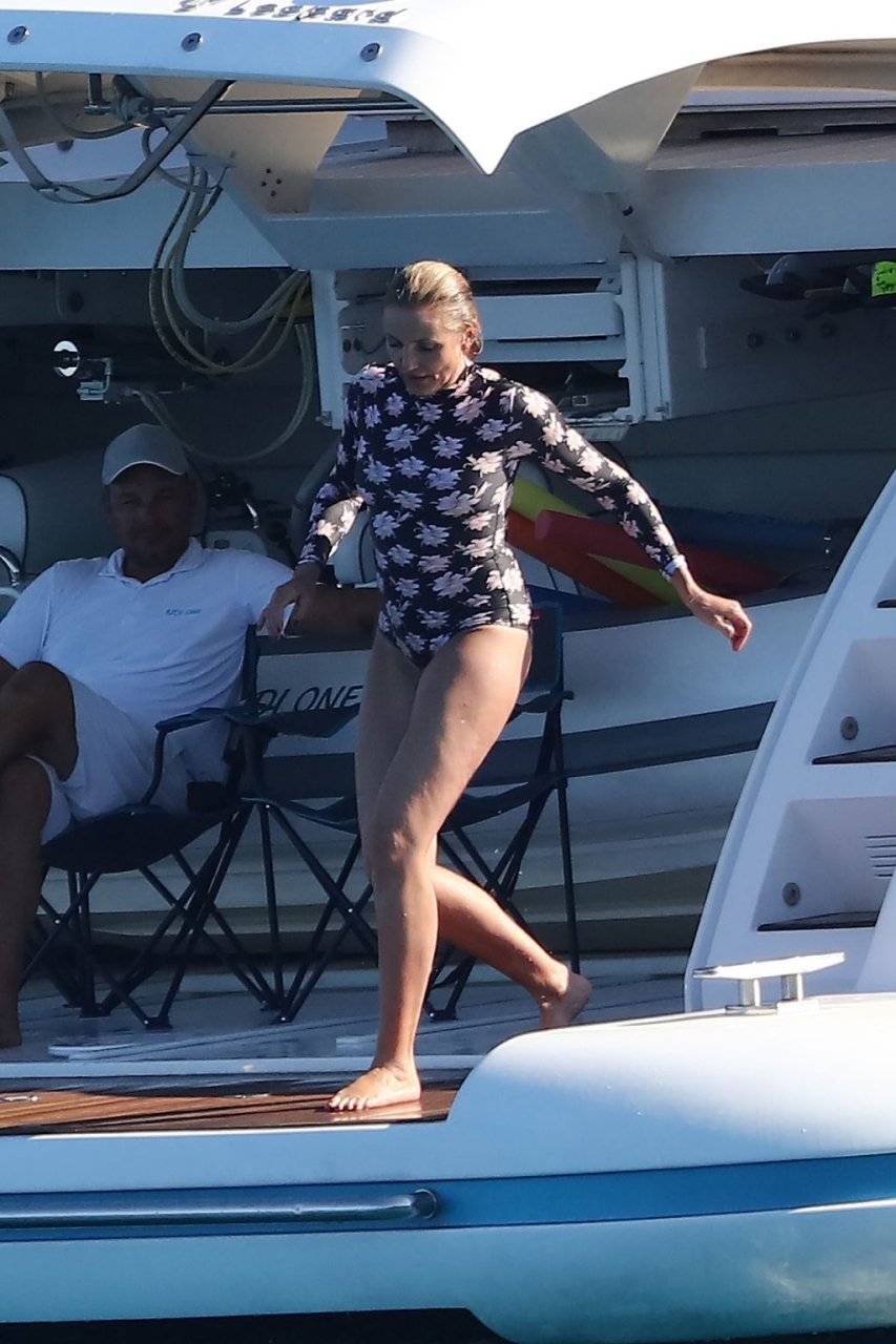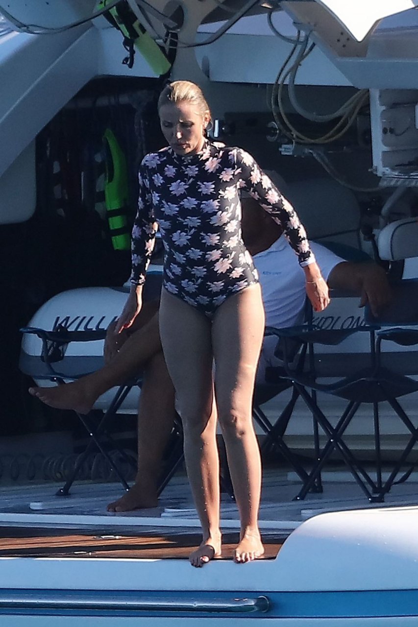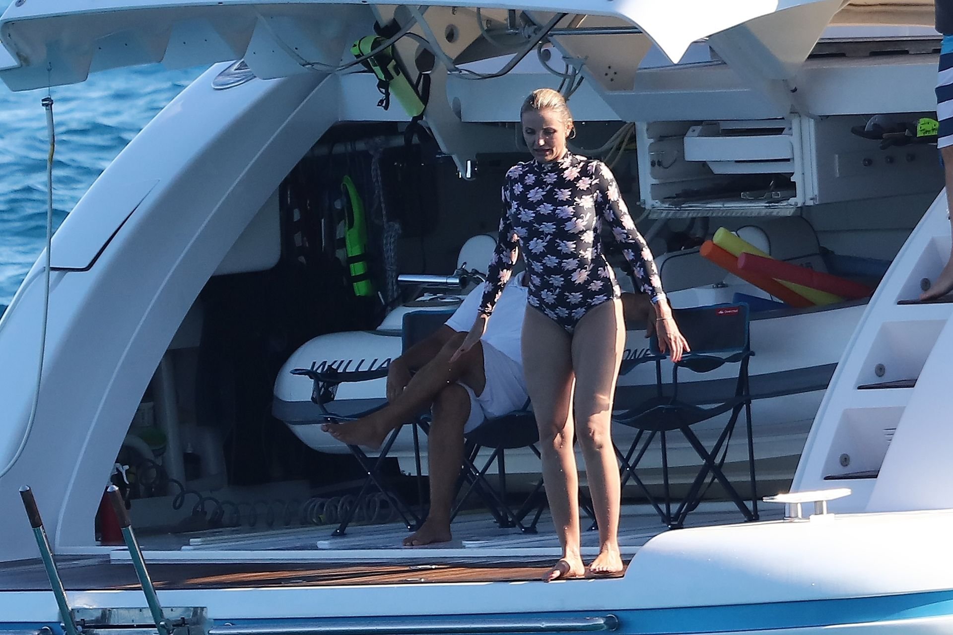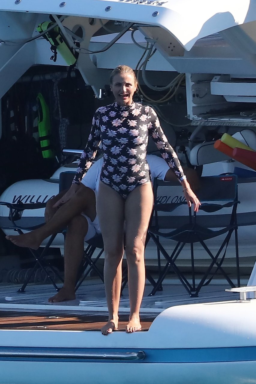 Камерон Диас и её муж Бенджи Мэдден наслаждаются отпуском в Сен-Тропе, 08.08.2019. Звезда “Ангелов Чарли” была замечена, как ныряла в Средиземное море в цветочном цельном купальнике, который подчёркивал её фантастическую фигуру.