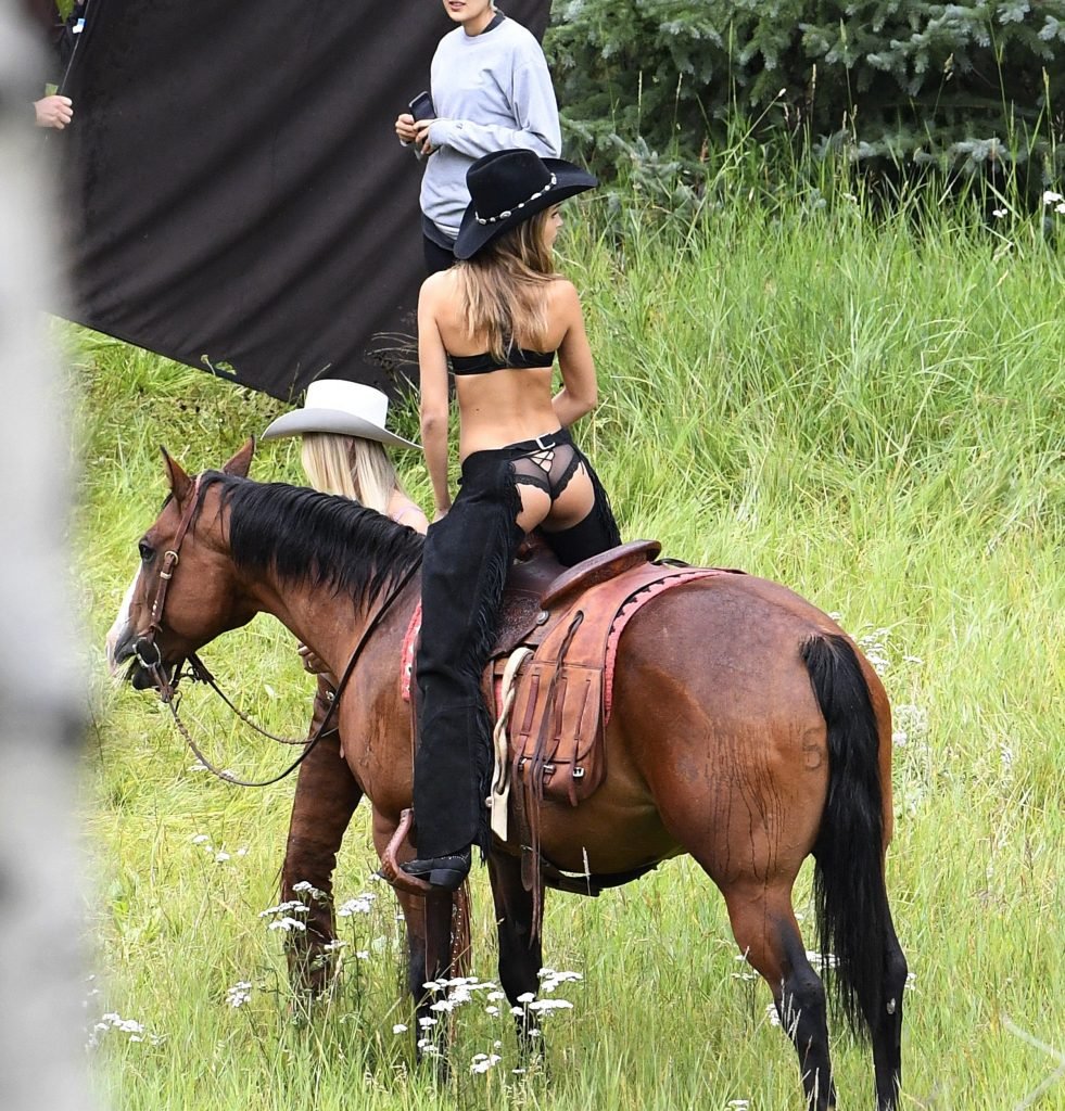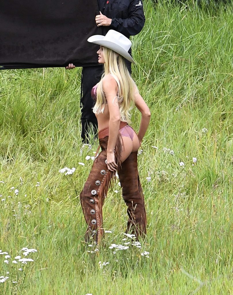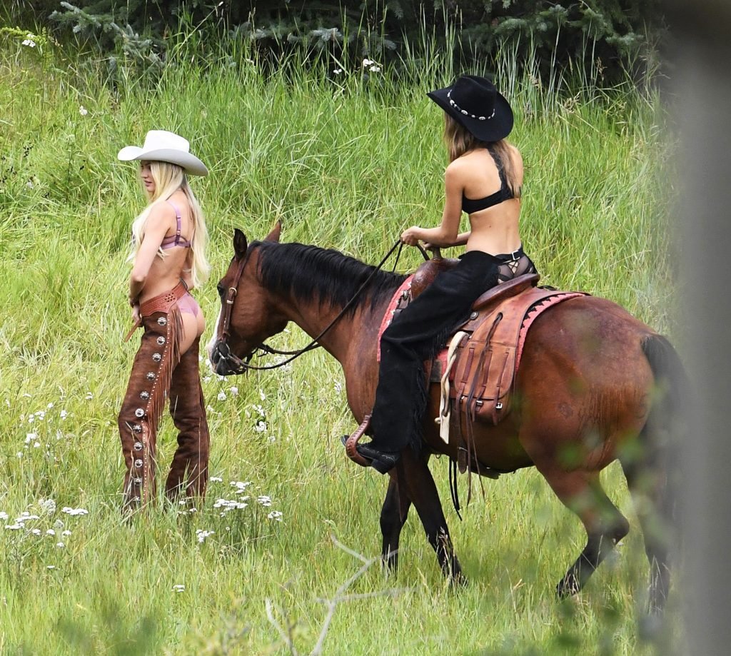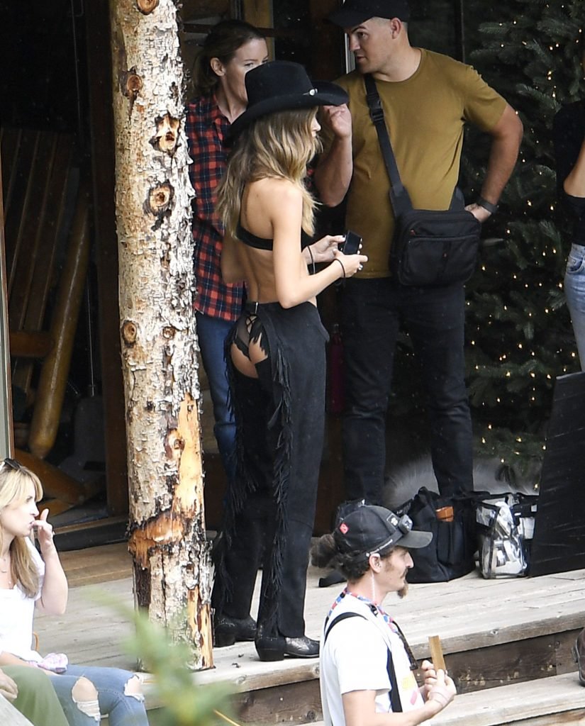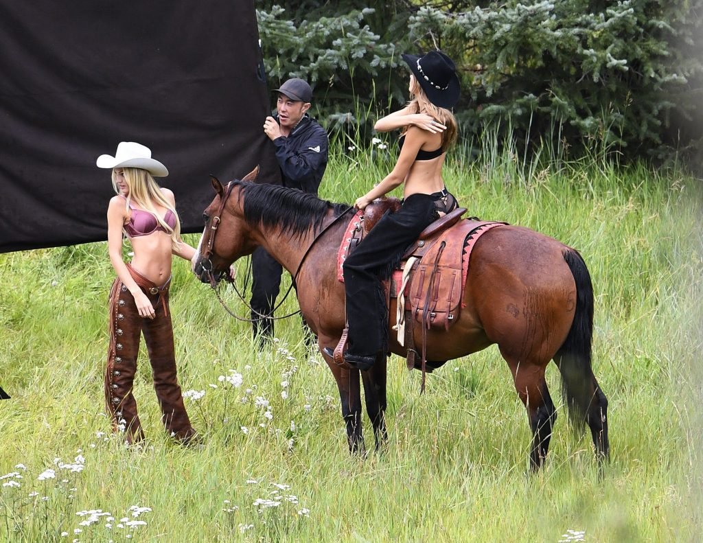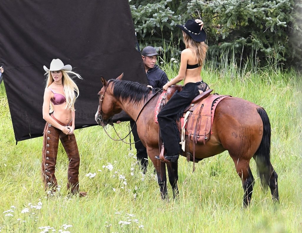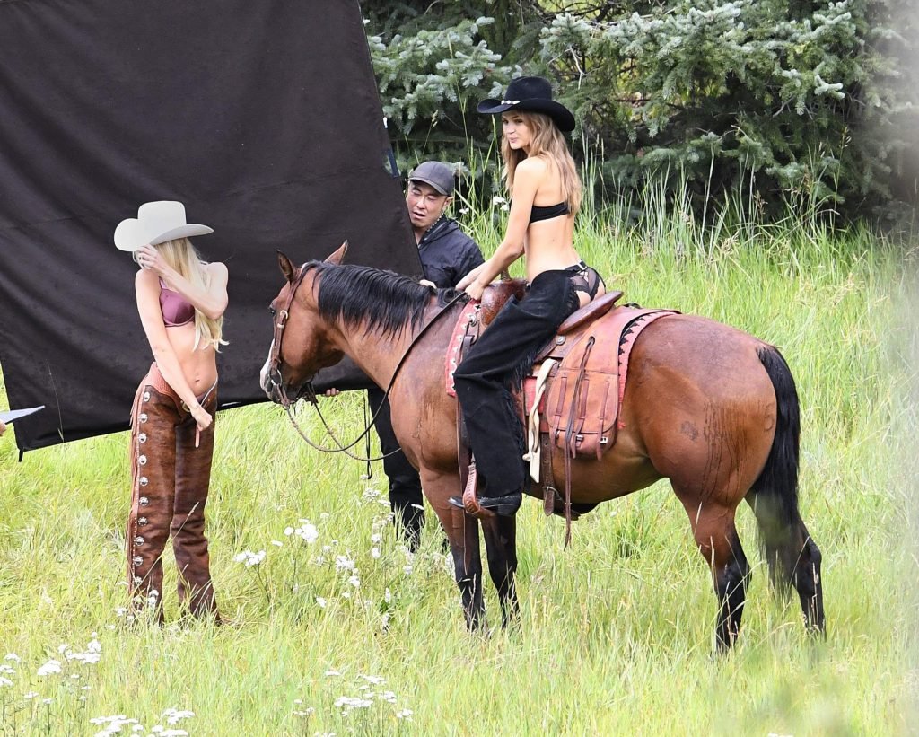Супермодели Кэндис Свейнпол и Джозефин Скривер были замечены в сексуальных ковбойских нарядах во время съемок предстоящего праздничного каталога Victoria’s Secret в Аспене, 15.08.2017.
