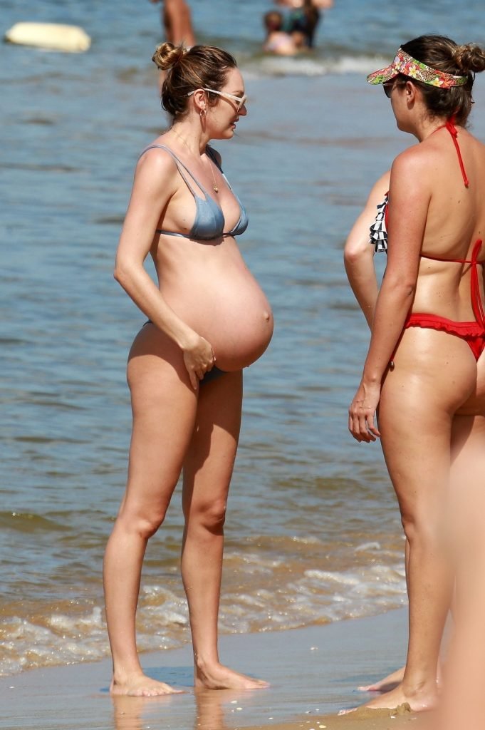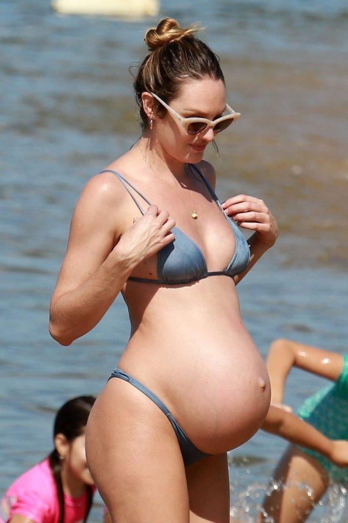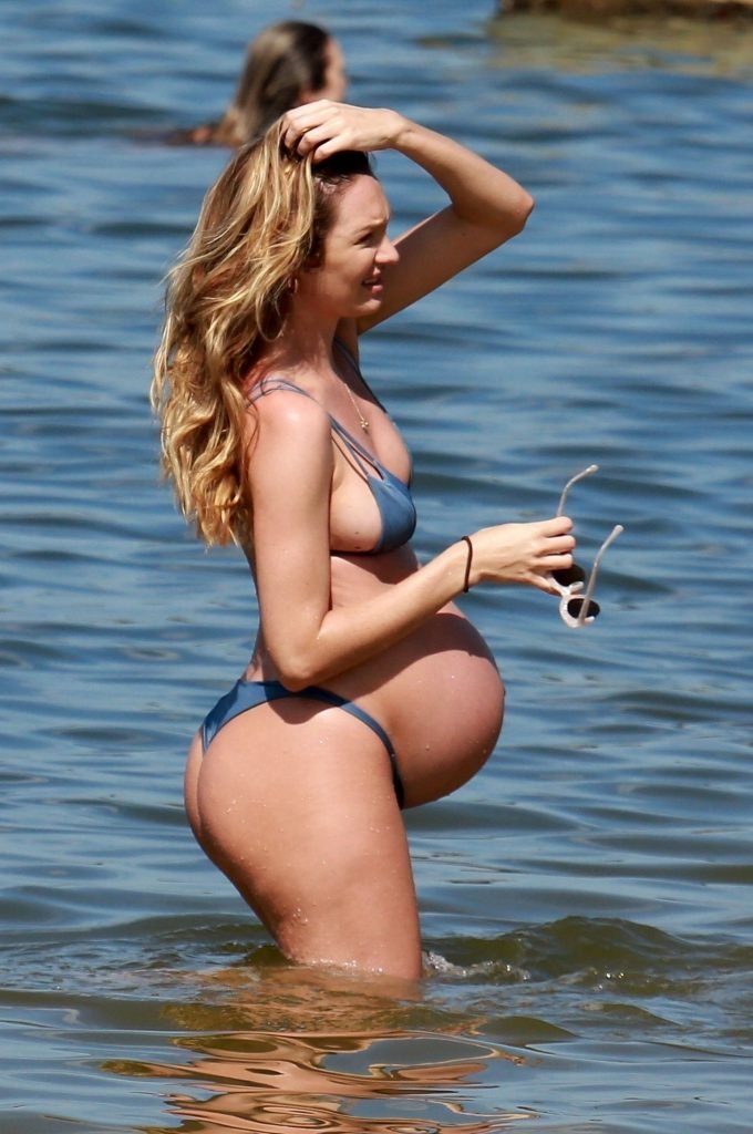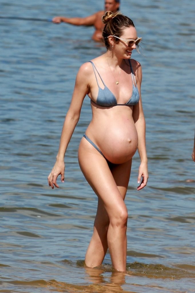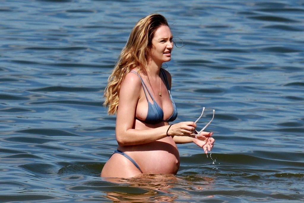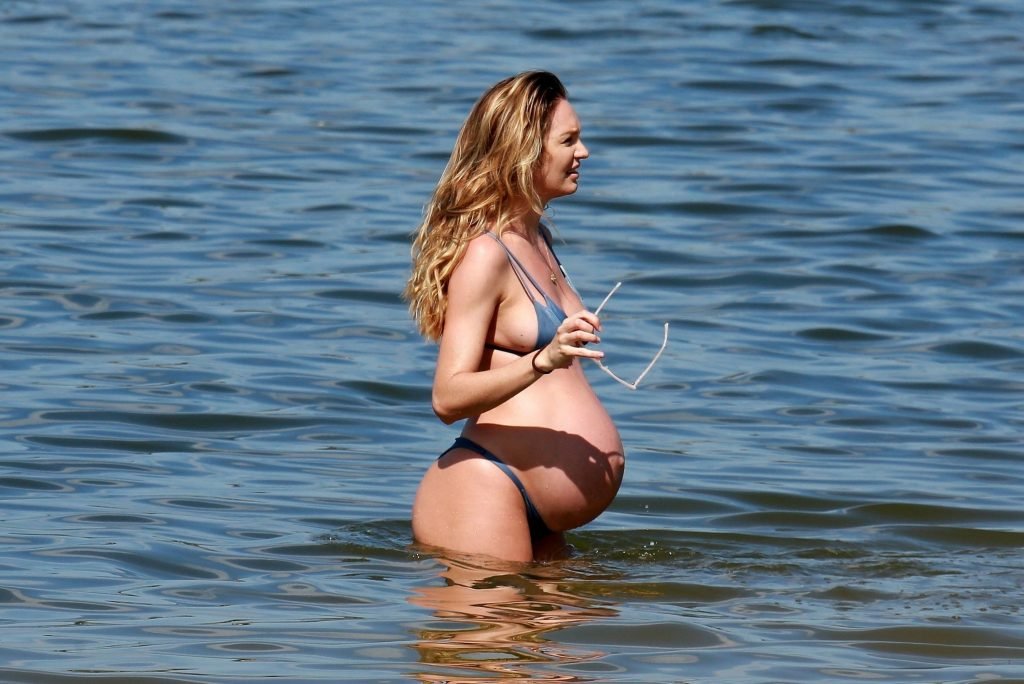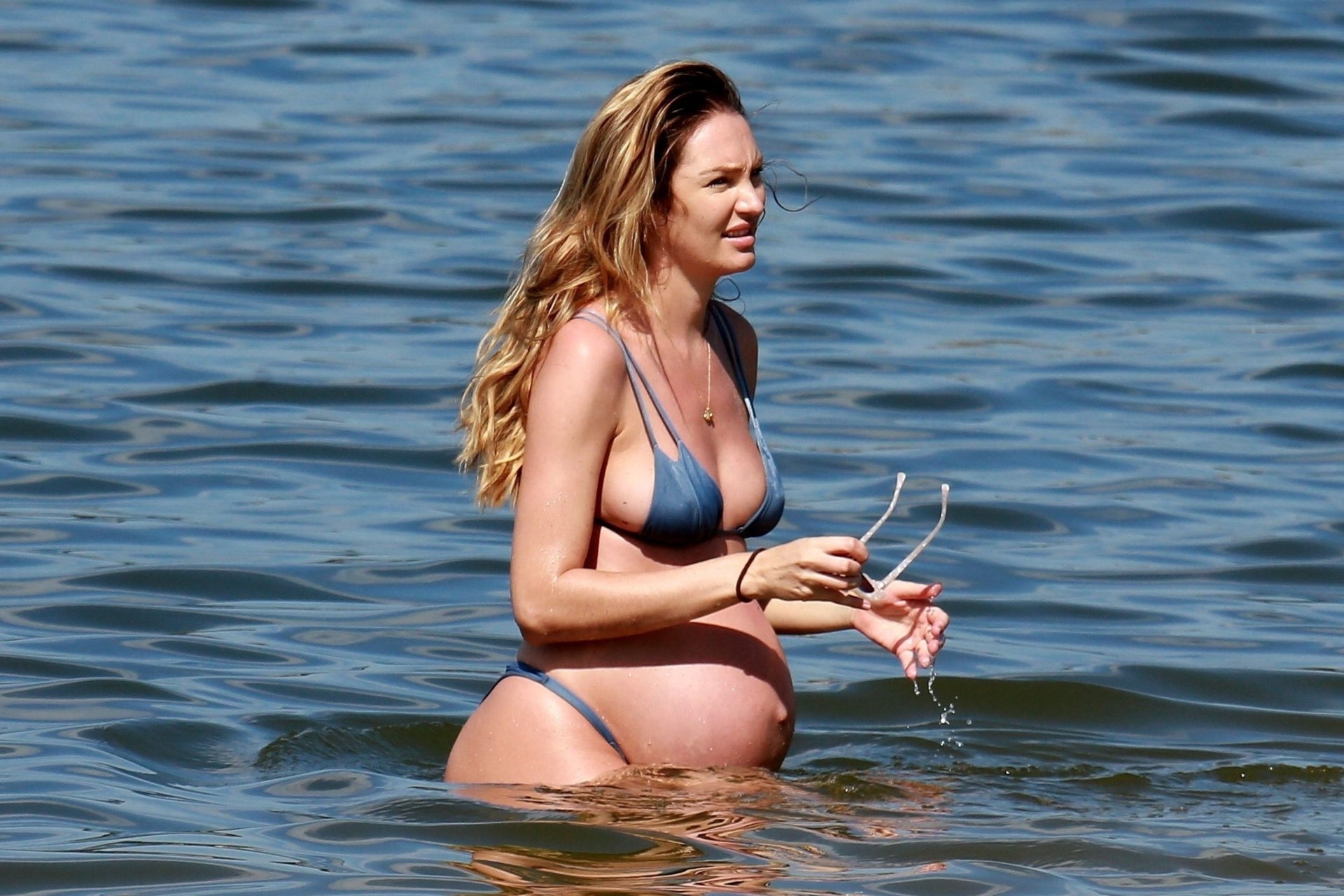 Кэндис Свейнпол выглядит так, будто готова вот-вот родить, наслаждаясь днем на пляже с семьей, включая сына Анакан и партнера Германа Николли, 06.05.2018. 29-летняя ангел Victoria’s Secret с гордостью демонстрировала свой большой живот в красно-белом купальнике в горошек, поглаживая живот, отдыхая и общаясь с друзьями.