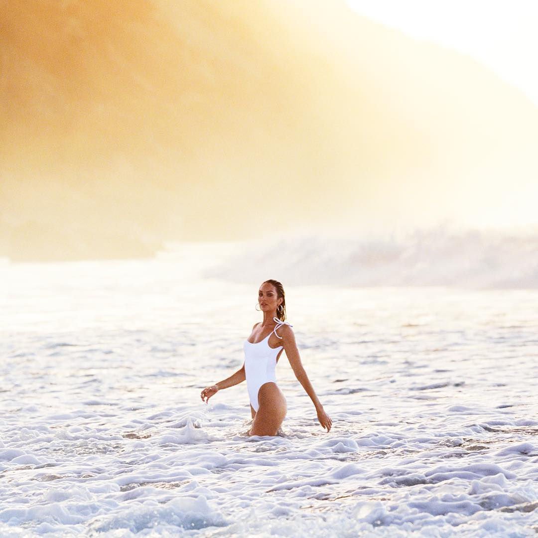 Супермодель Кэндис Свейнпол, 29 лет, позирует в белом купальнике для промо-фотосессии на пляже в Бразилии (январь 2018).