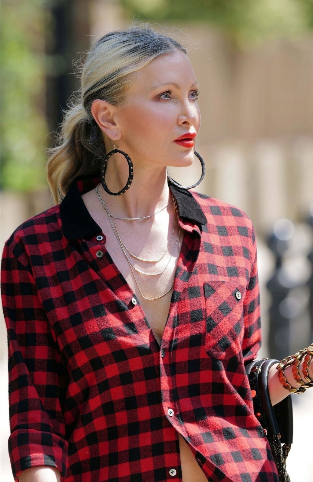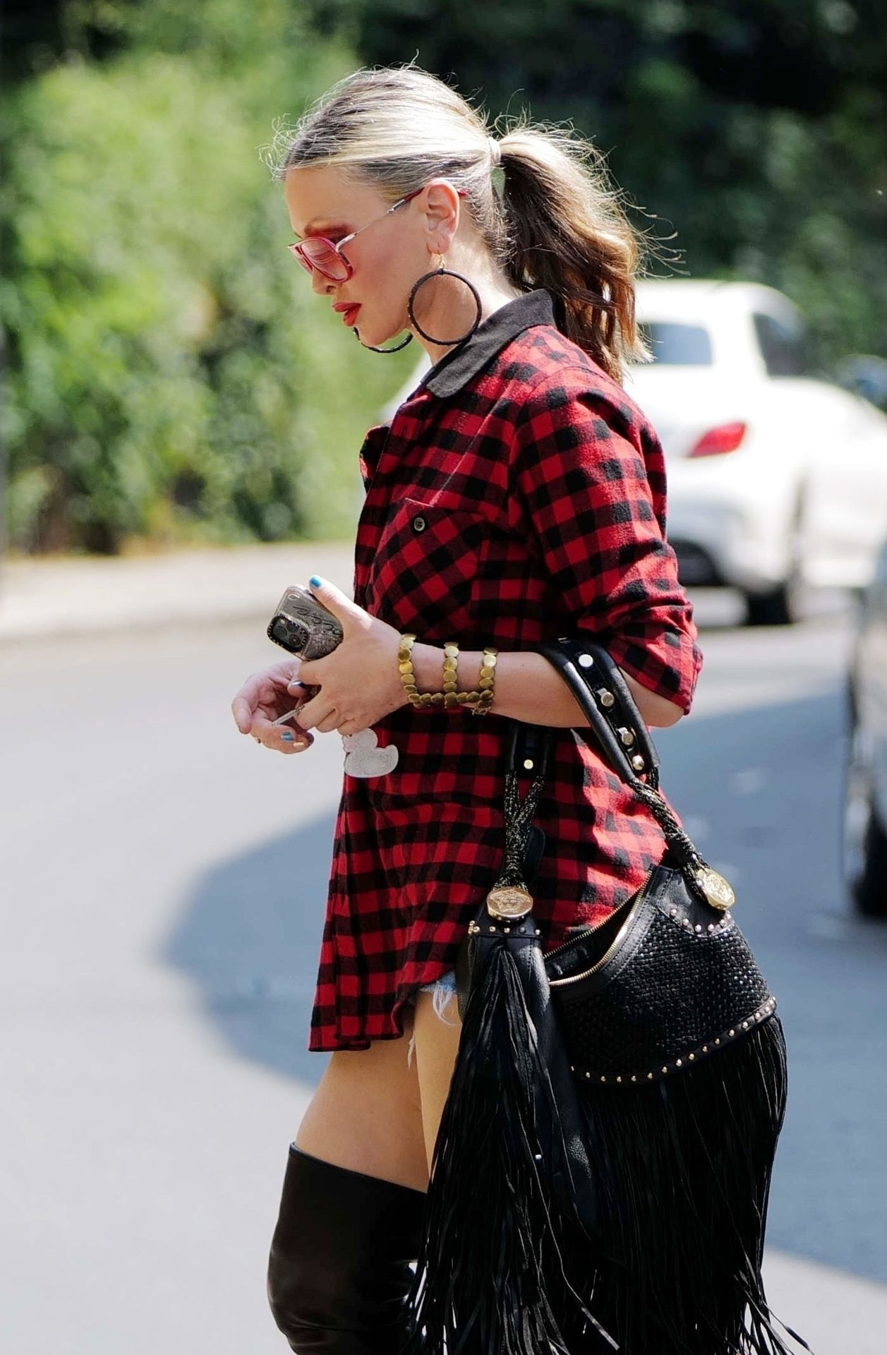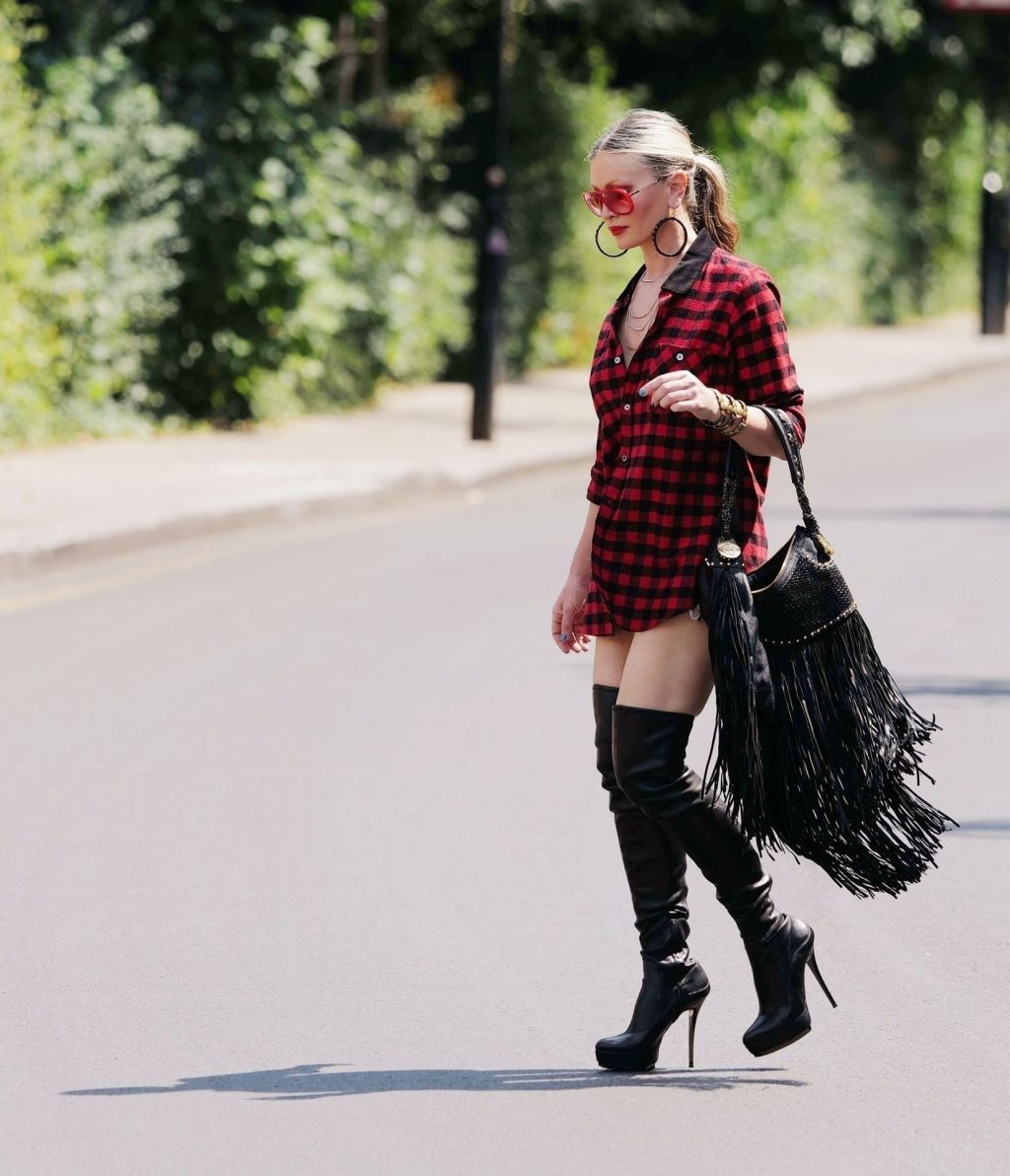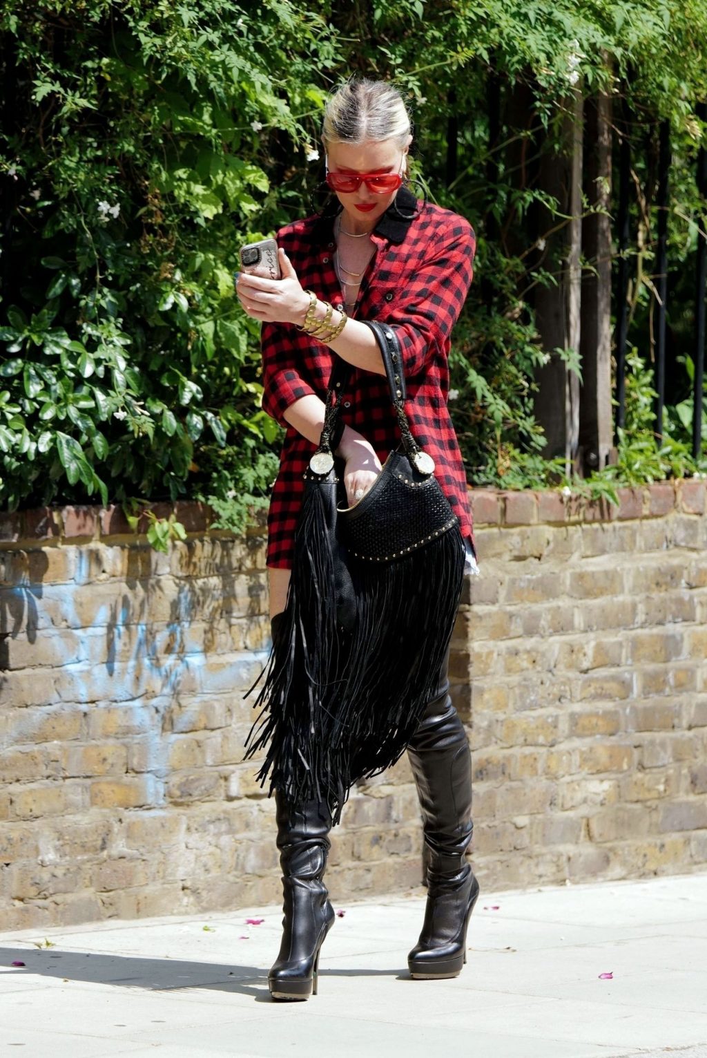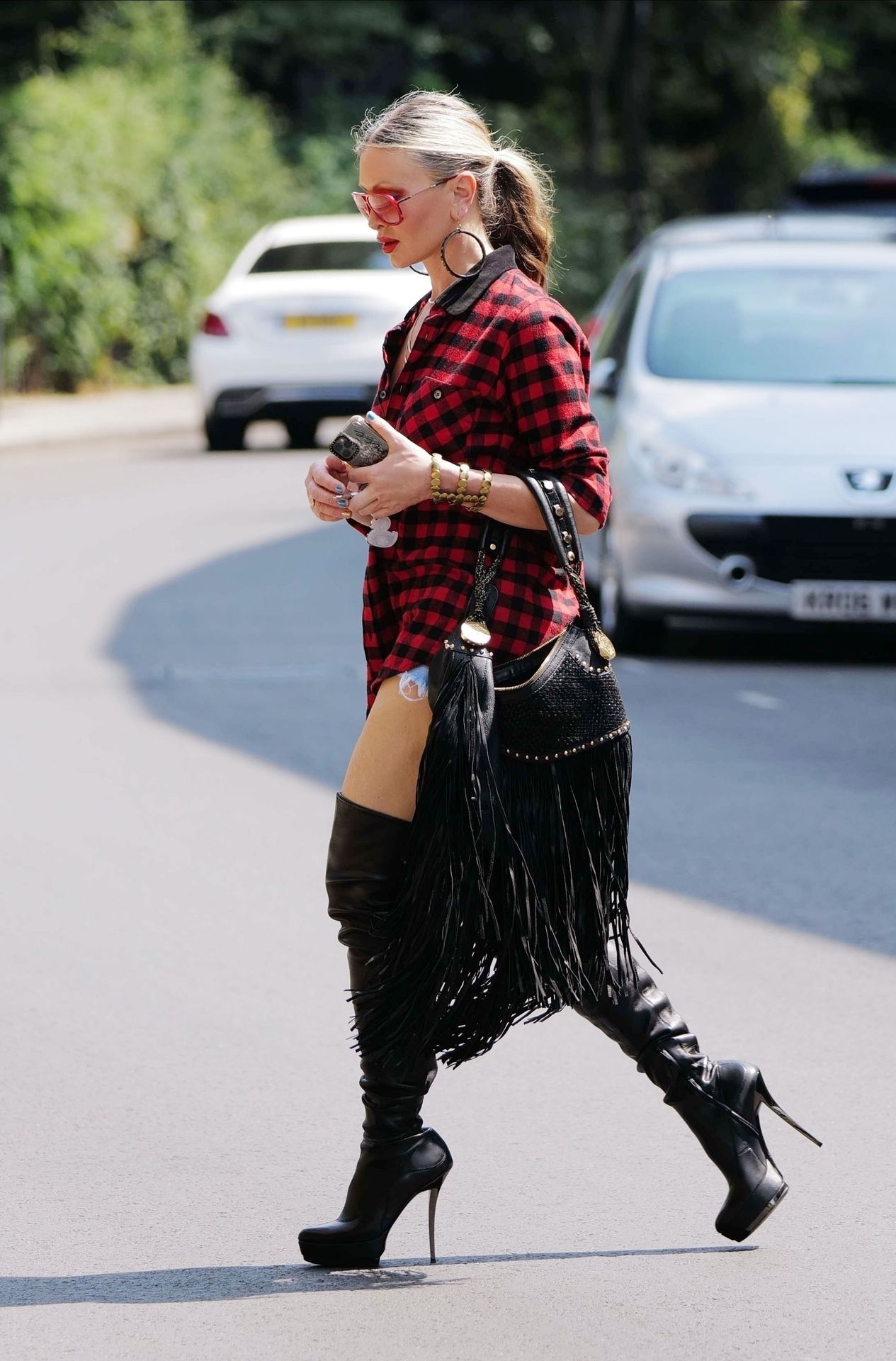 Модель Каприс Буррет демонстрирует свою сексуальную фигуру в ботфортах выше колена и оголяет живот, прыгая в такси по пути на обед в Западном Лондоне, 23.07.2020.