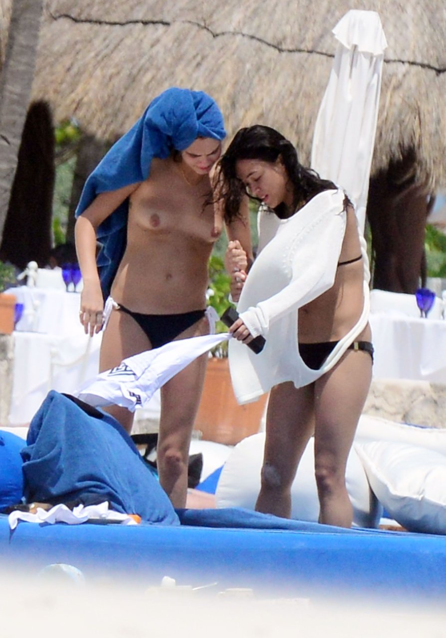 Мишель Родригес и Кара Делевинь обнимаются на пляже, 28.03.2014