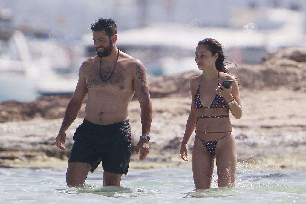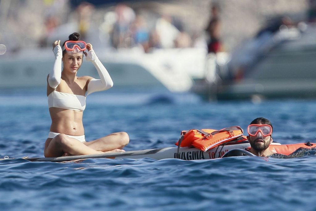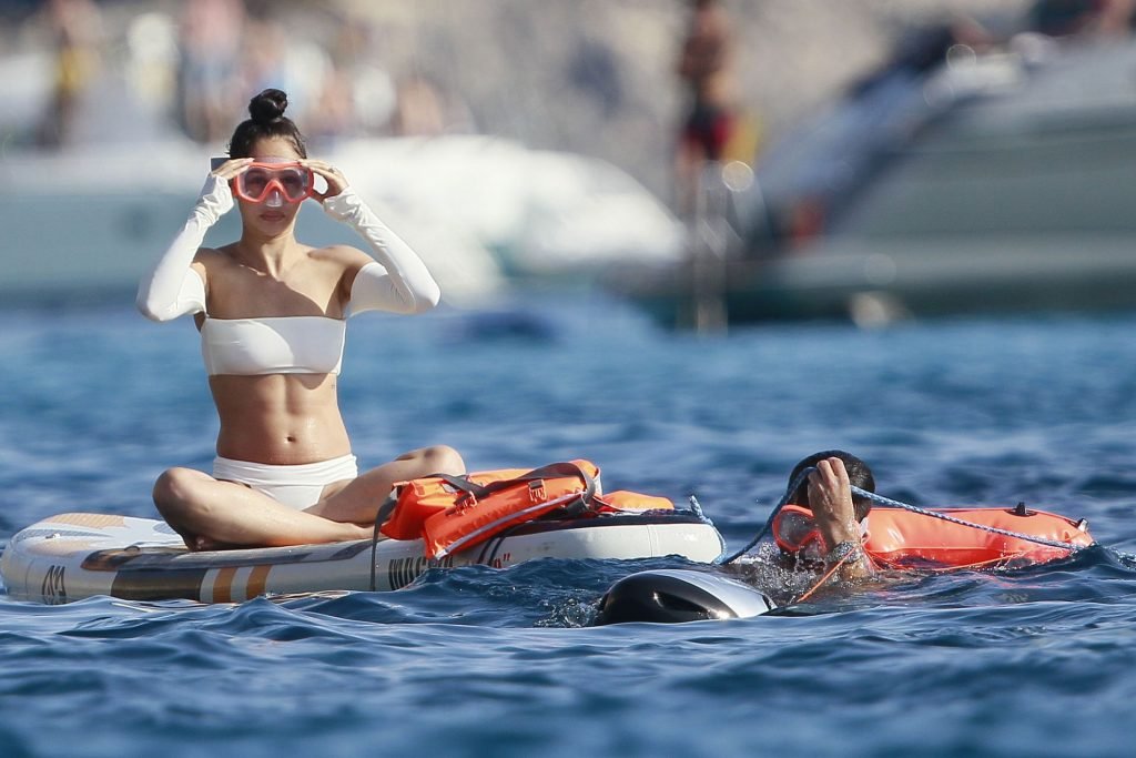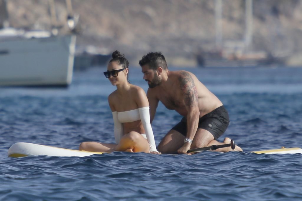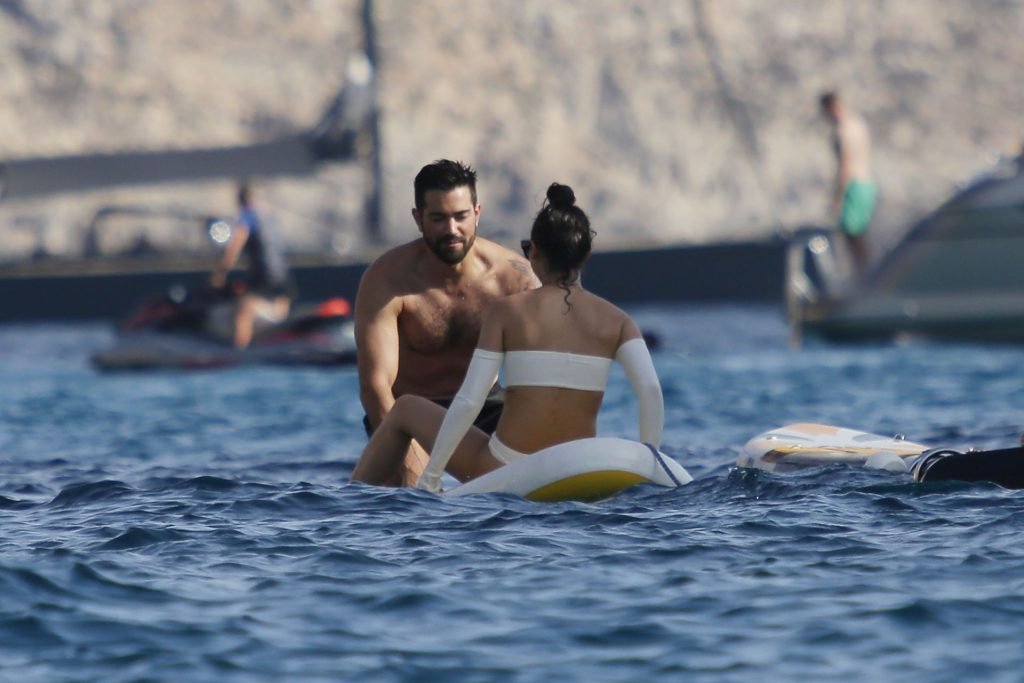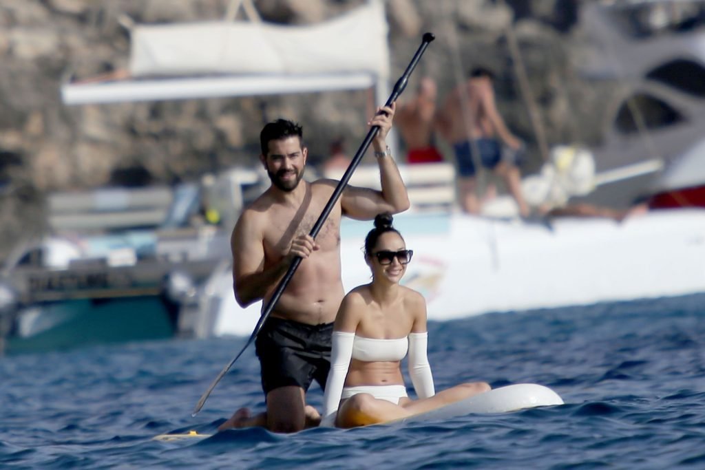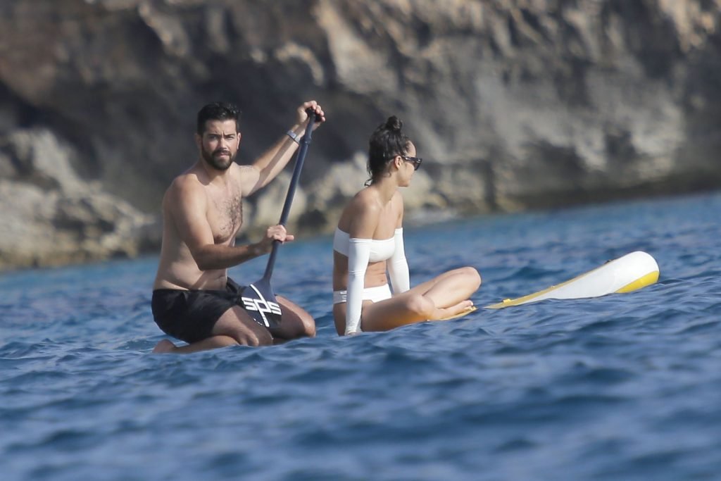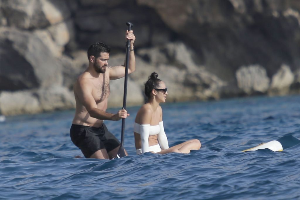 Актриса кино Кара Сантана и Джесси Меткалф вместе занимаются паддлбордингом в конце долгого и расслабленного дня на пляже в Форментере, Испания, 21.07.2019.
