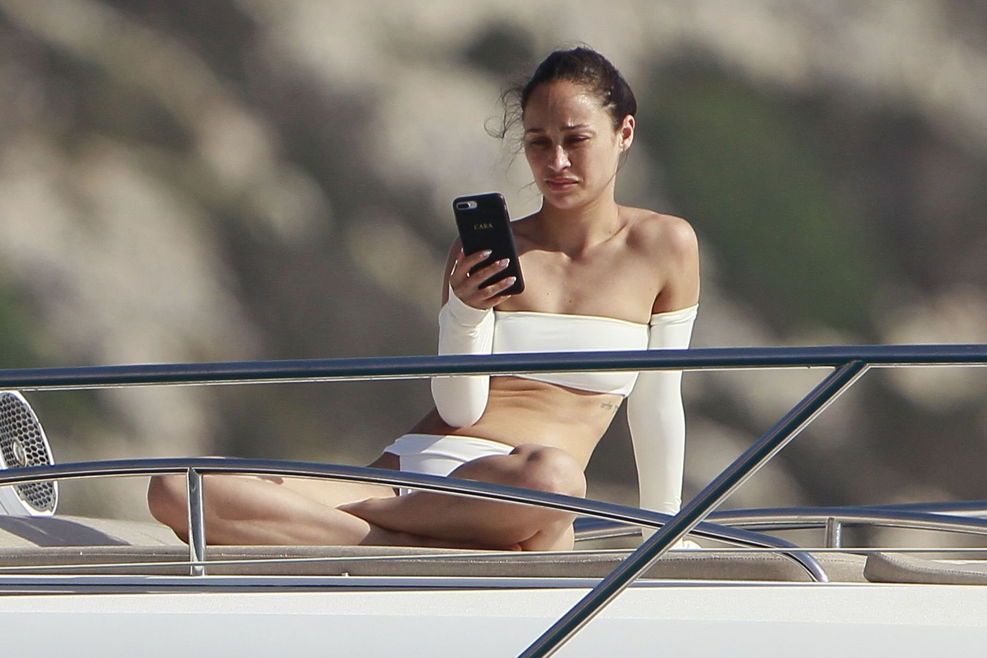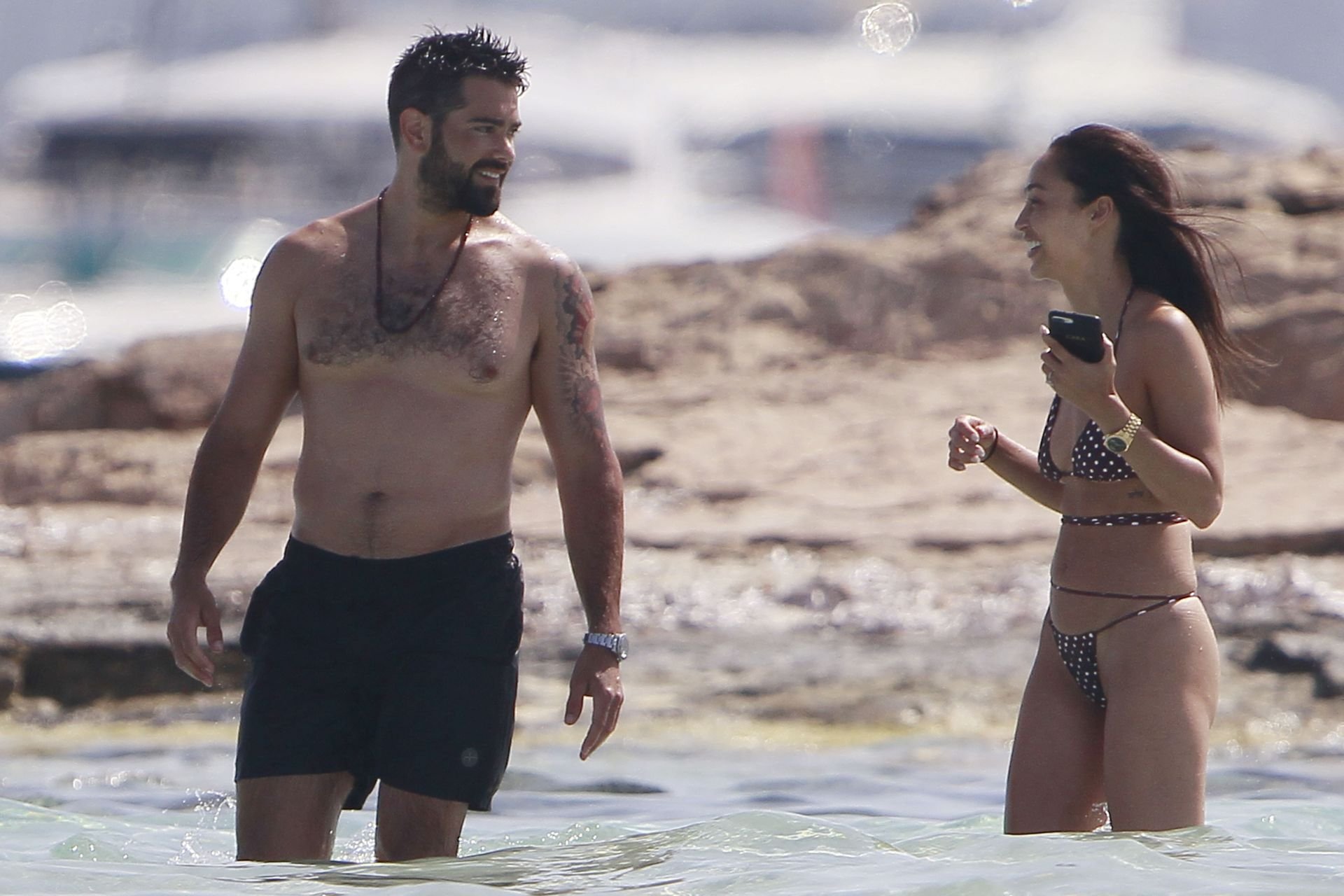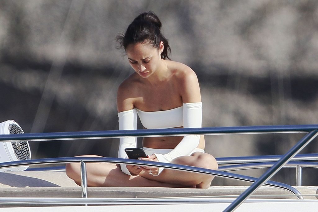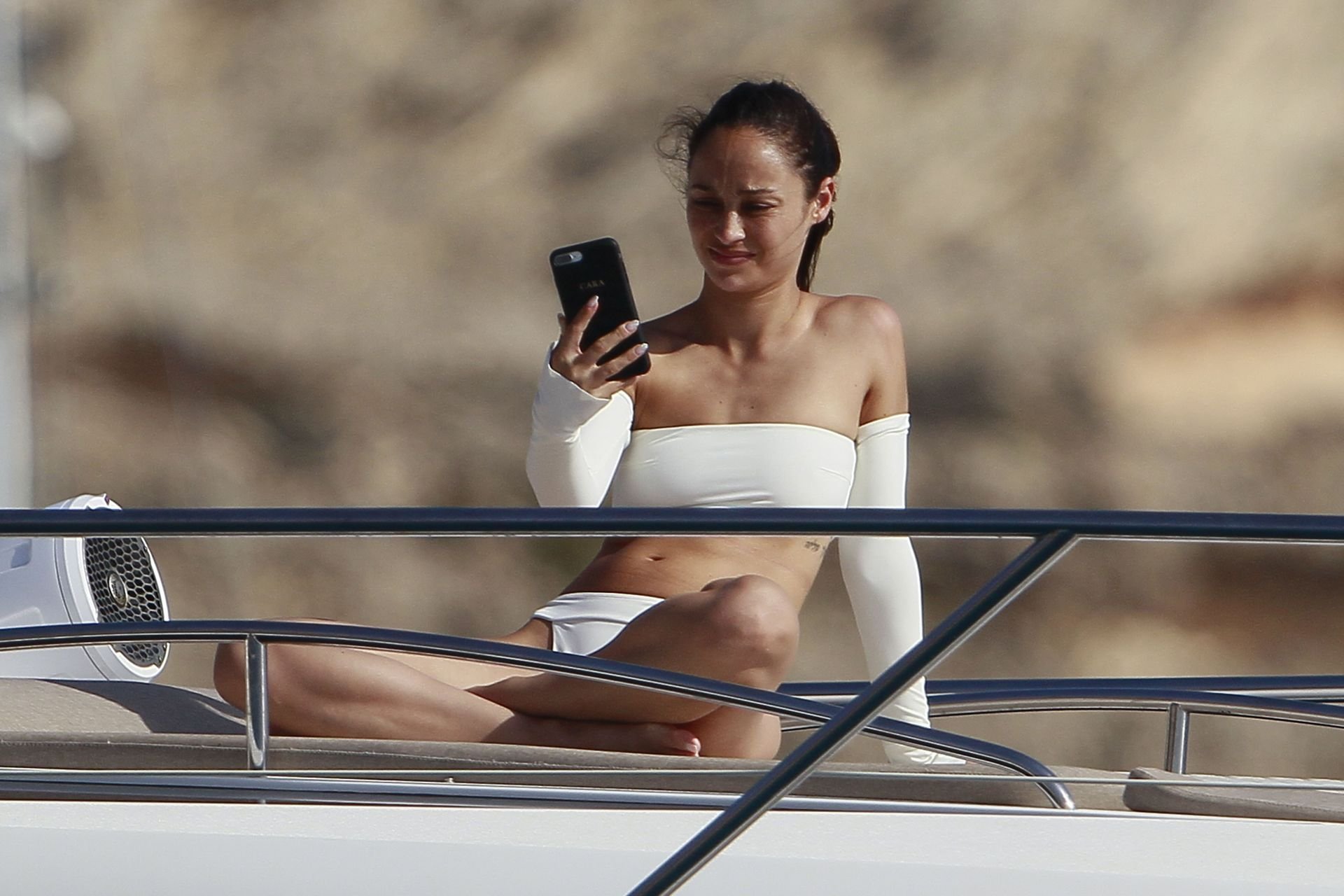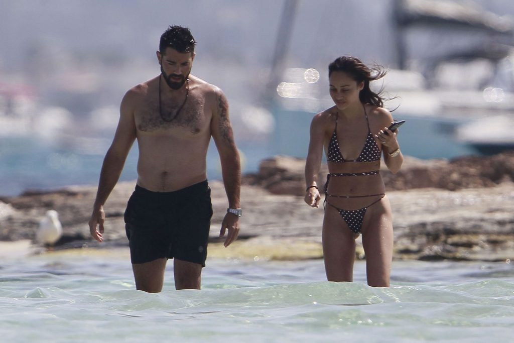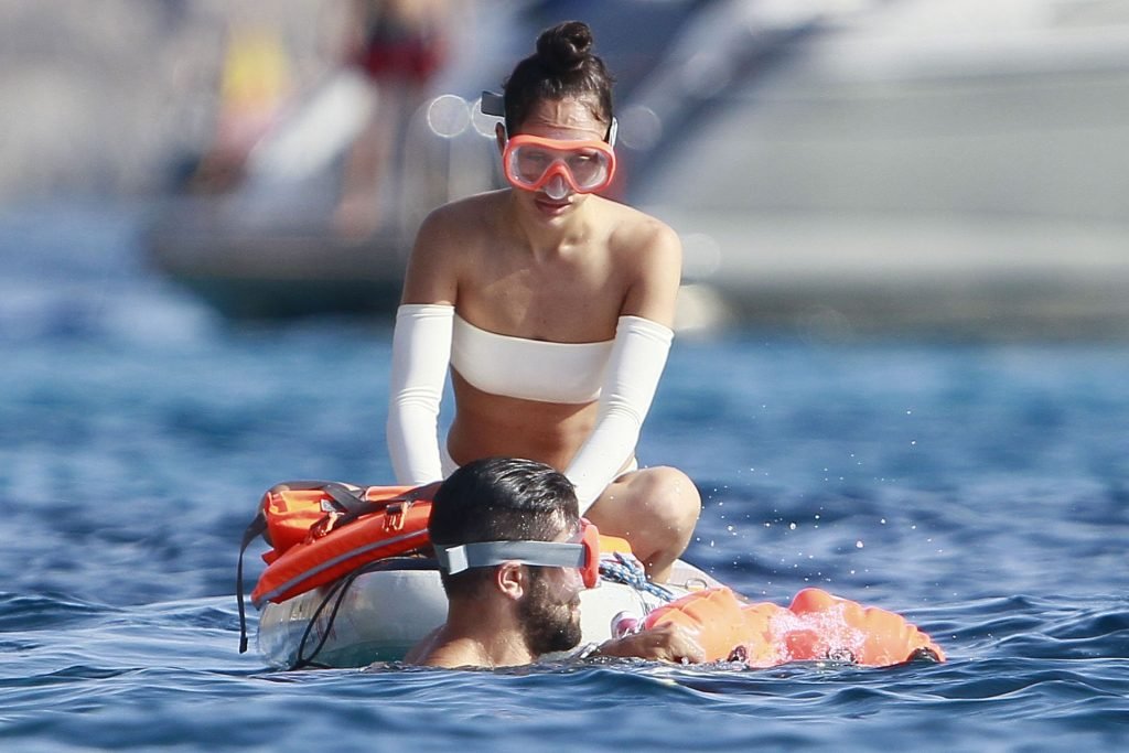 Актриса кино Кара Сантана и Джесси Меткалф вместе занимаются паддлбордингом в конце долгого и расслабленного дня на пляже в Форментере, Испания, 21.07.2019.