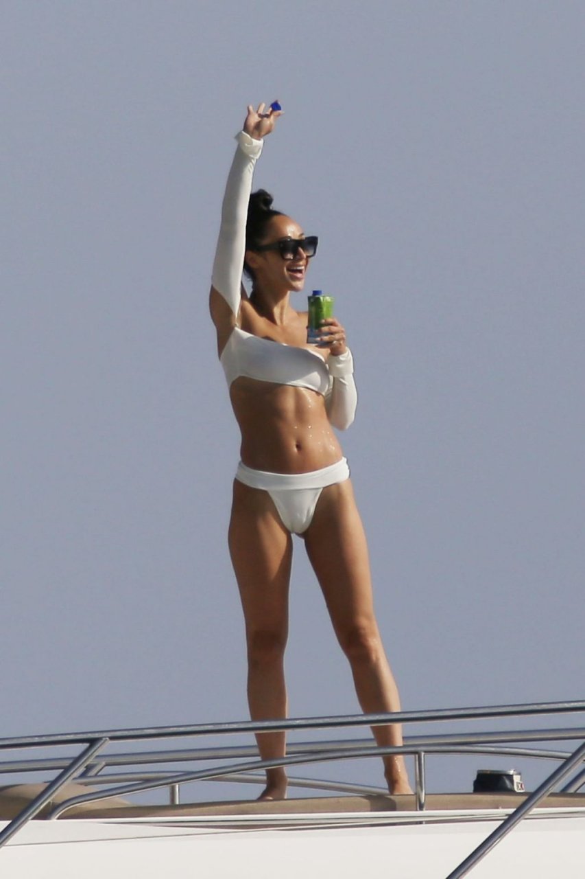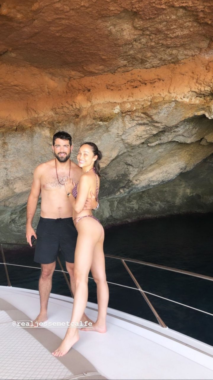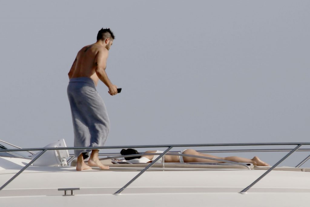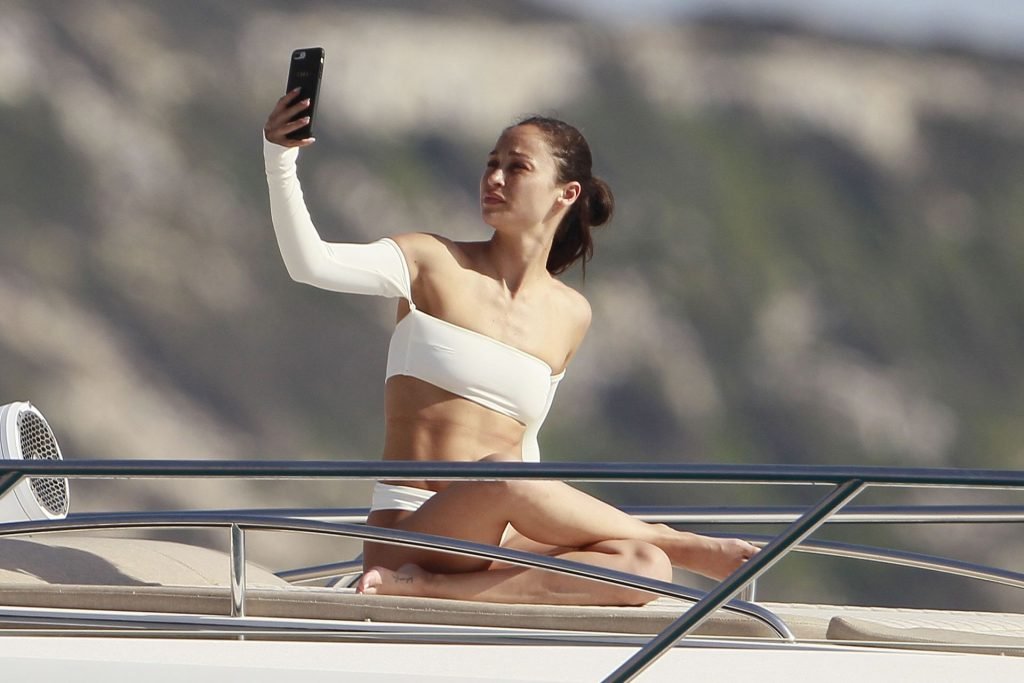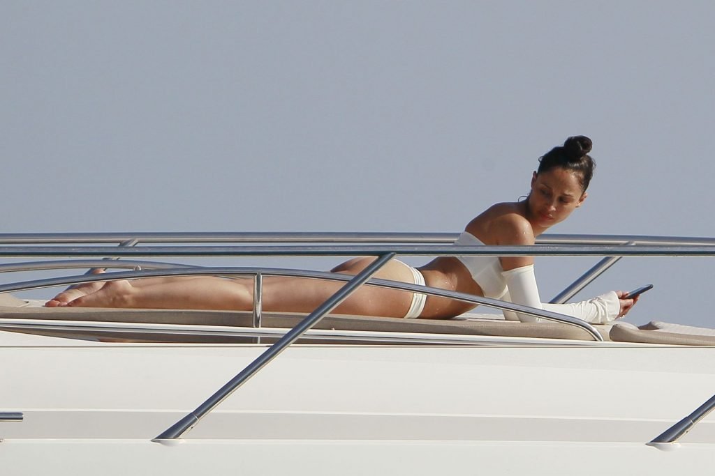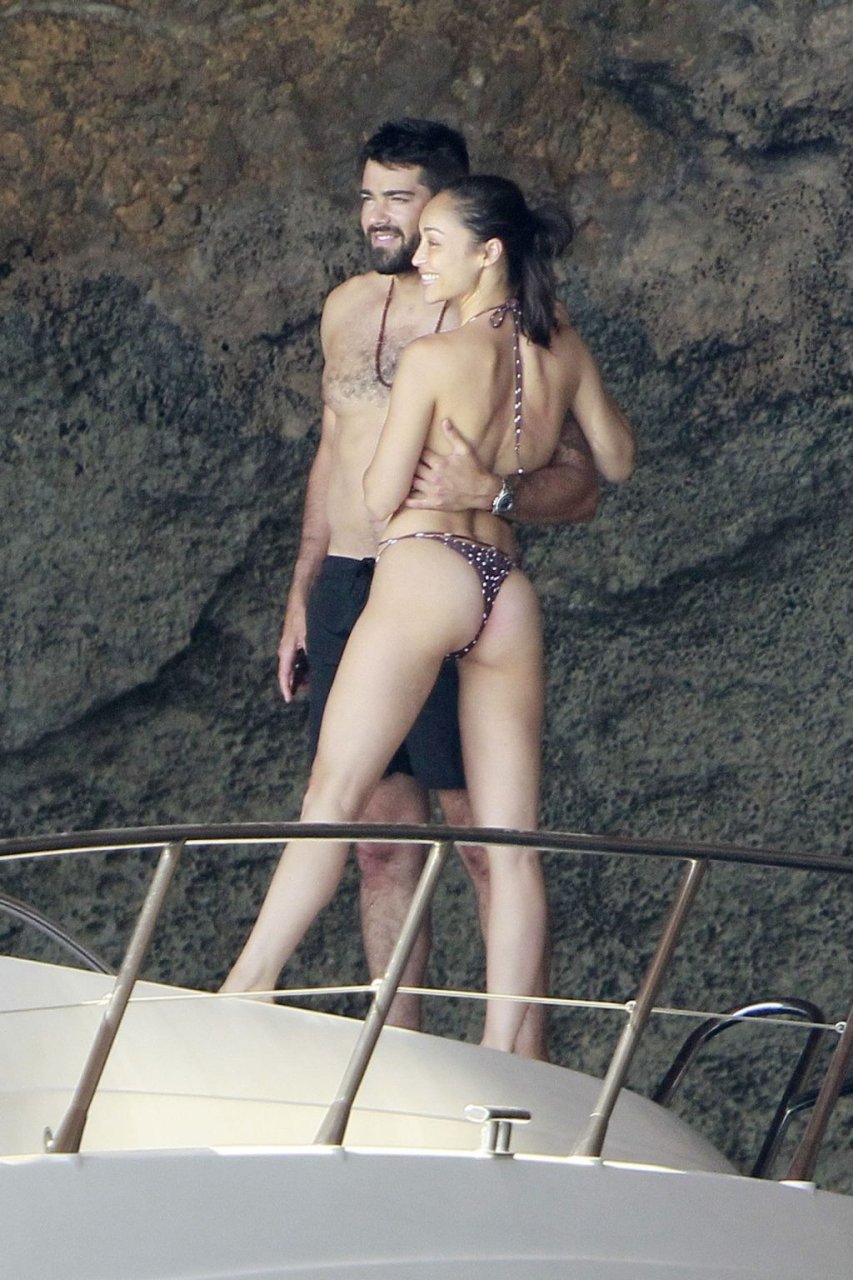 Актриса кино Кара Сантана и Джесси Меткалф вместе занимаются паддлбордингом в конце долгого и расслабленного дня на пляже в Форментере, Испания, 21.07.2019.