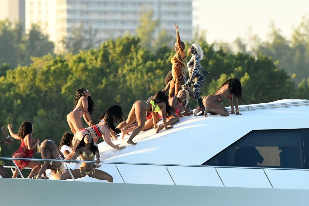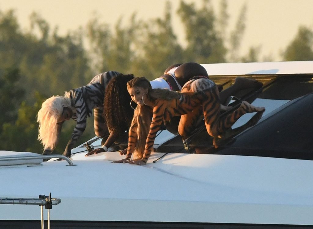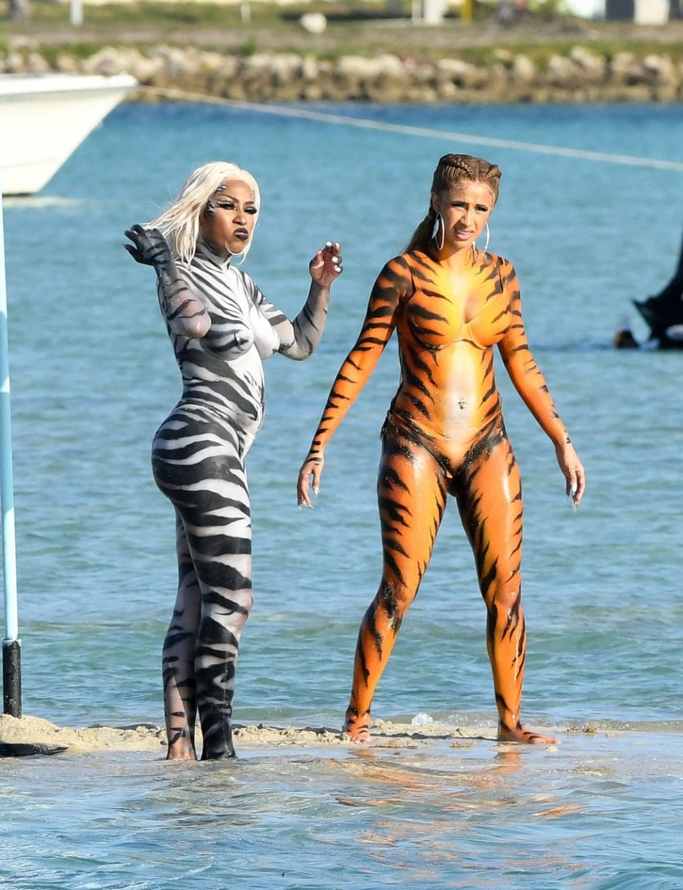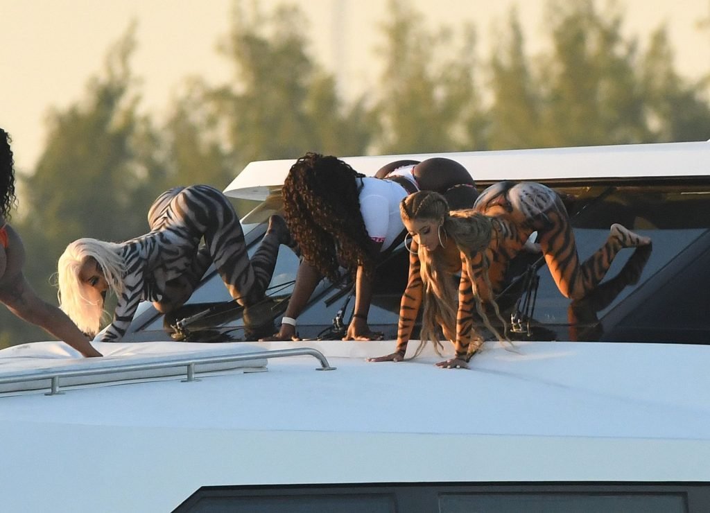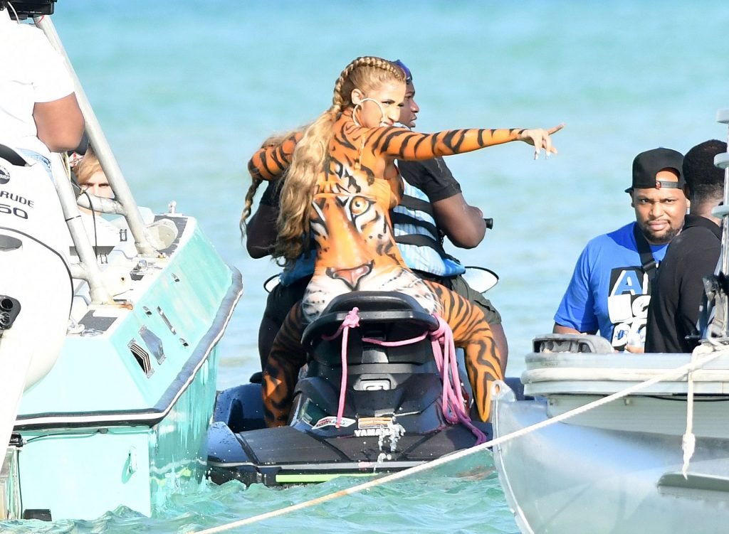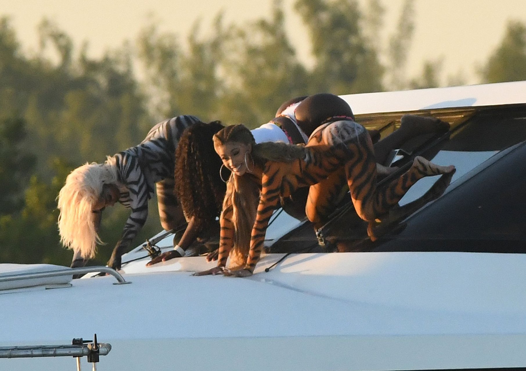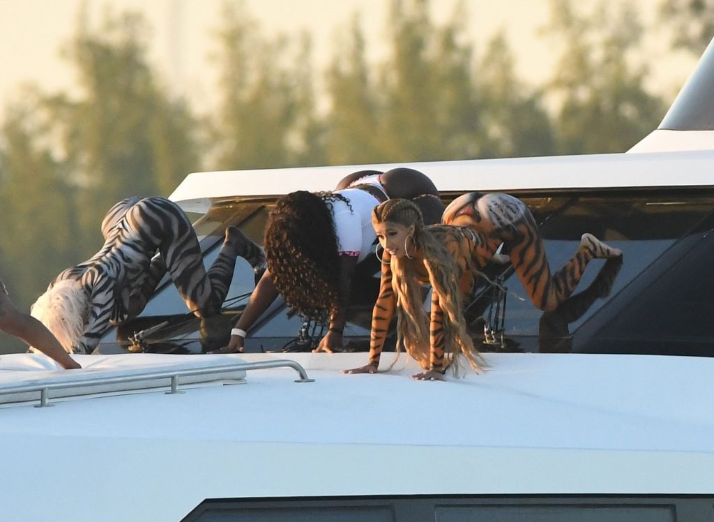 Рэперша Карди Би (Белкалис Алманзар) носит тигровую раскраску тела, танцуя тверк на яхте во время съемок видео в Майами, после того как пропустила судебное заседание в Нью-Йорке, 12/03/2018.