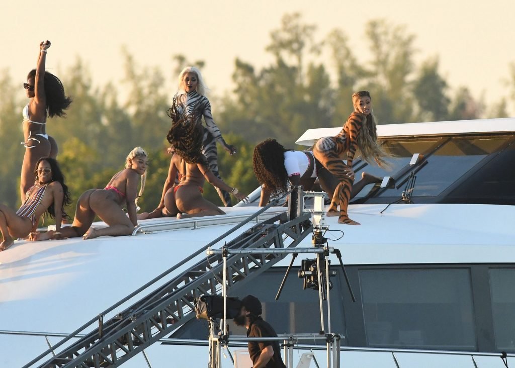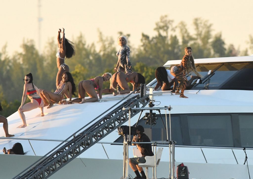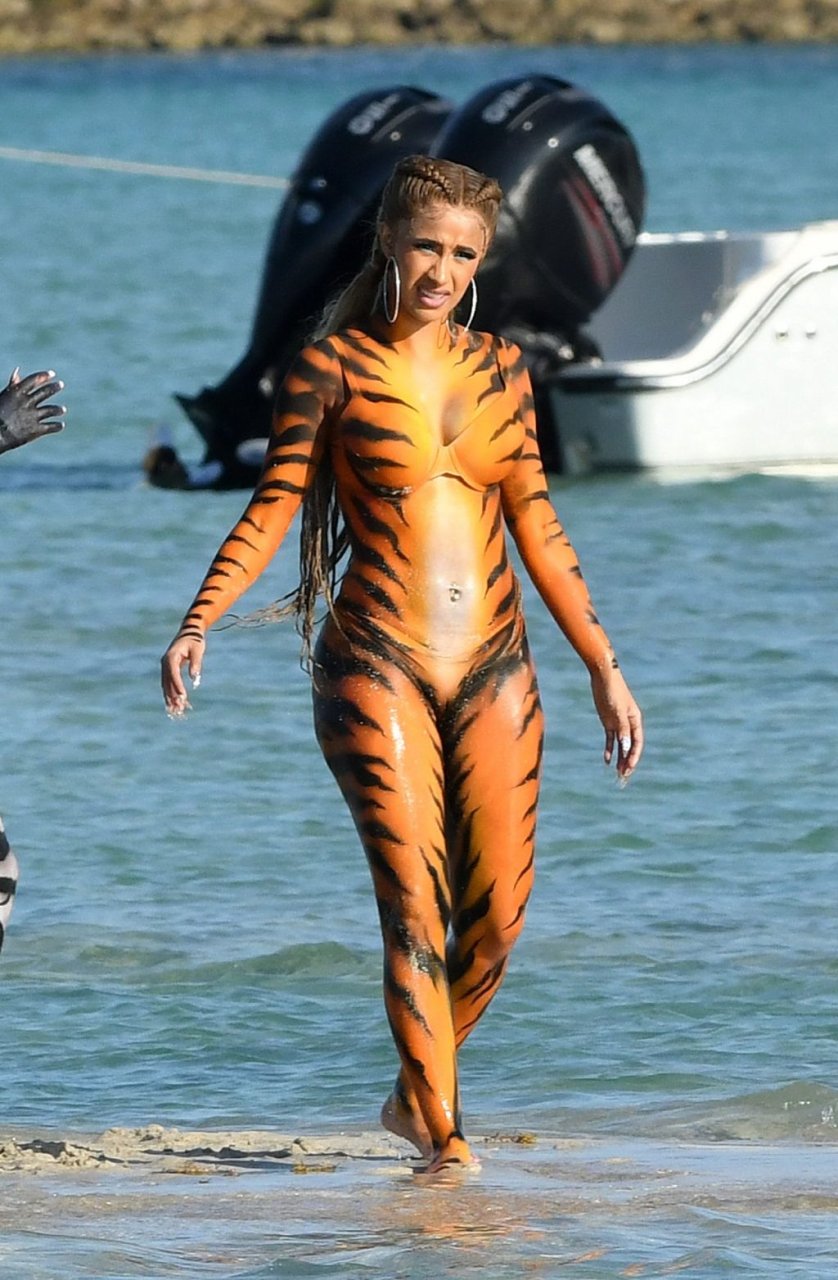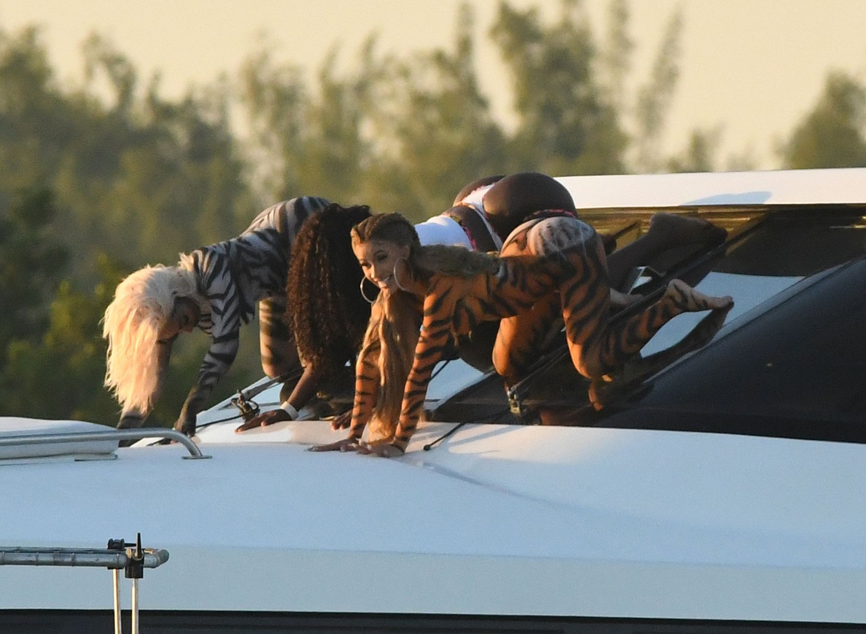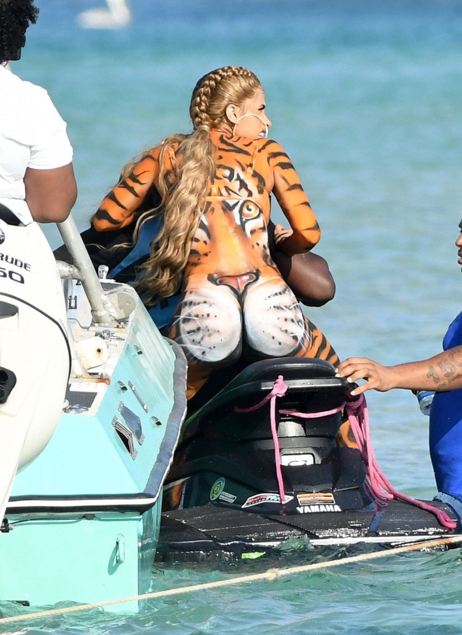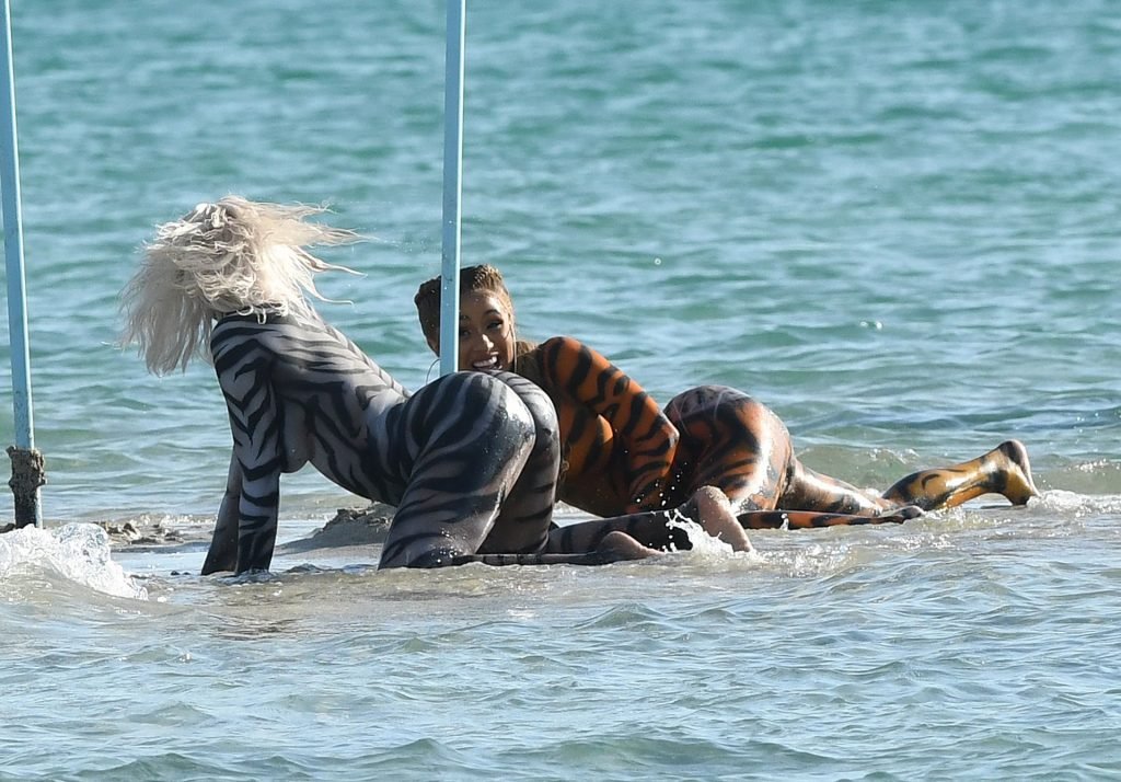 Рэперша Карди Би (Белкалис Алманзар) носит тигровую раскраску тела, танцуя тверк на яхте во время съемок видео в Майами, после того как пропустила судебное заседание в Нью-Йорке, 12/03/2018.