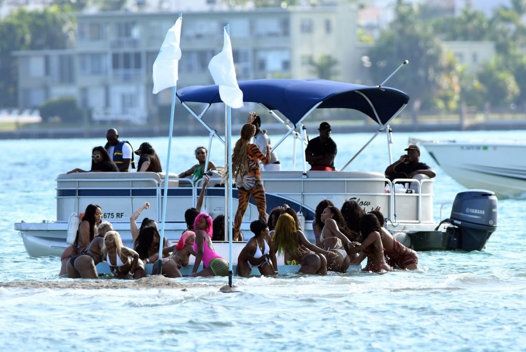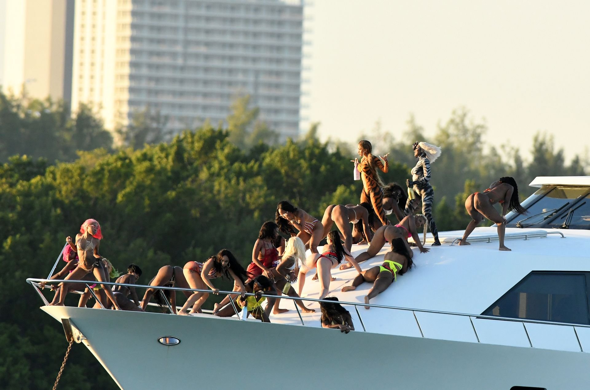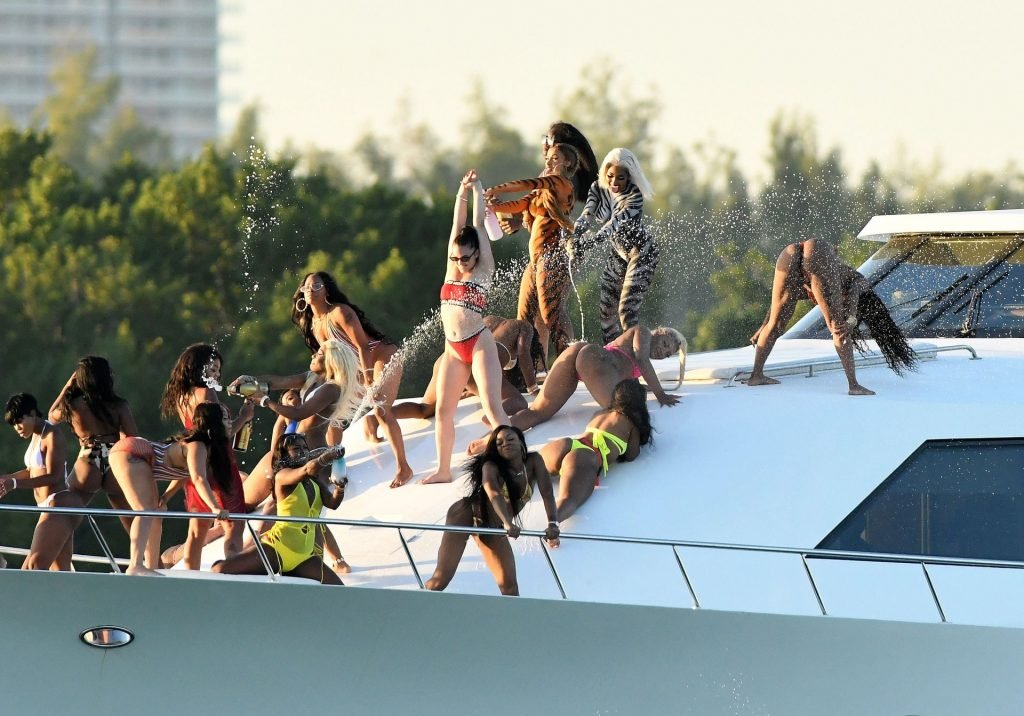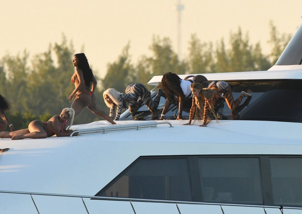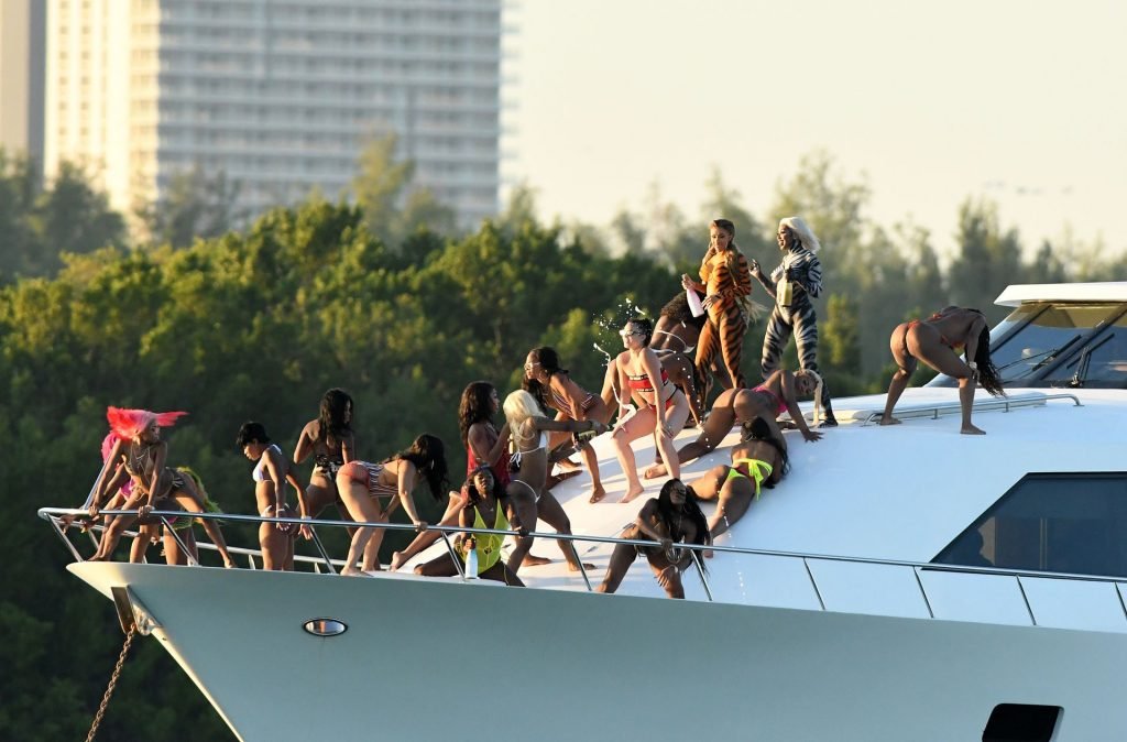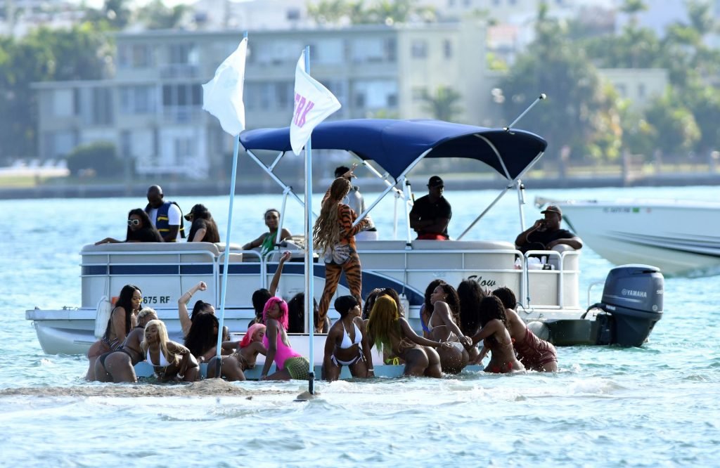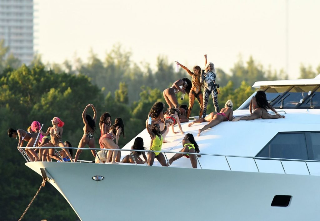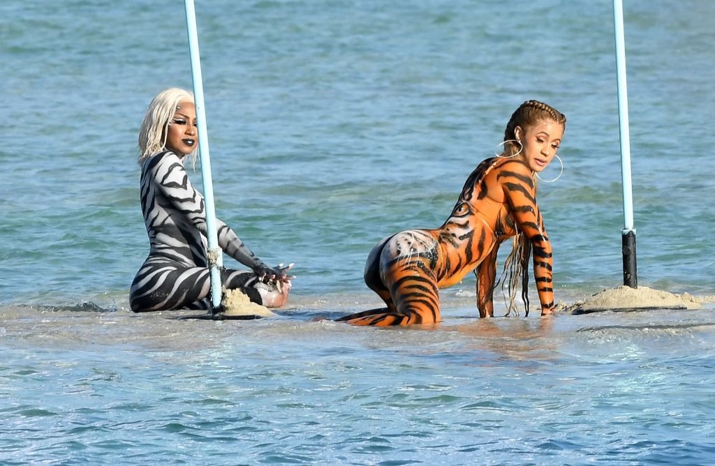 Рэперша Карди Би (Белкалис Алманзар) носит тигровую раскраску тела, танцуя тверк на яхте во время съемок видео в Майами, после того как пропустила судебное заседание в Нью-Йорке, 12/03/2018.