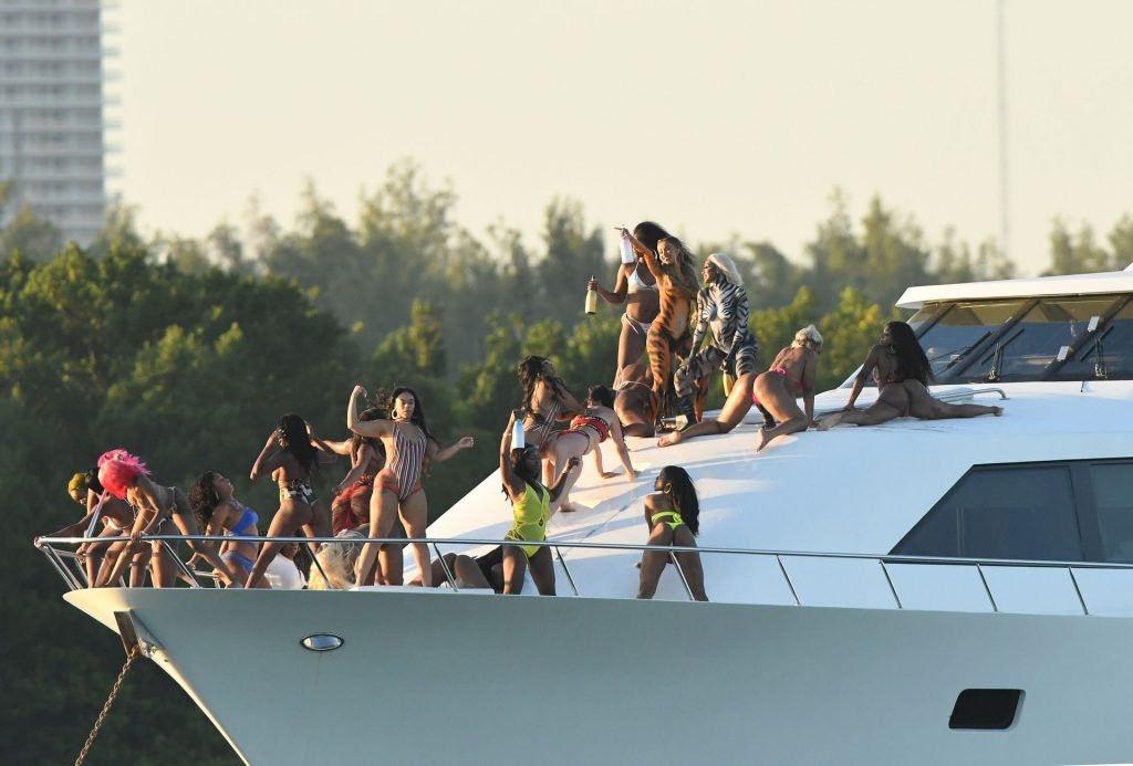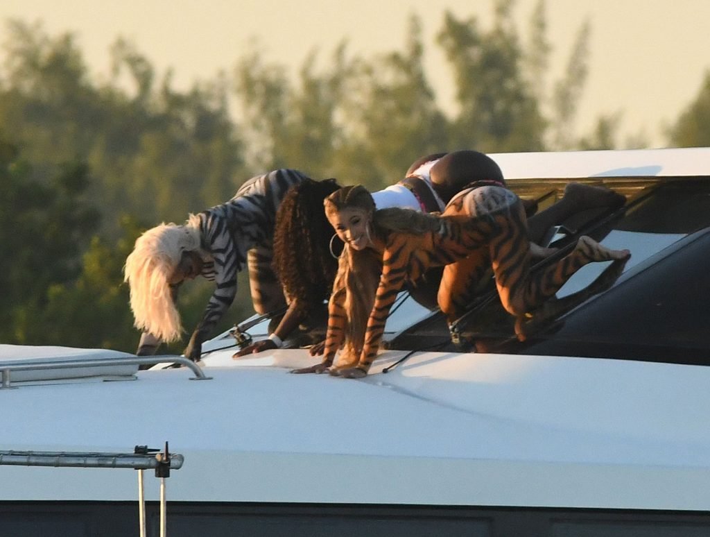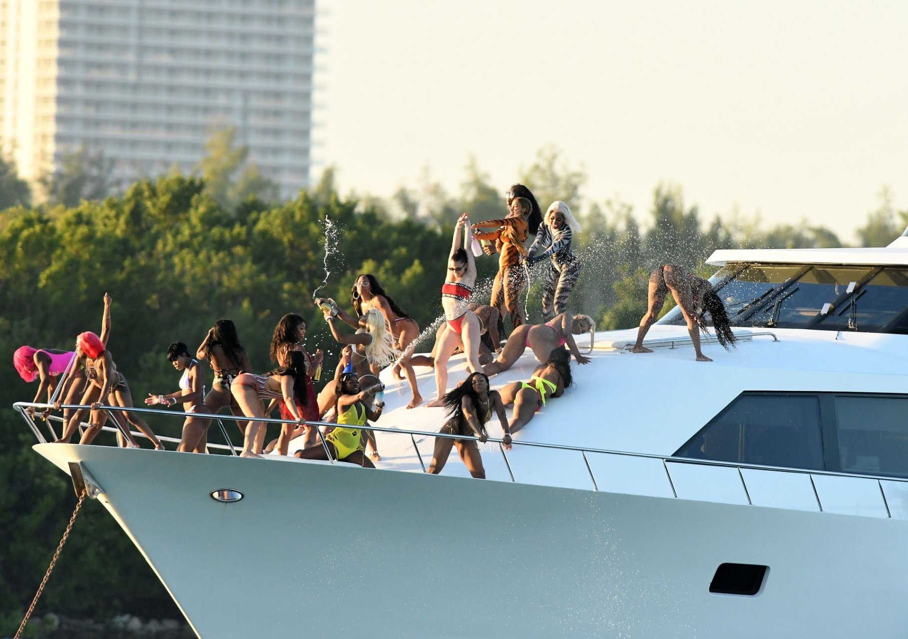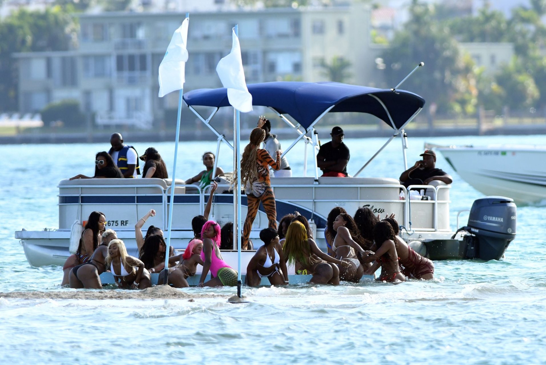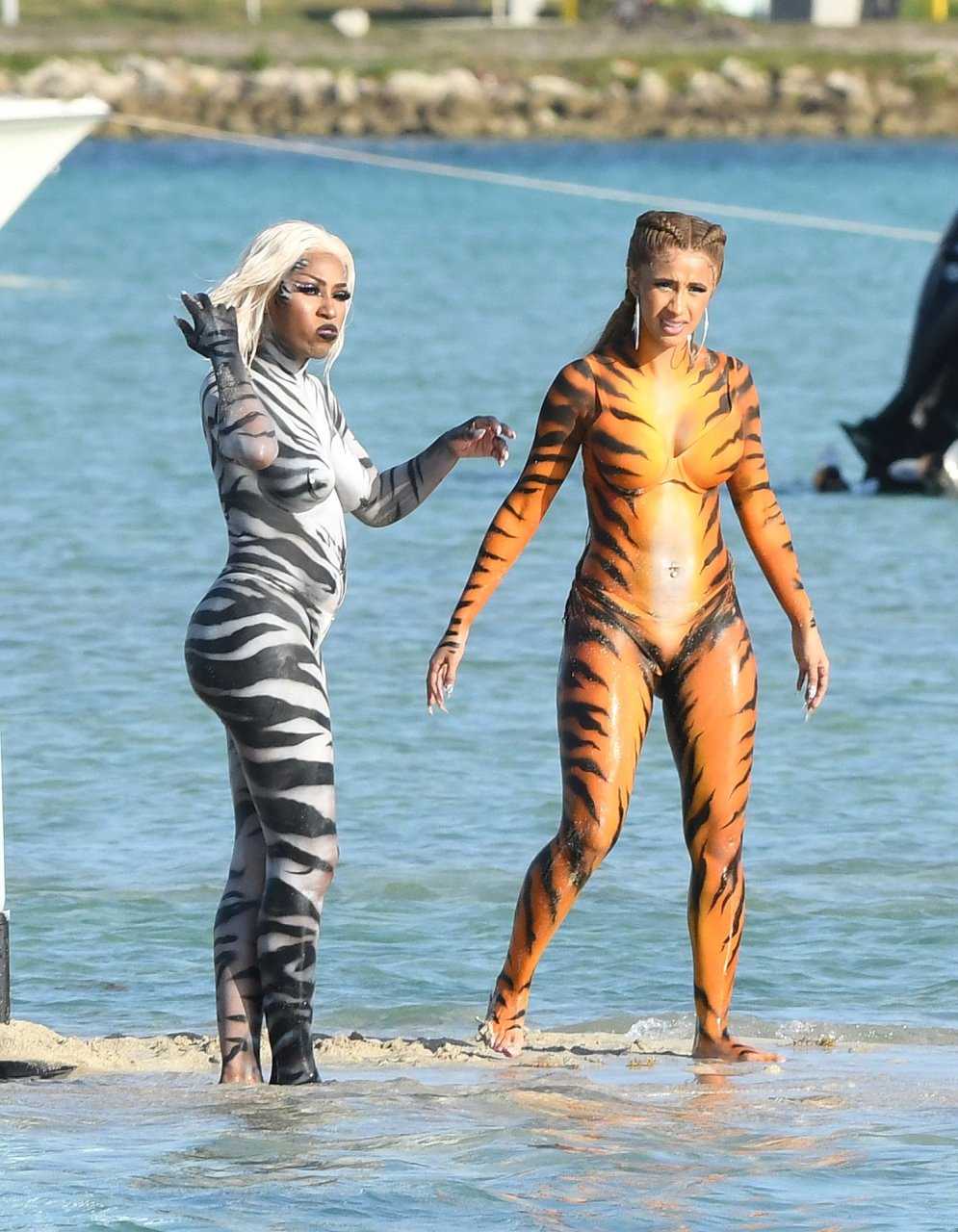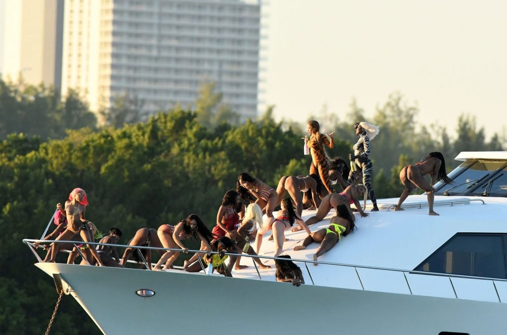 Рэперша Карди Би (Белкалис Алманзар) носит тигровую раскраску тела, танцуя тверк на яхте во время съемок видео в Майами, после того как пропустила судебное заседание в Нью-Йорке, 12/03/2018.