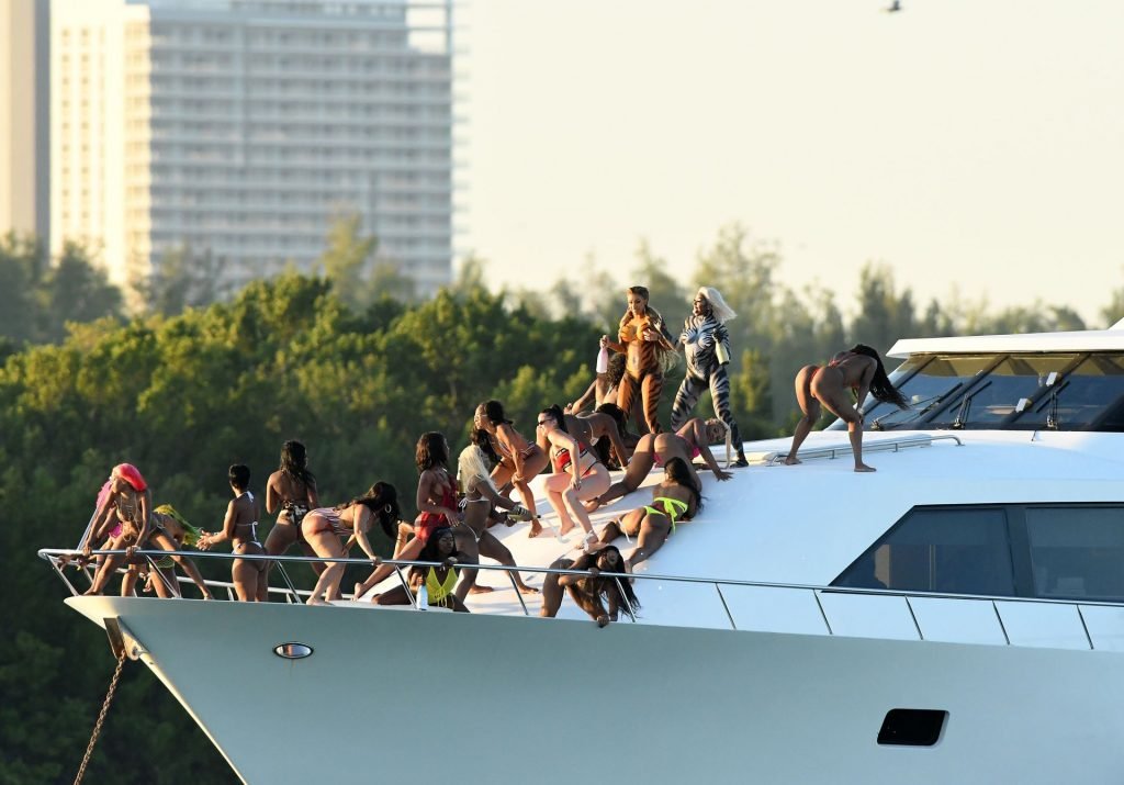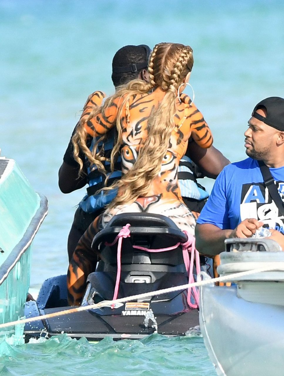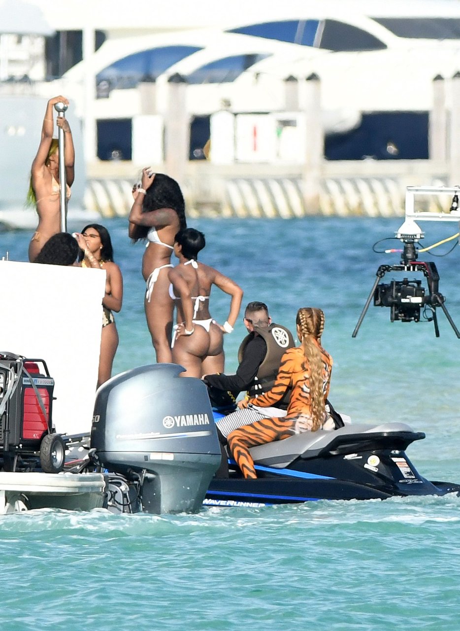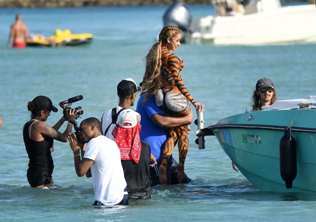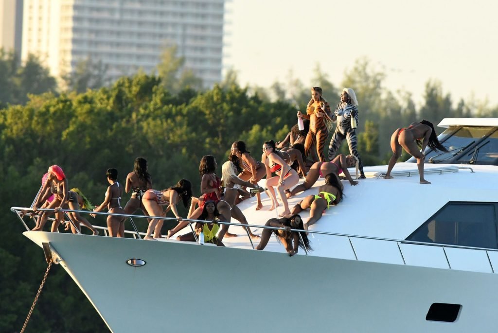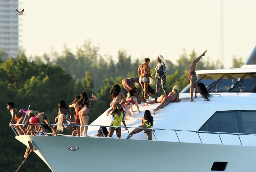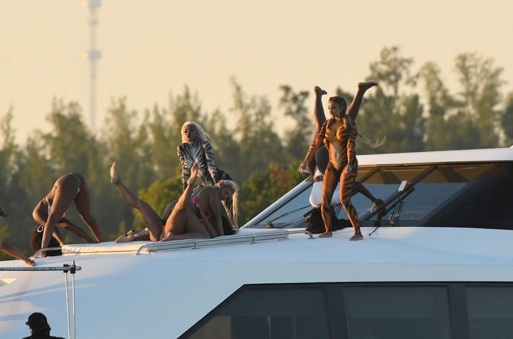 Рэперша Карди Би (Белкалис Алманзар) носит тигровую раскраску тела, танцуя тверк на яхте во время съемок видео в Майами, после того как пропустила судебное заседание в Нью-Йорке, 12/03/2018.