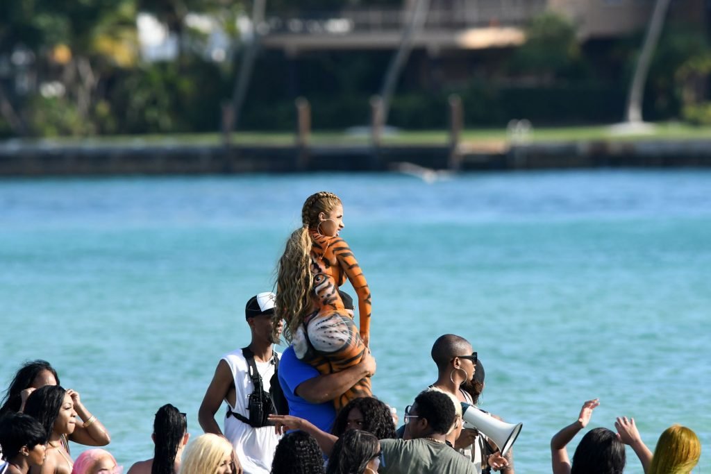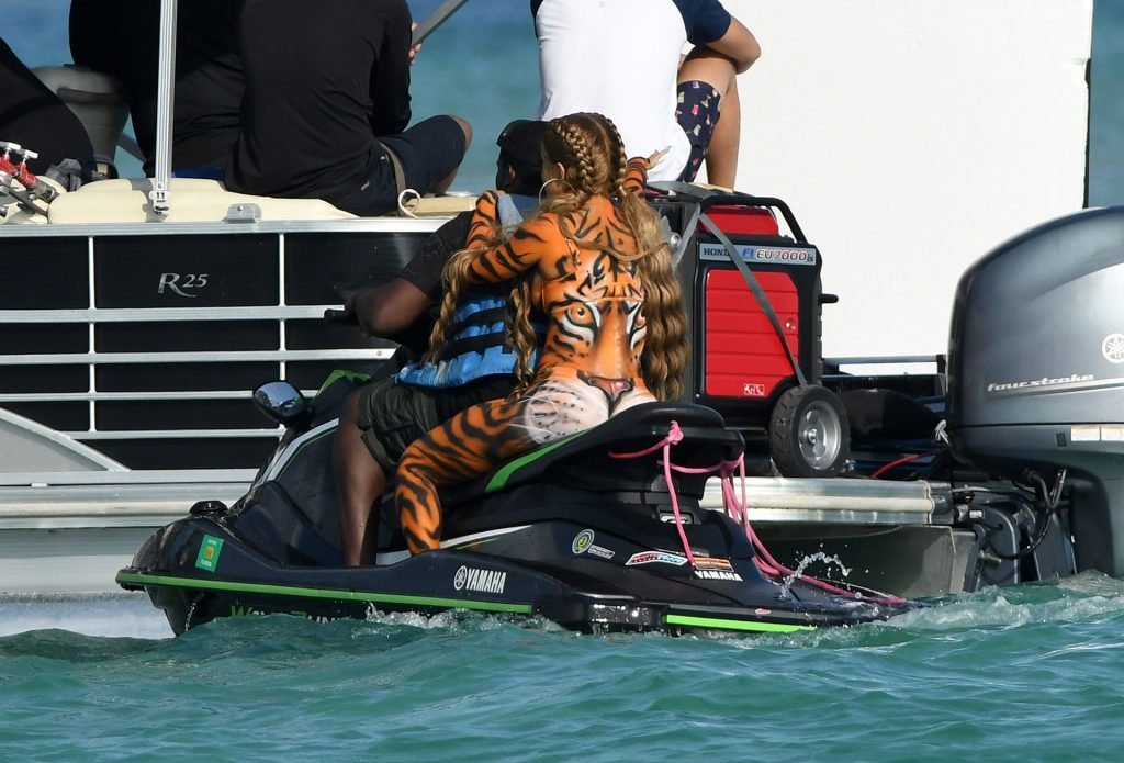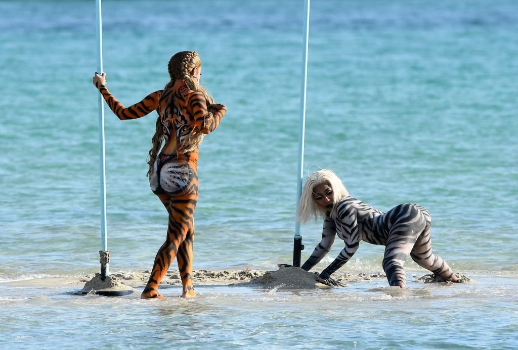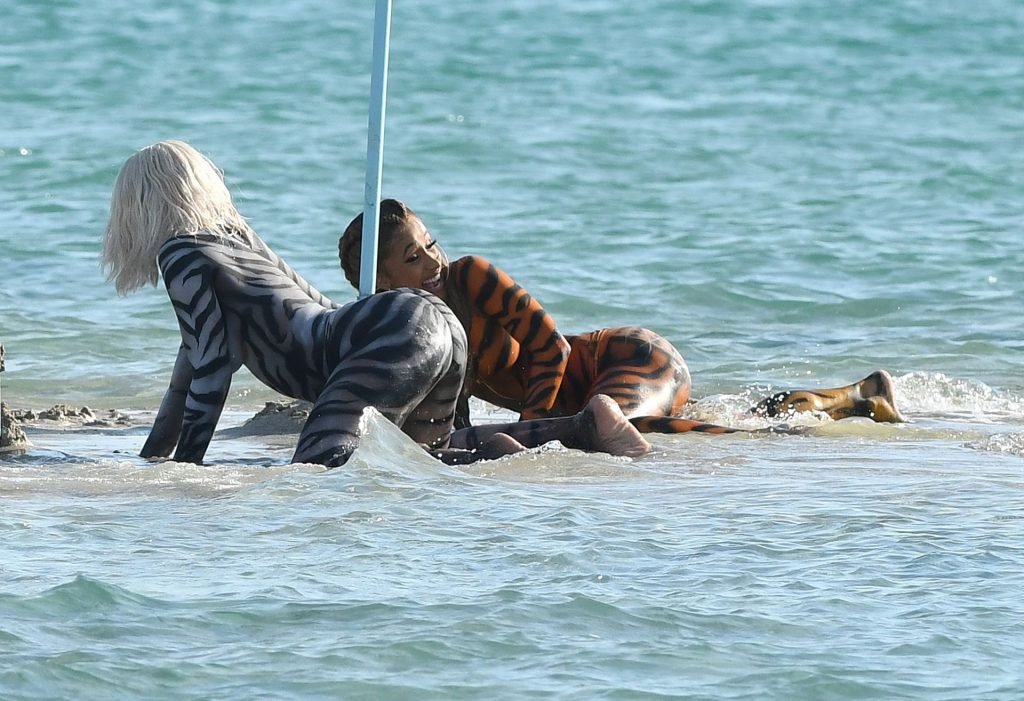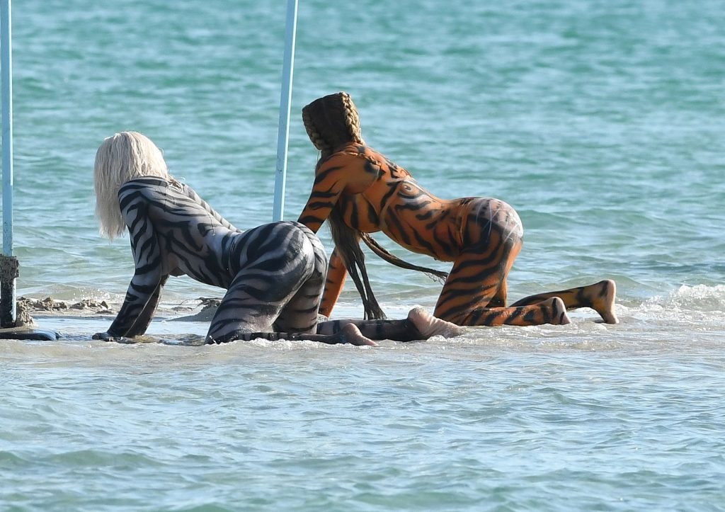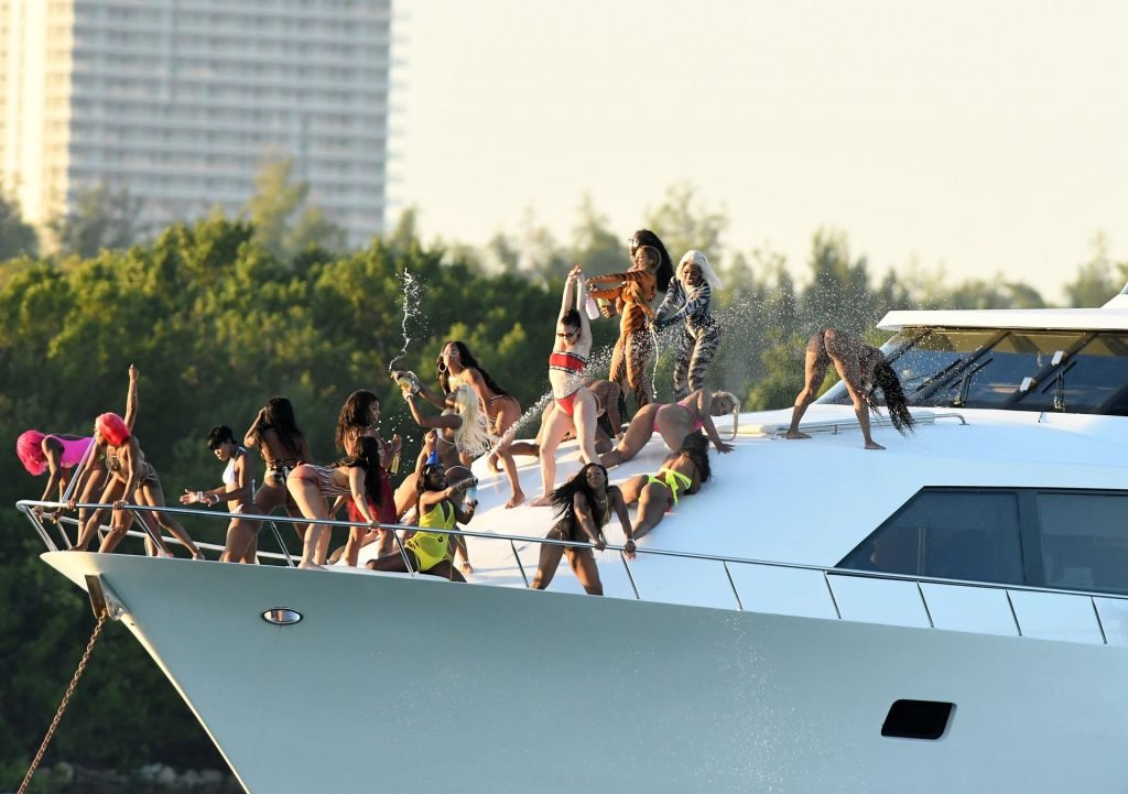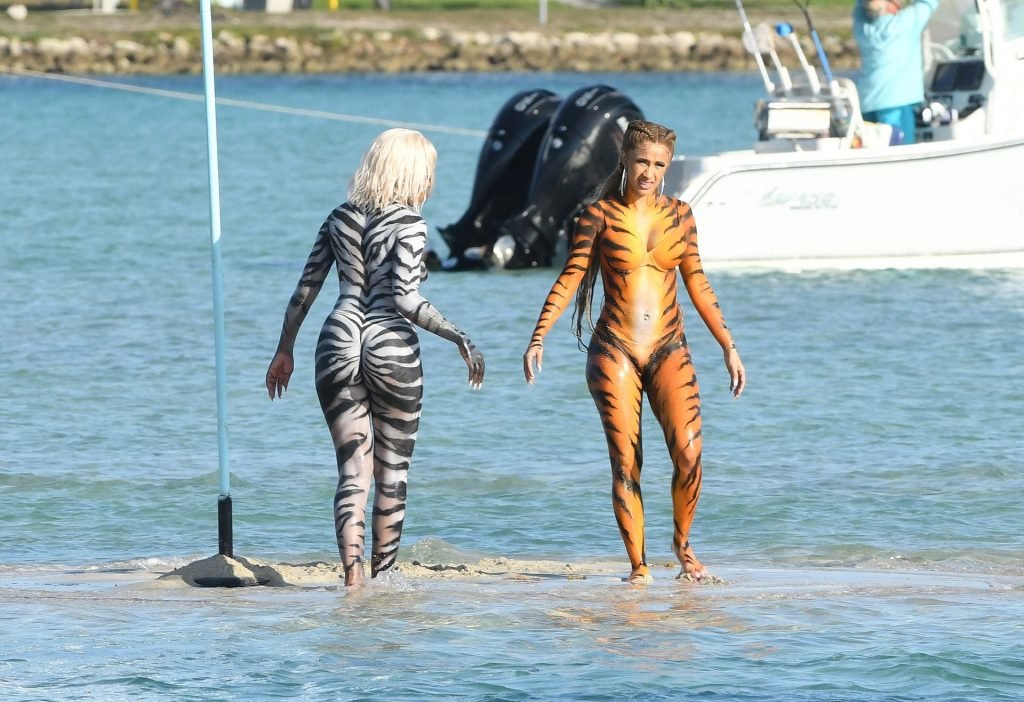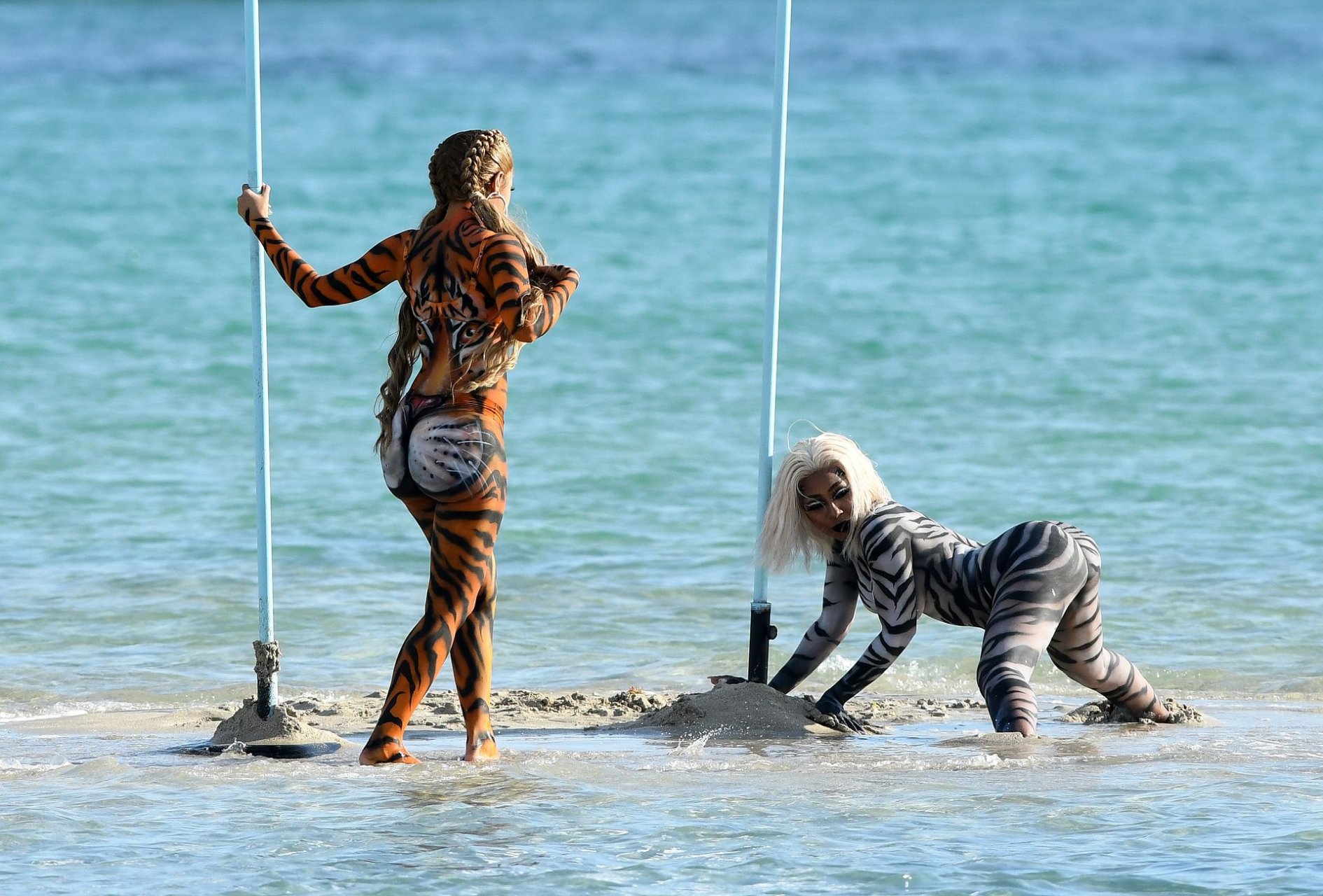 Рэперша Карди Би (Белкалис Алманзар) носит тигровую раскраску тела, танцуя тверк на яхте во время съемок видео в Майами, после того как пропустила судебное заседание в Нью-Йорке, 12/03/2018.
