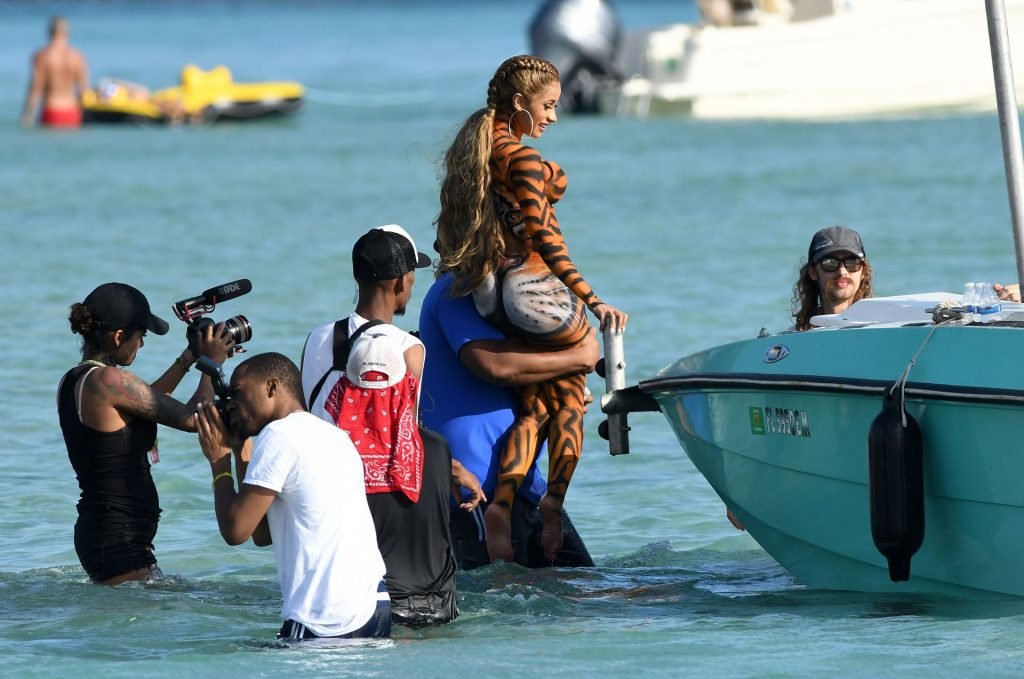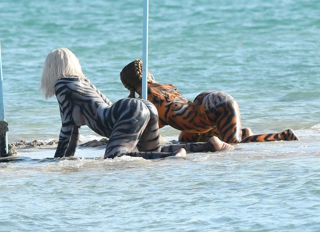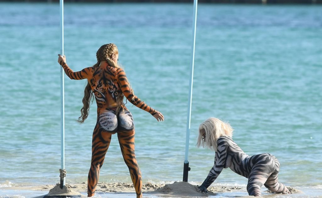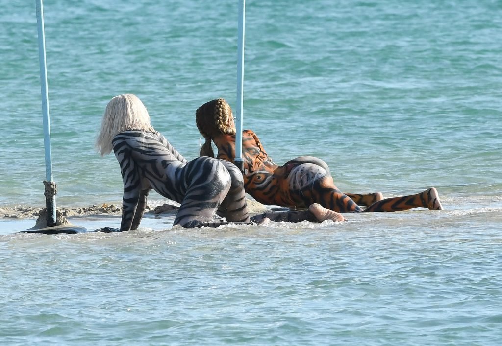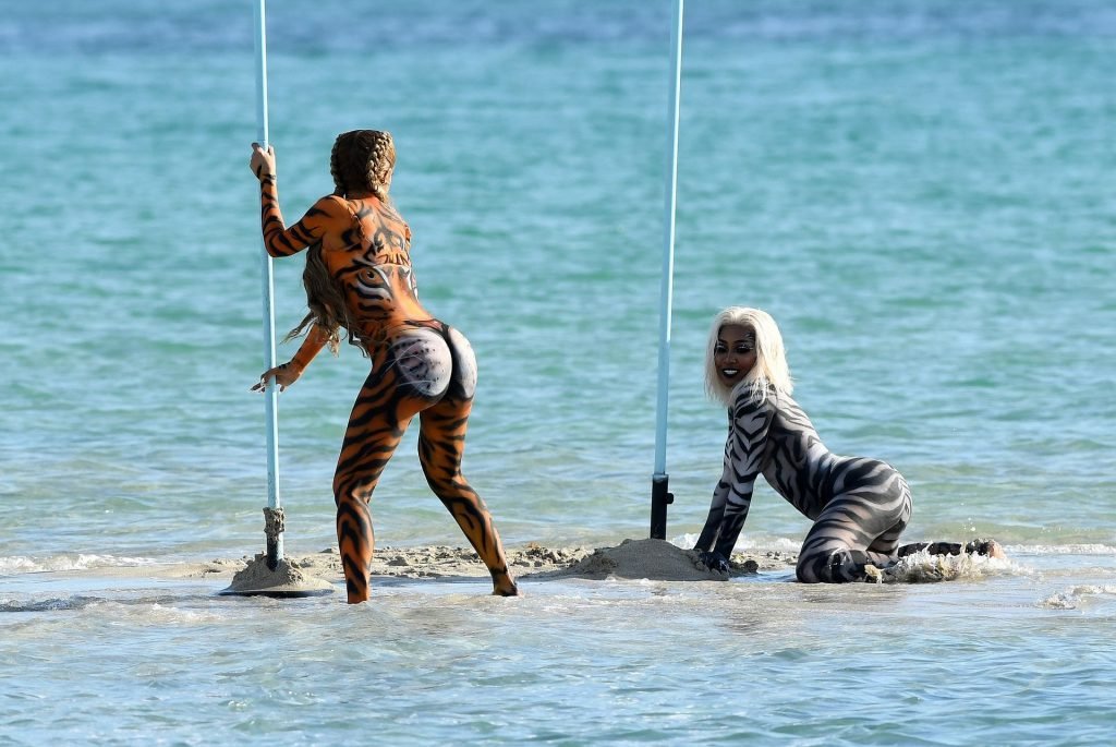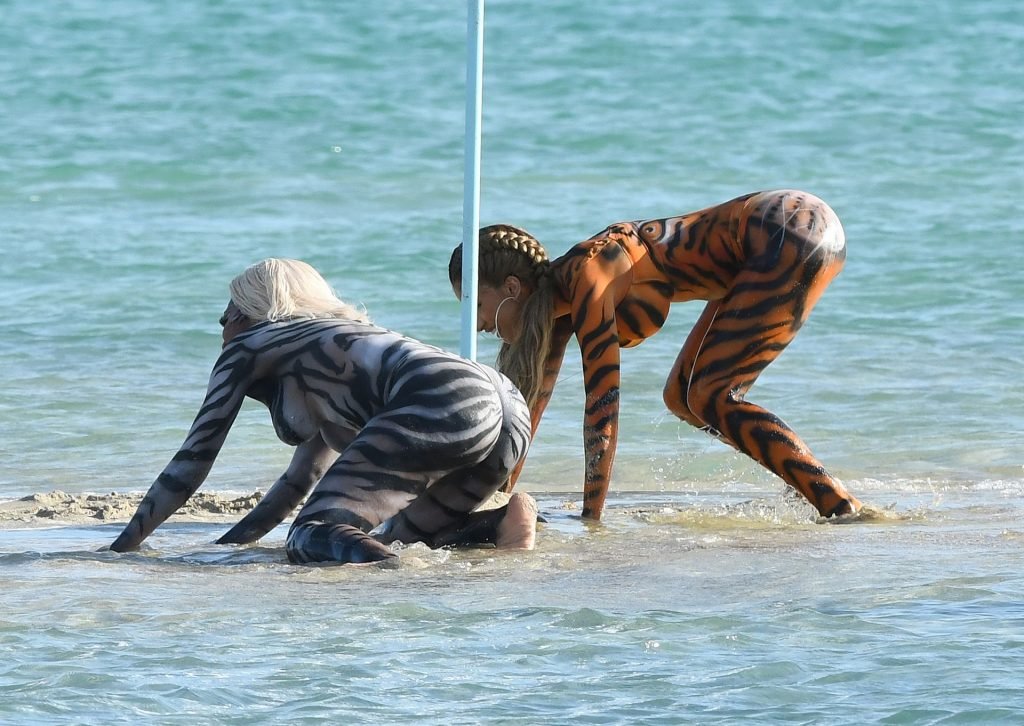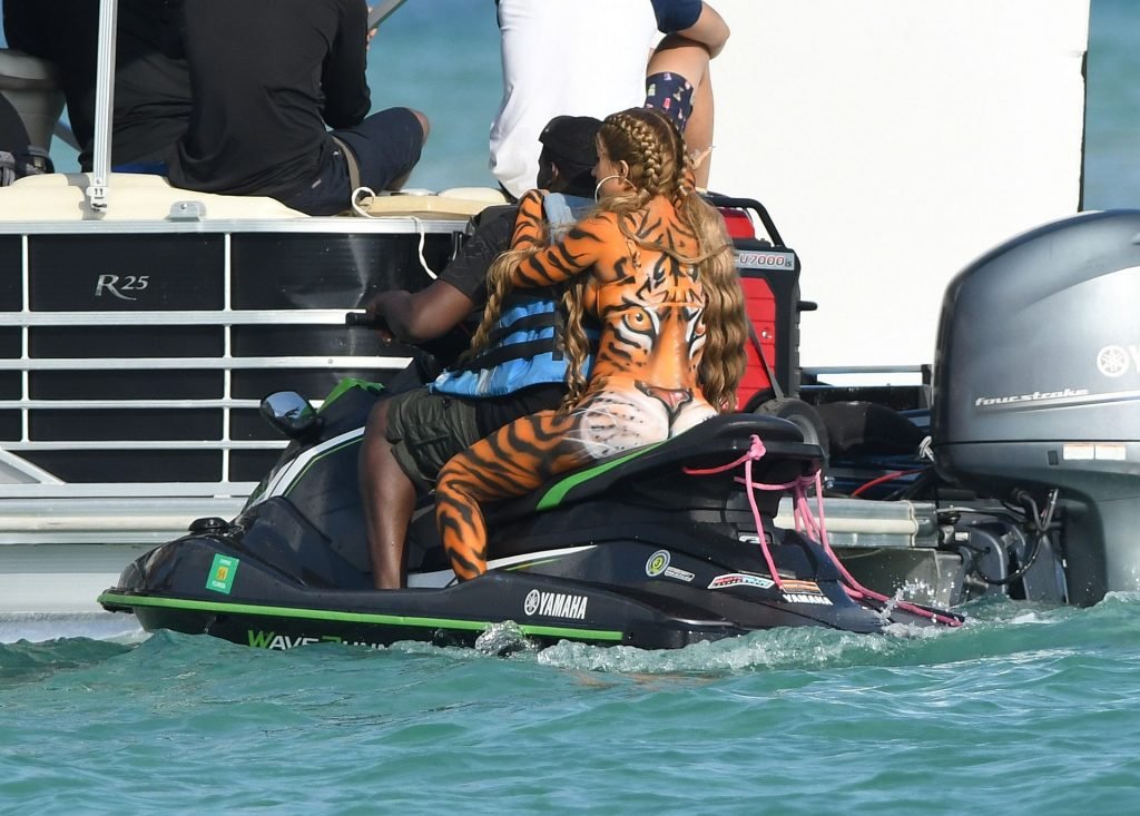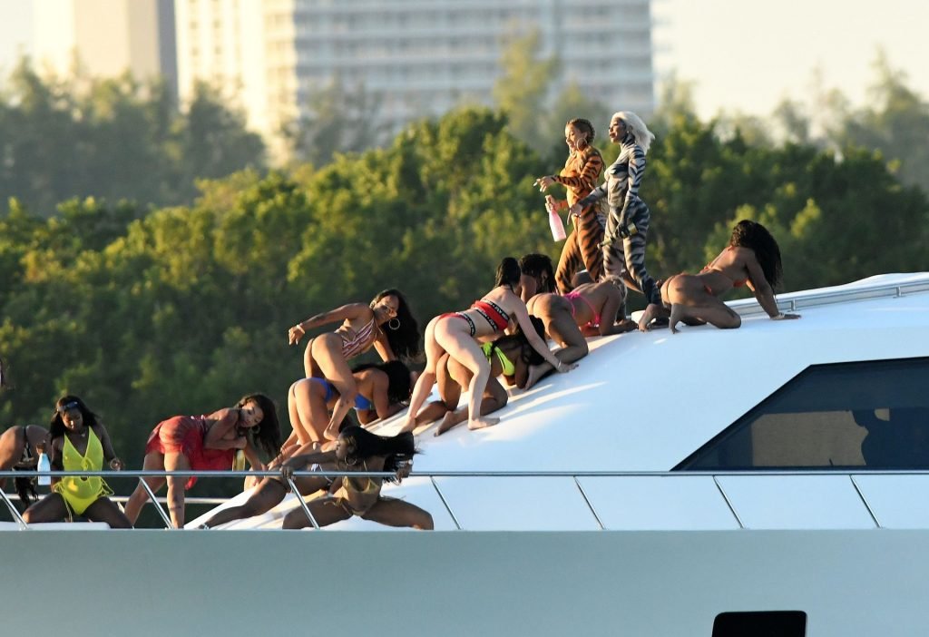 Рэперша Карди Би (Белкалис Алманзар) носит тигровую раскраску тела, танцуя тверк на яхте во время съемок видео в Майами, после того как пропустила судебное заседание в Нью-Йорке, 12/03/2018.