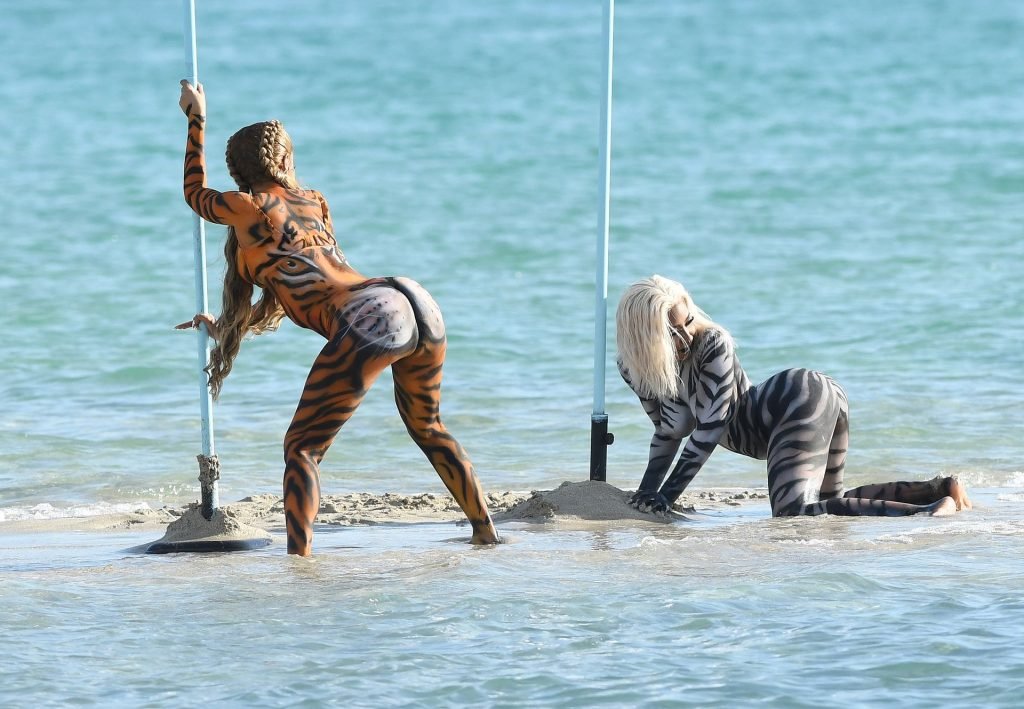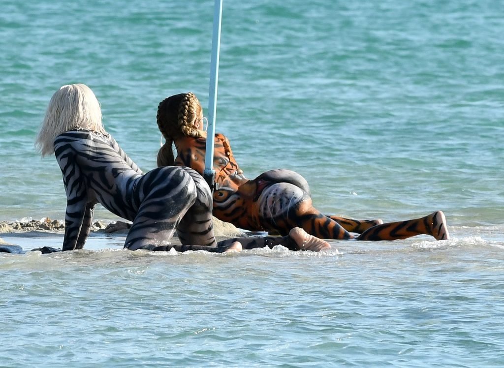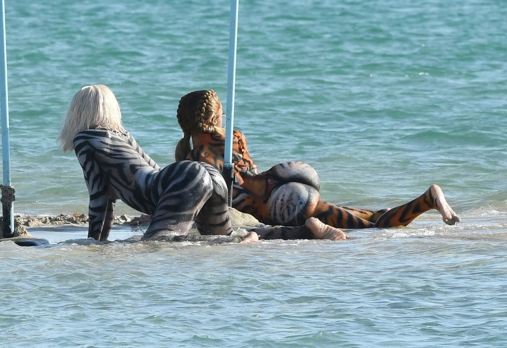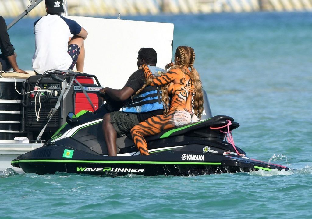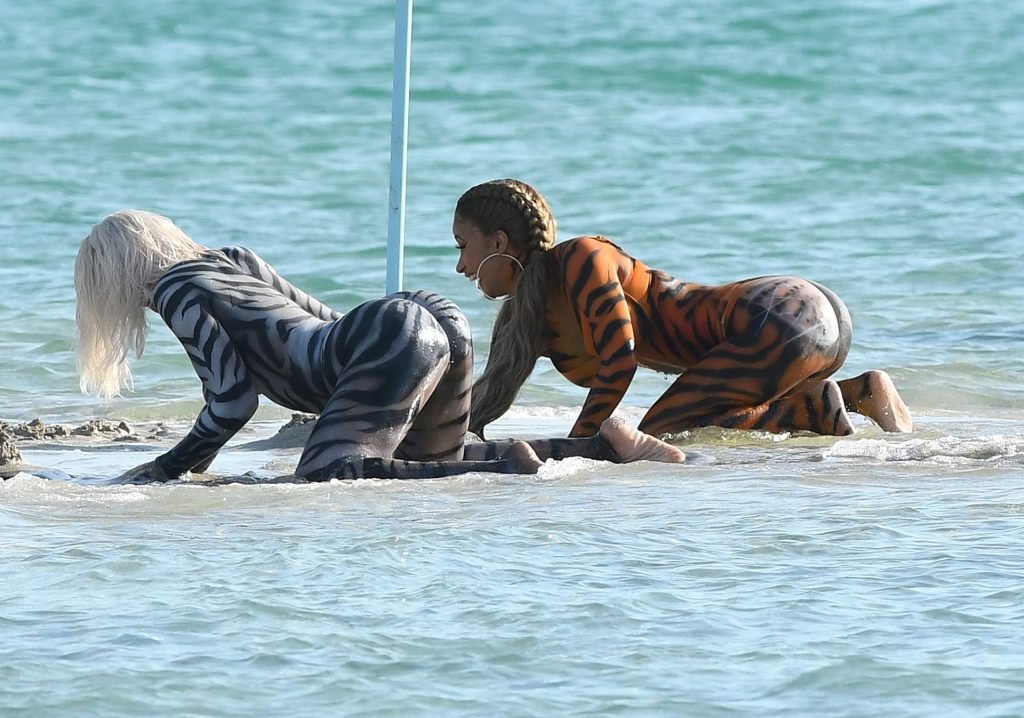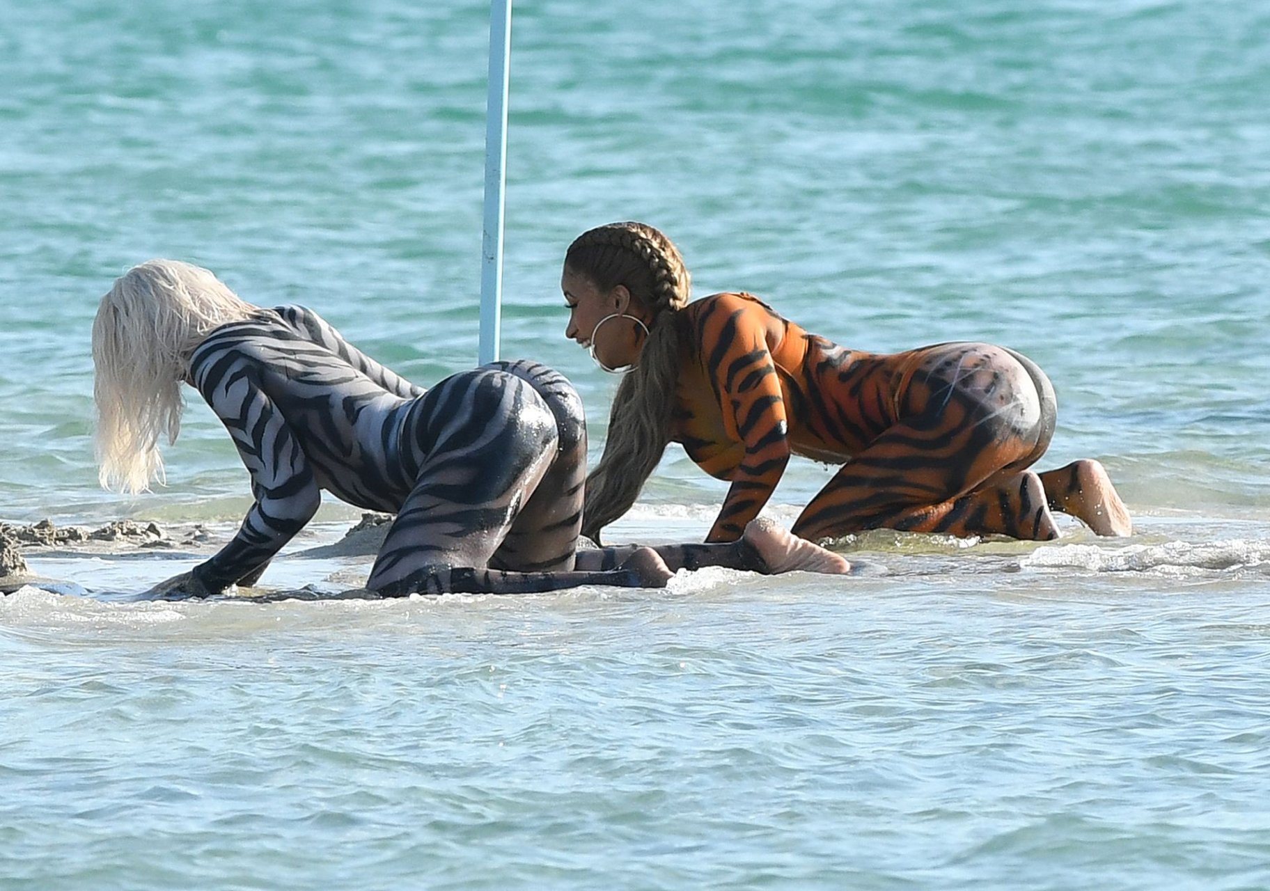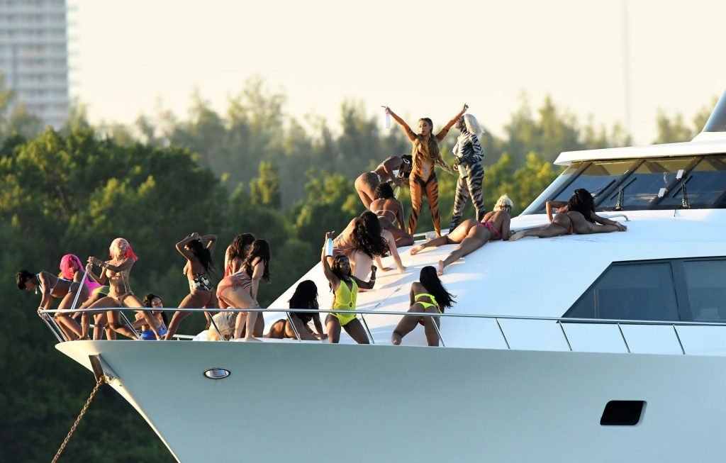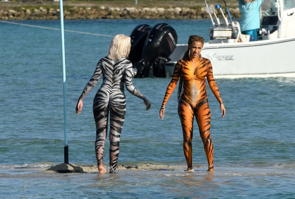 Рэперша Карди Би (Белкалис Алманзар) носит тигровую раскраску тела, танцуя тверк на яхте во время съемок видео в Майами, после того как пропустила судебное заседание в Нью-Йорке, 12/03/2018.