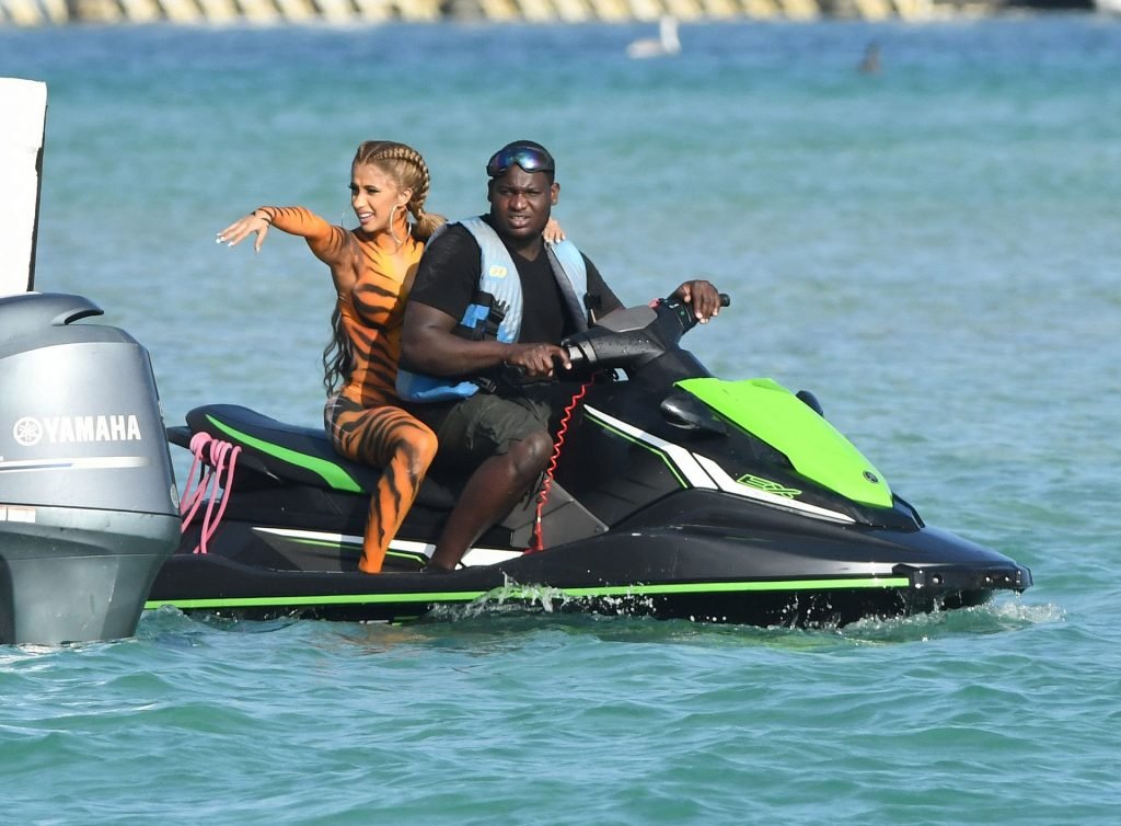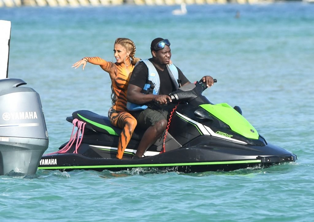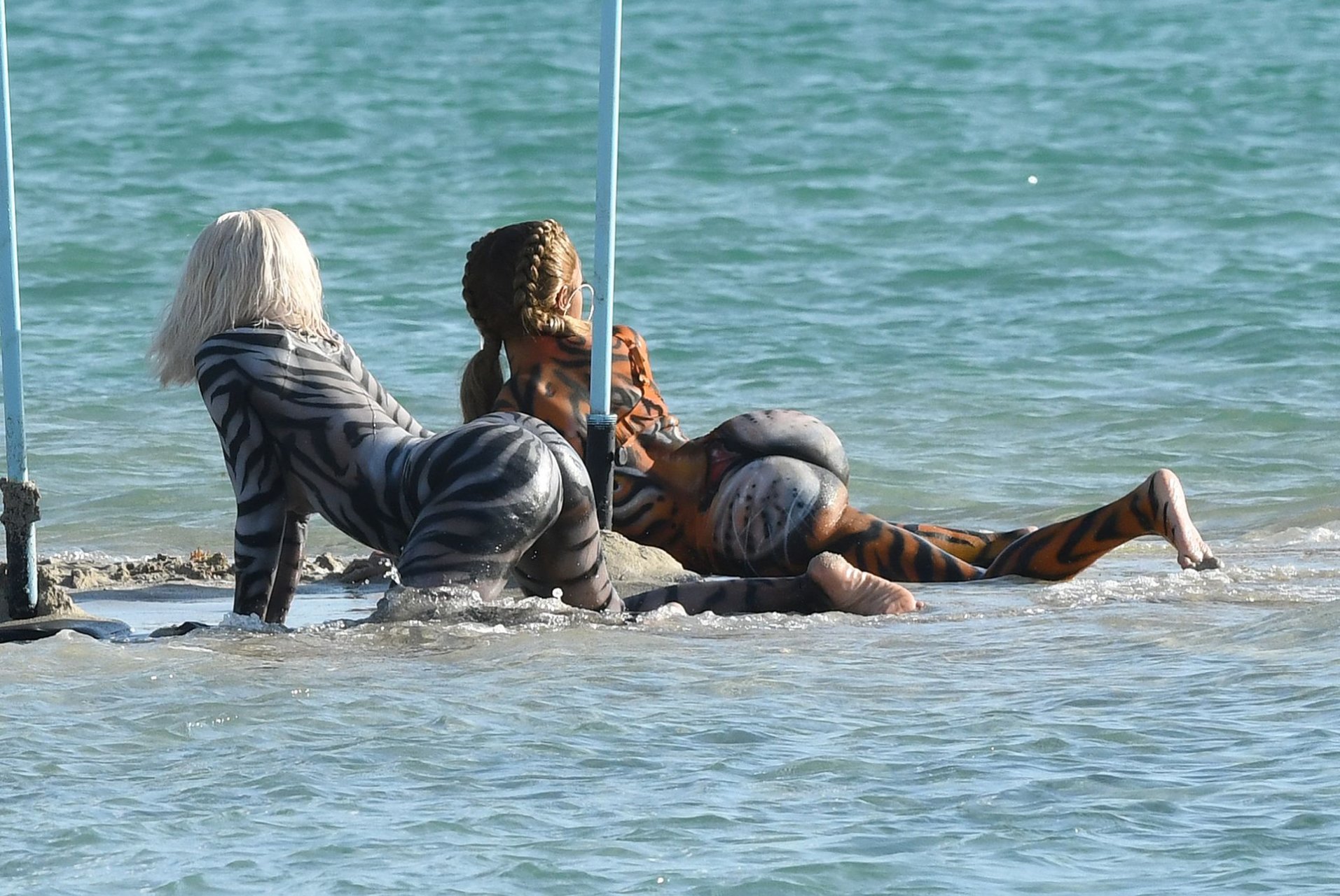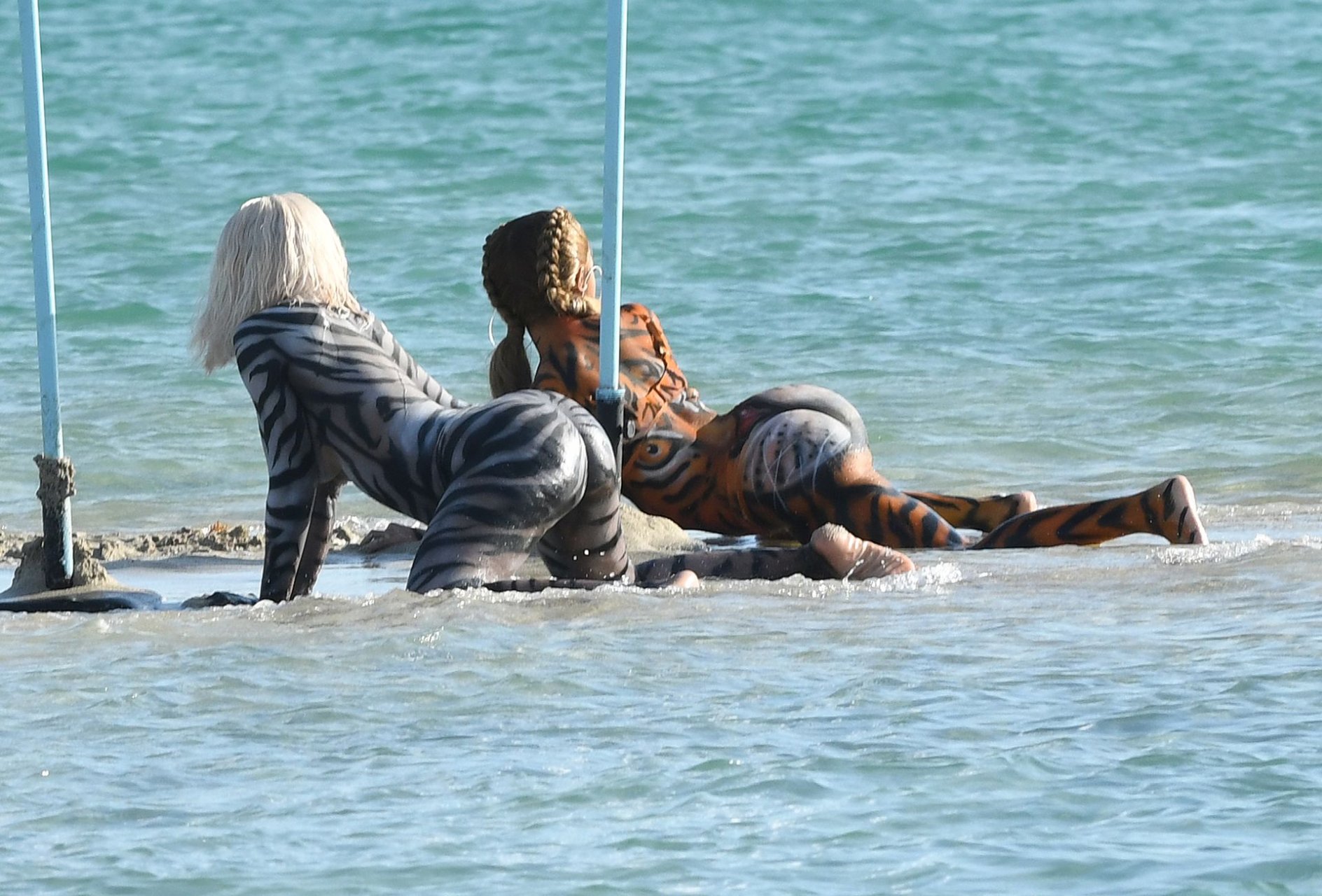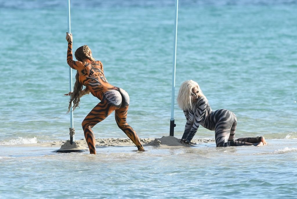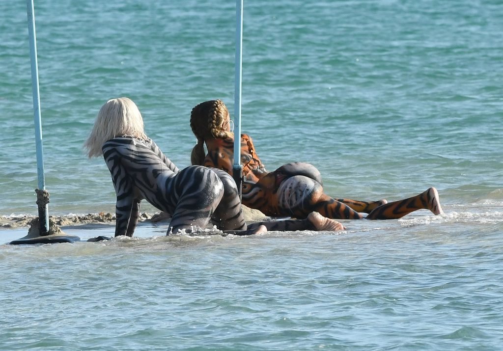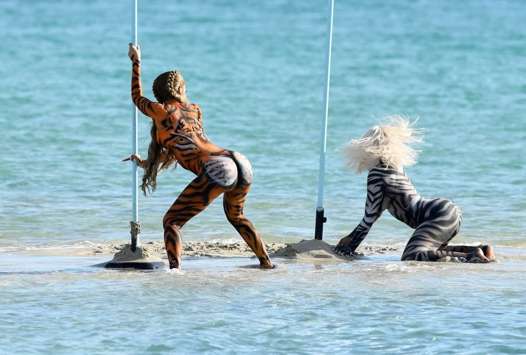 Рэперша Карди Би (Белкалис Алманзар) носит тигровую раскраску тела, танцуя тверк на яхте во время съемок видео в Майами, после того как пропустила судебное заседание в Нью-Йорке, 12/03/2018.