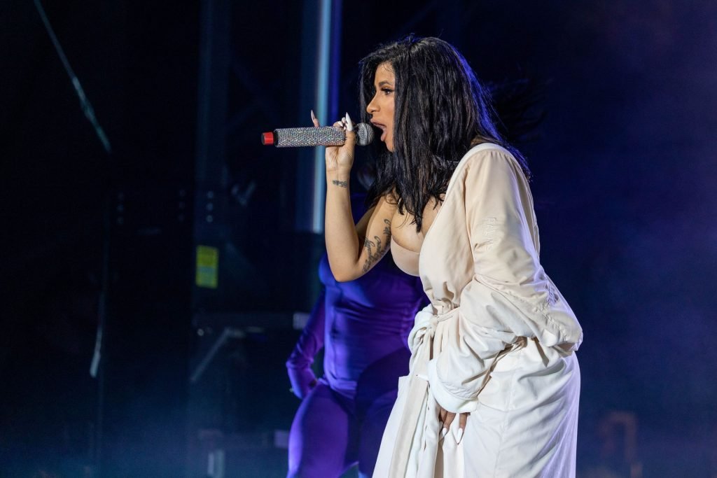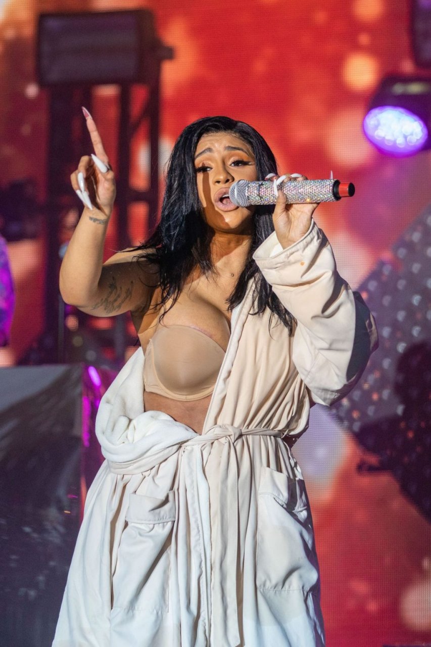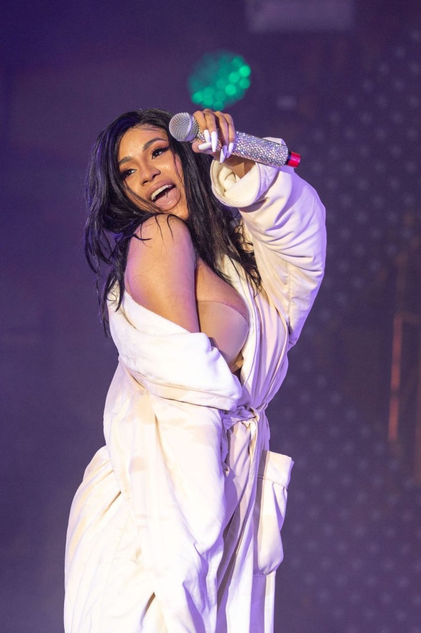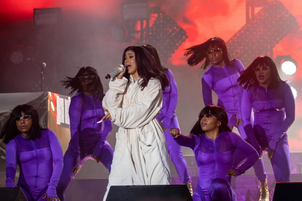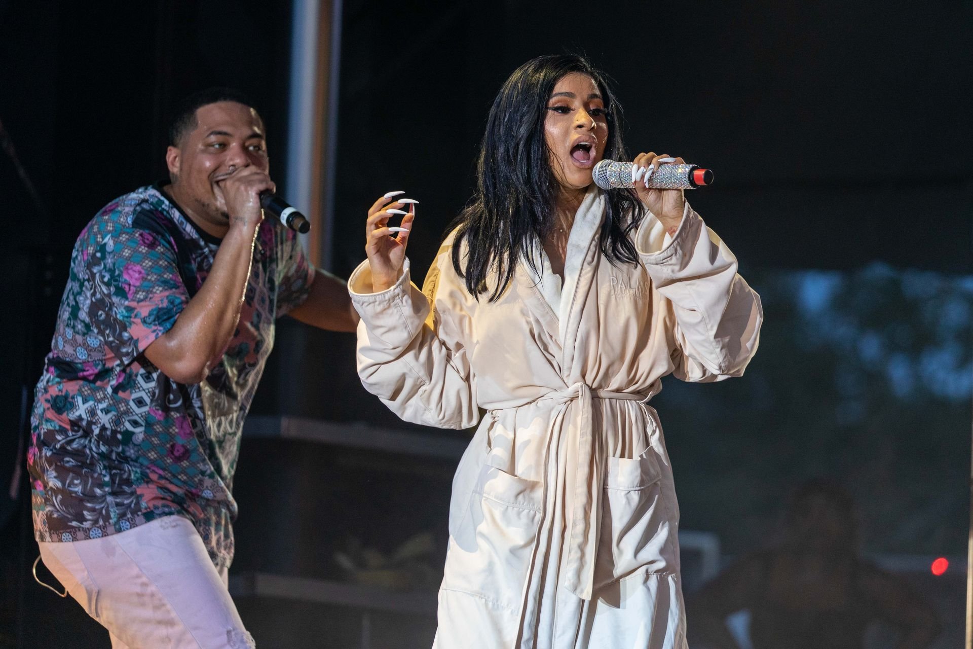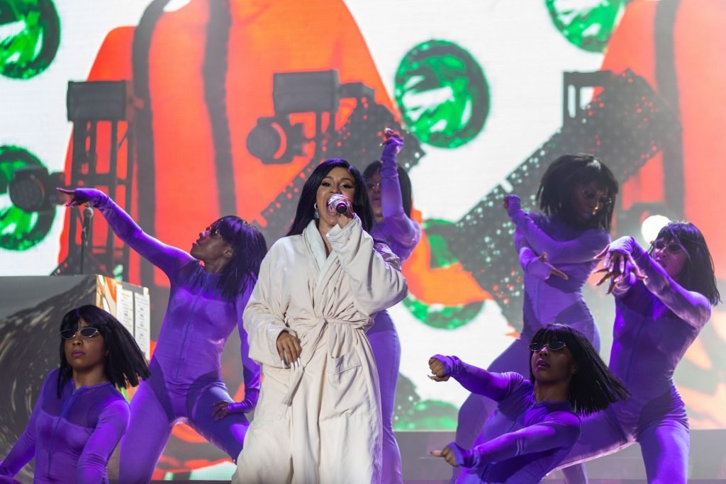 Певица Карди Би (Белкалис Алманзар) переодевается в банный халат, чтобы завершить своё выступление на фестивале Bonnaroo Music + Arts в Манчестере, Теннесси, 16.06.2019.
