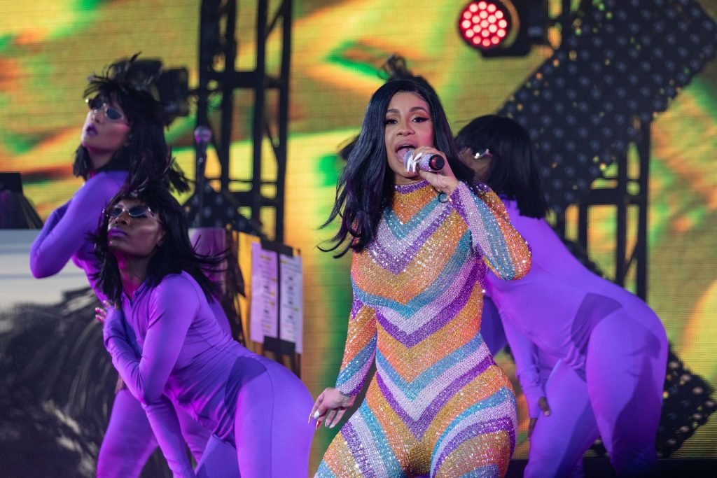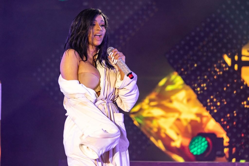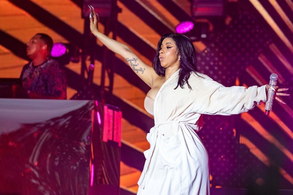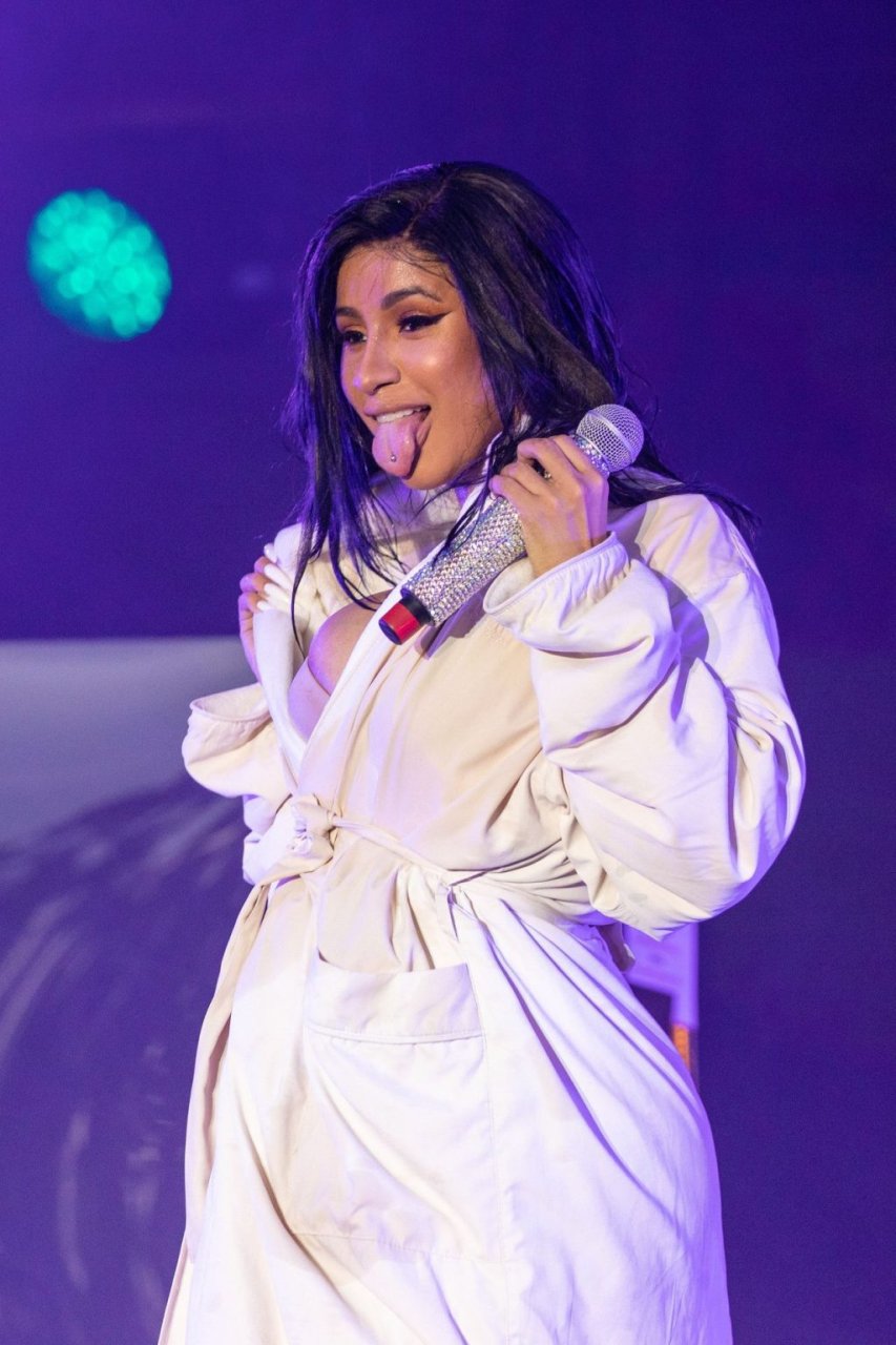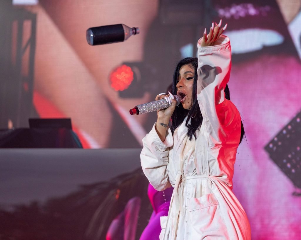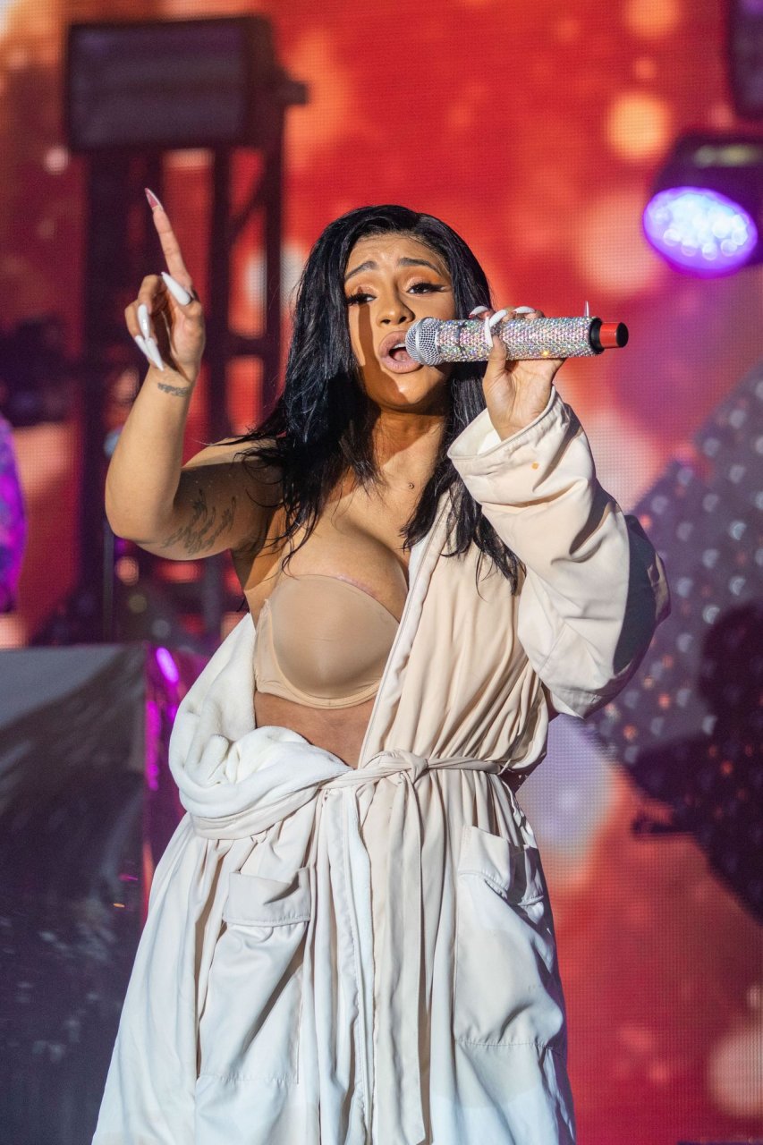 Певица Карди Би (Белкалис Алманзар) переодевается в банный халат, чтобы завершить своё выступление на фестивале Bonnaroo Music + Arts в Манчестере, Теннесси, 16.06.2019.