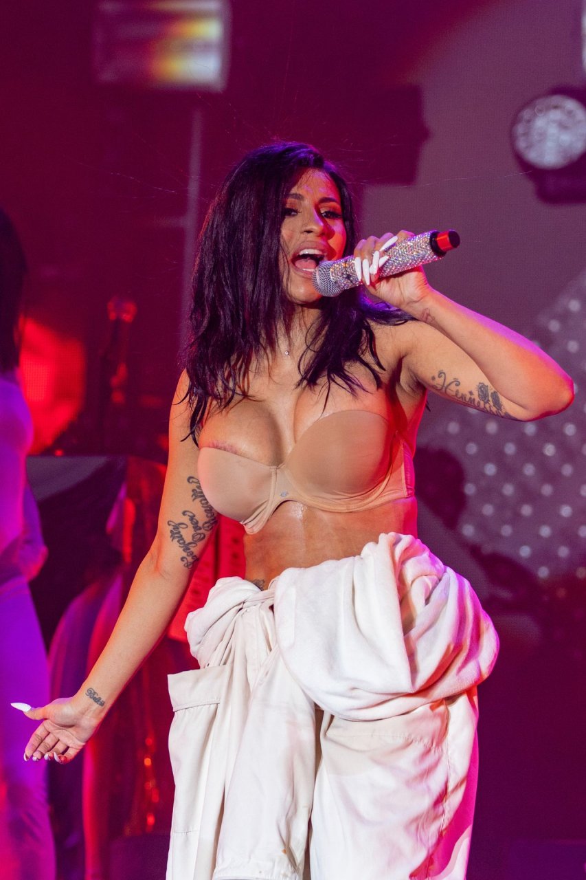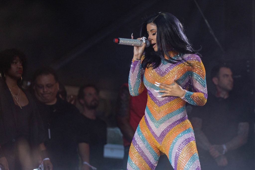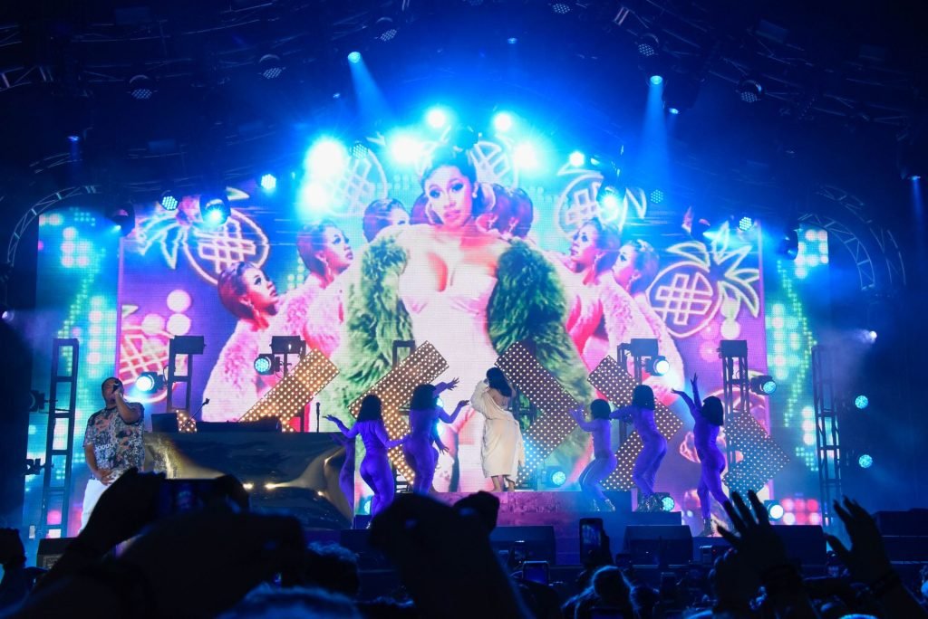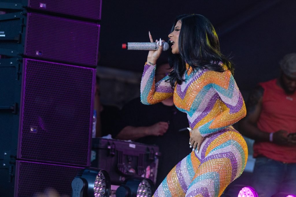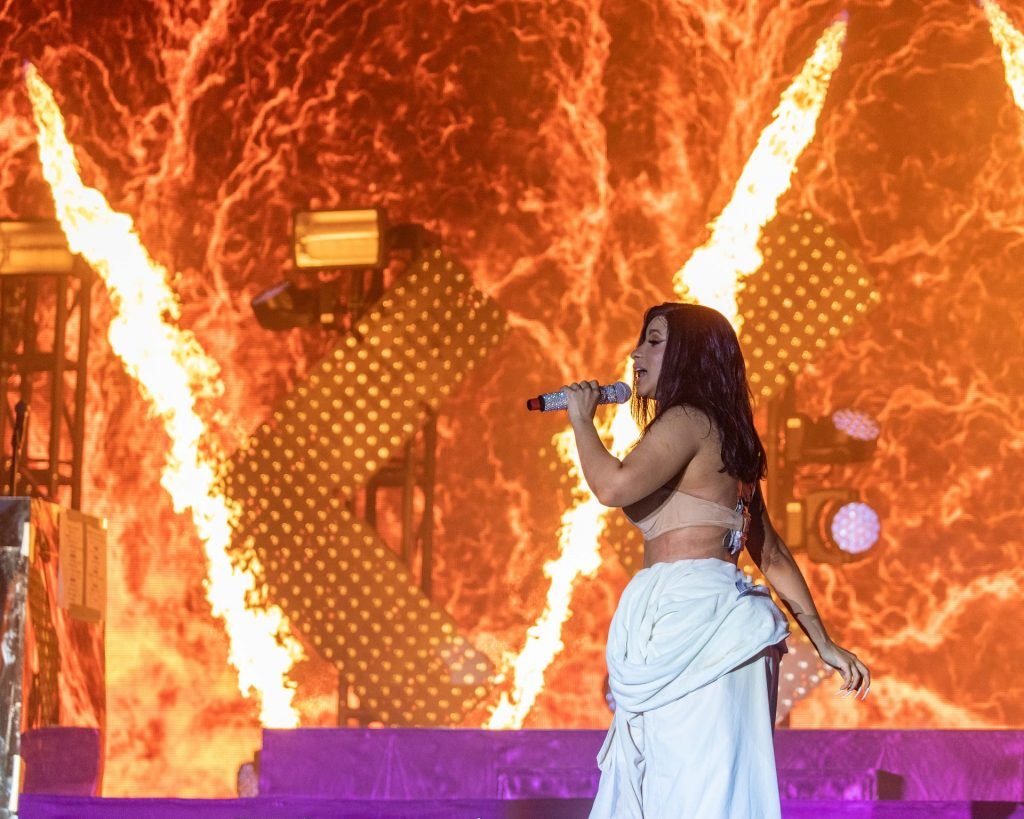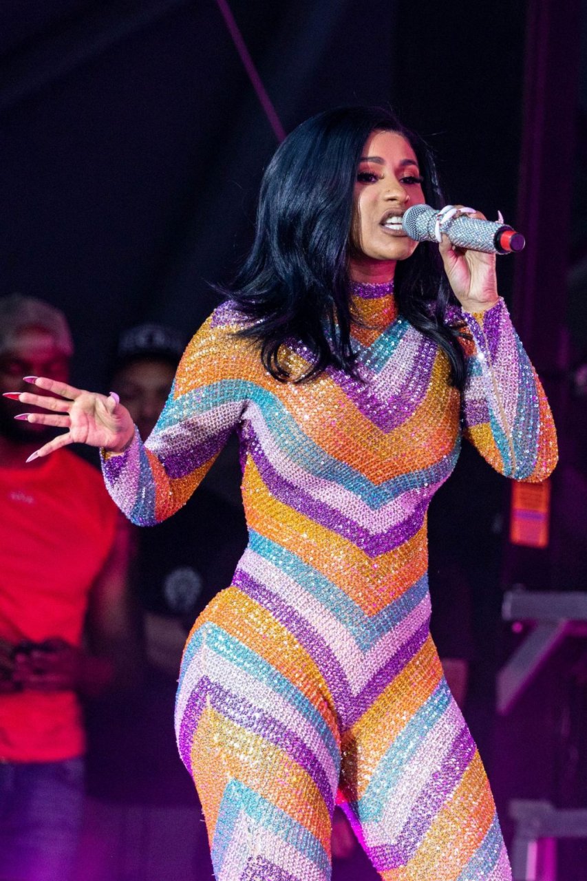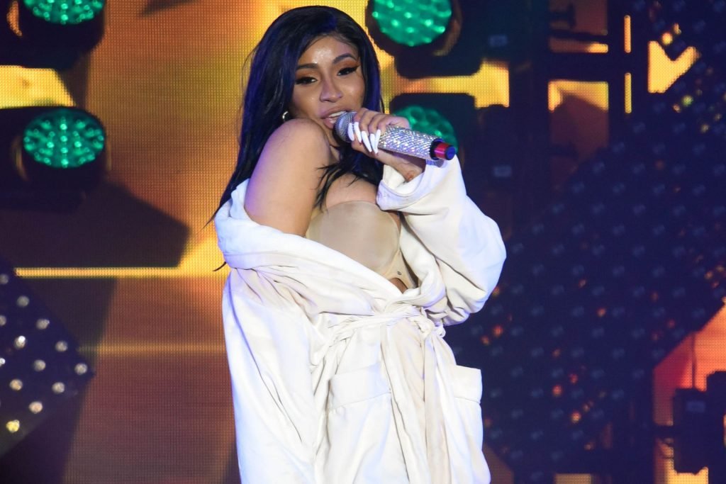 Певица Карди Би (Белкалис Алманзар) переодевается в банный халат, чтобы завершить своё выступление на фестивале Bonnaroo Music + Arts в Манчестере, Теннесси, 16.06.2019.