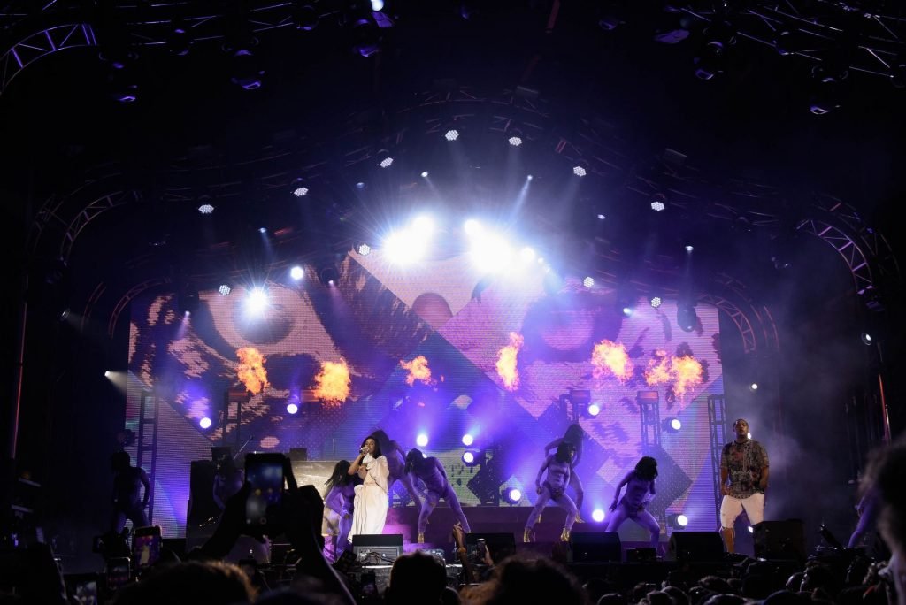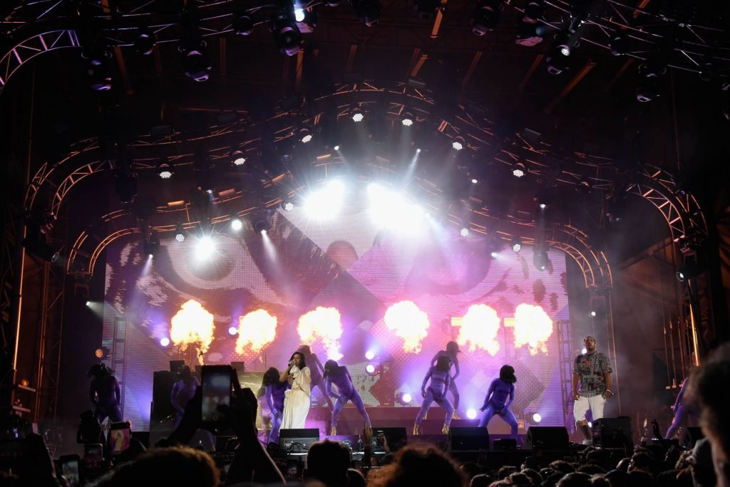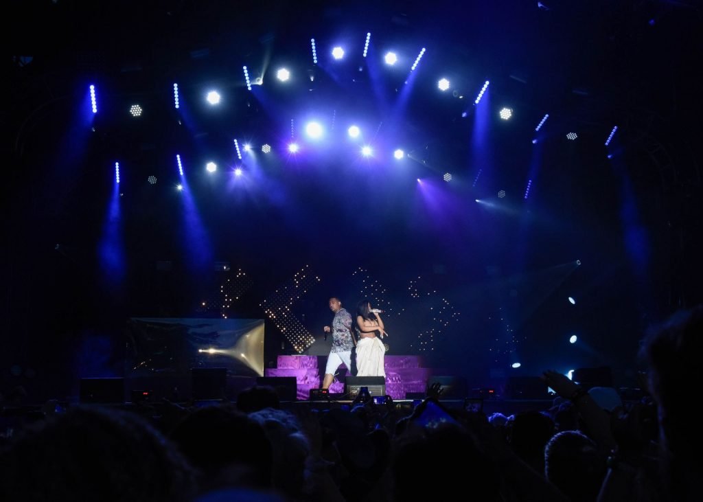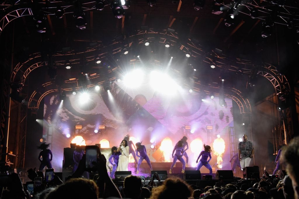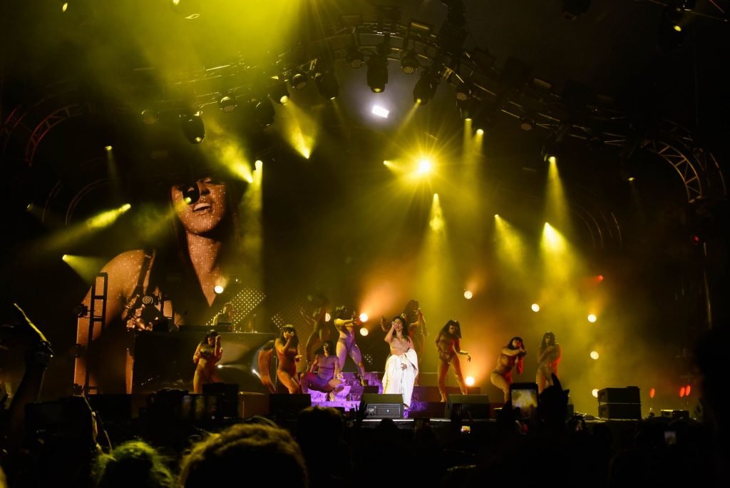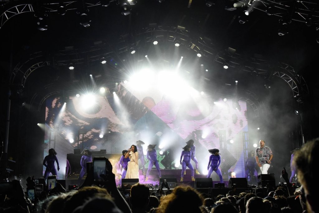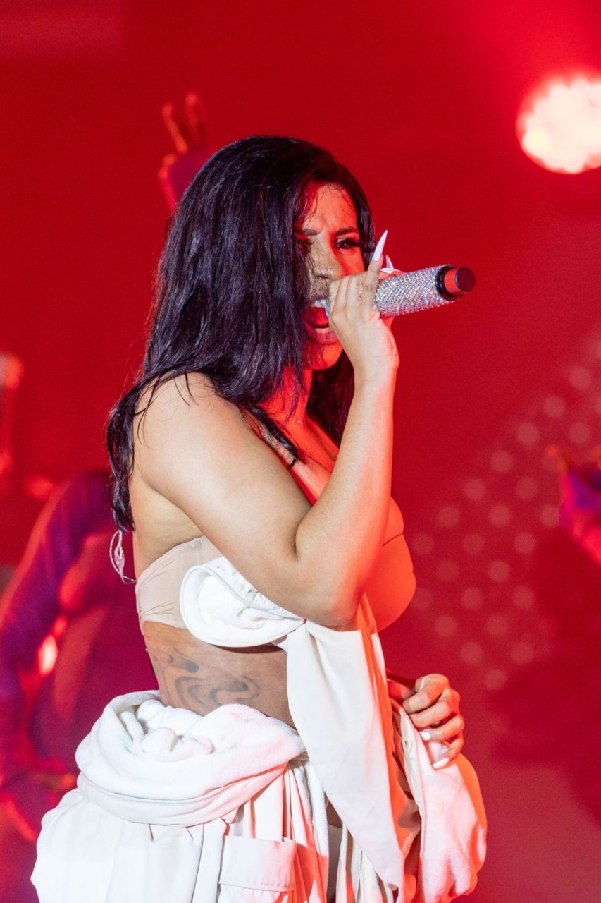 Певица Карди Би (Белкалис Алманзар) переодевается в банный халат, чтобы завершить своё выступление на фестивале Bonnaroo Music + Arts в Манчестере, Теннесси, 16.06.2019.