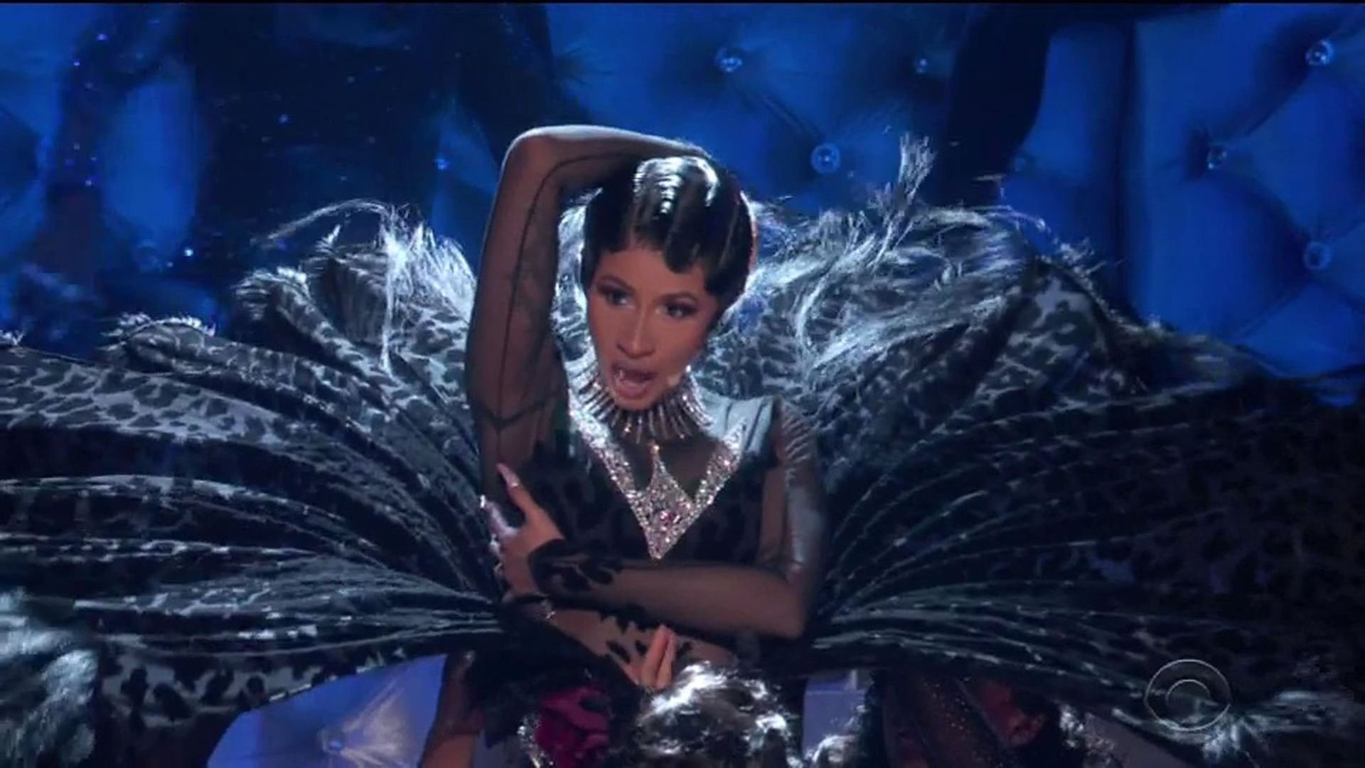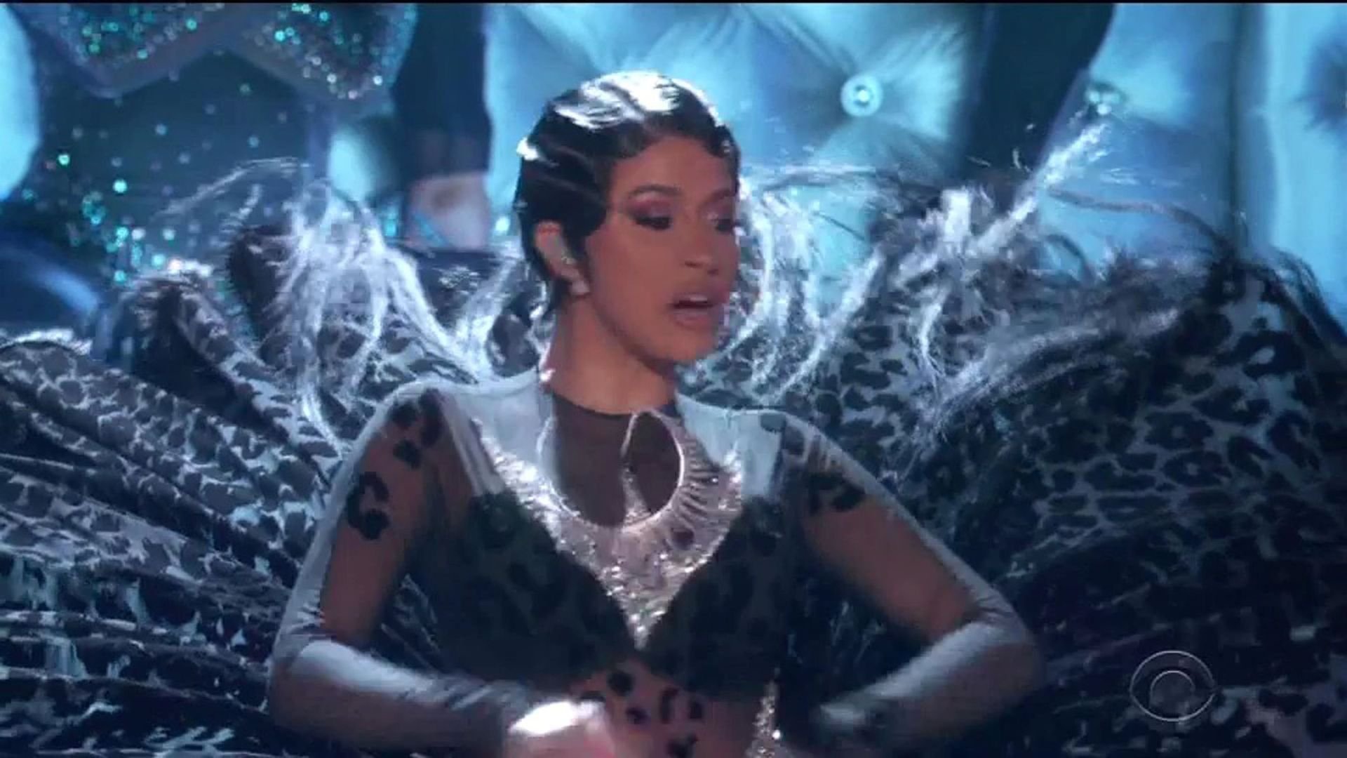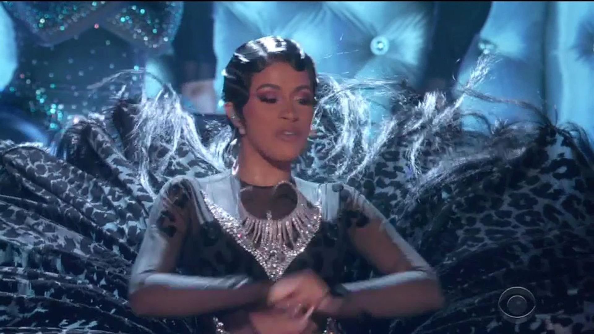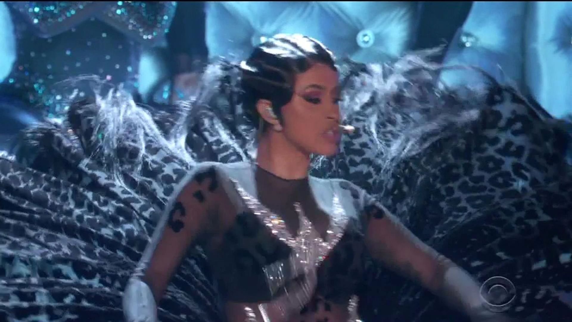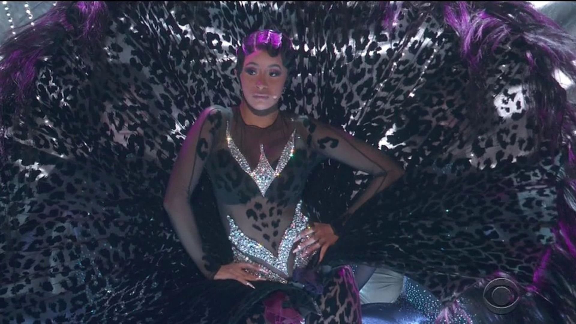 Карди Би справляется с проблемой с гардеробом, связанной с бриллиантовым ожерельем, во время выступления на церемонии Grammy Awards, 02/10/2019.