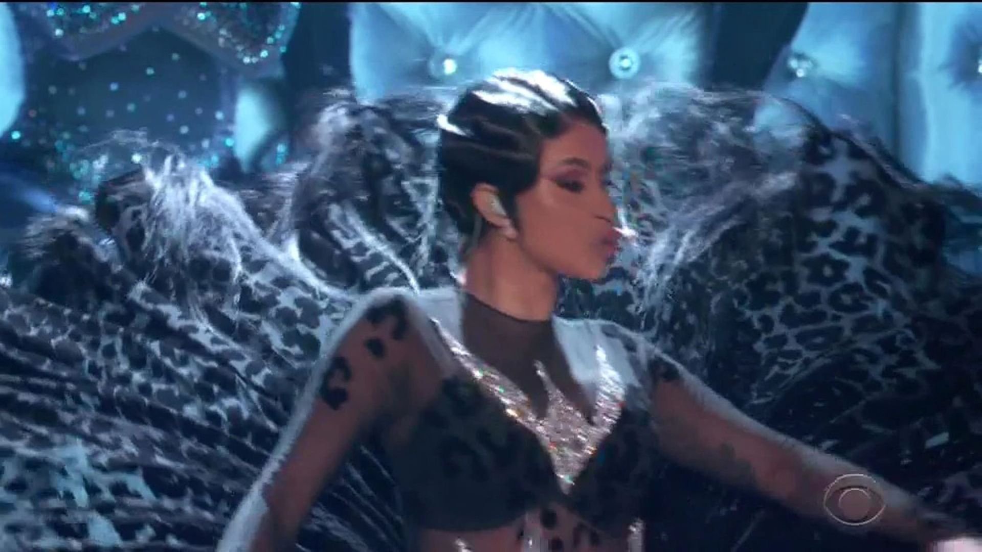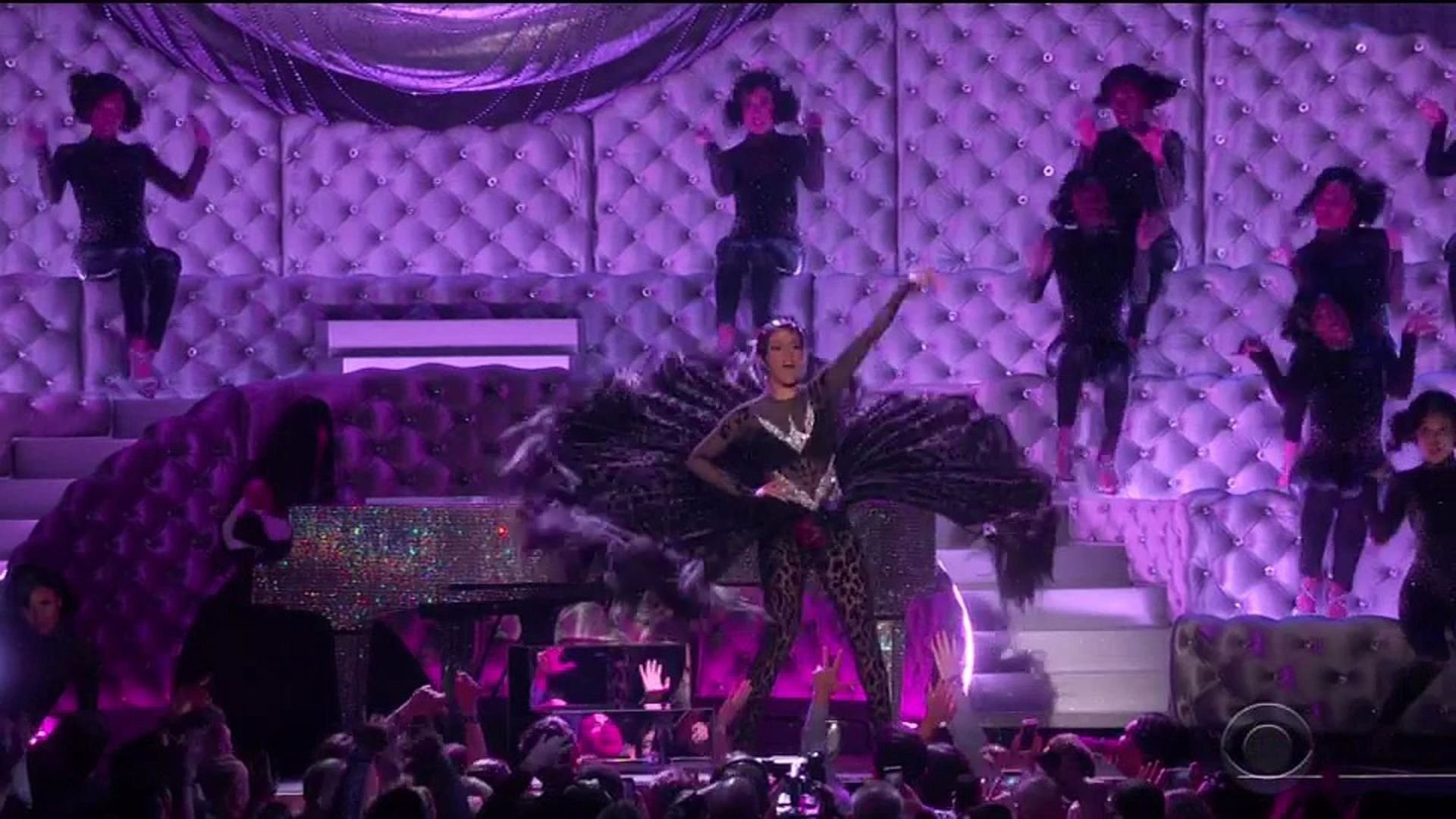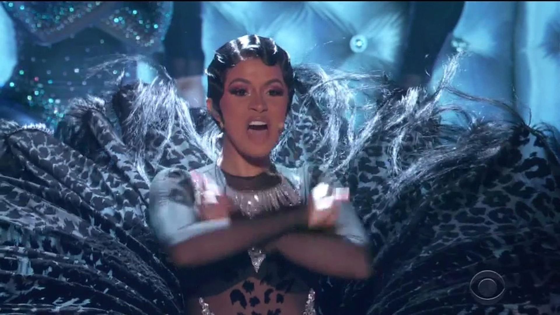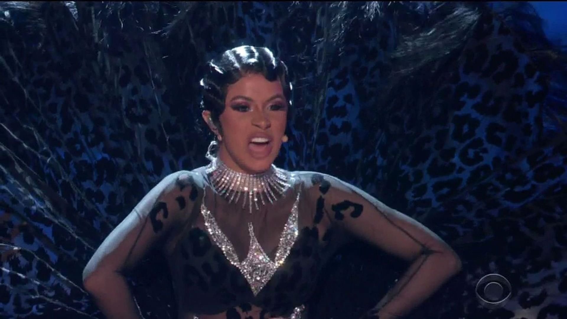 Карди Би справляется с проблемой с гардеробом, связанной с бриллиантовым ожерельем, во время выступления на церемонии Grammy Awards, 02/10/2019.