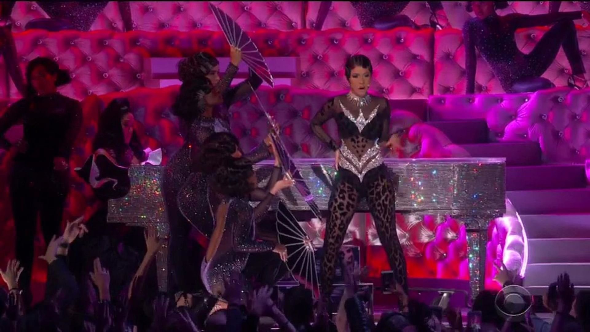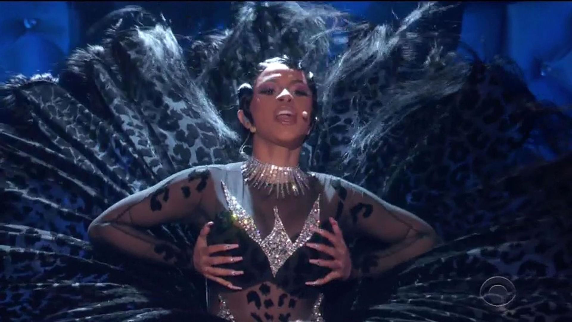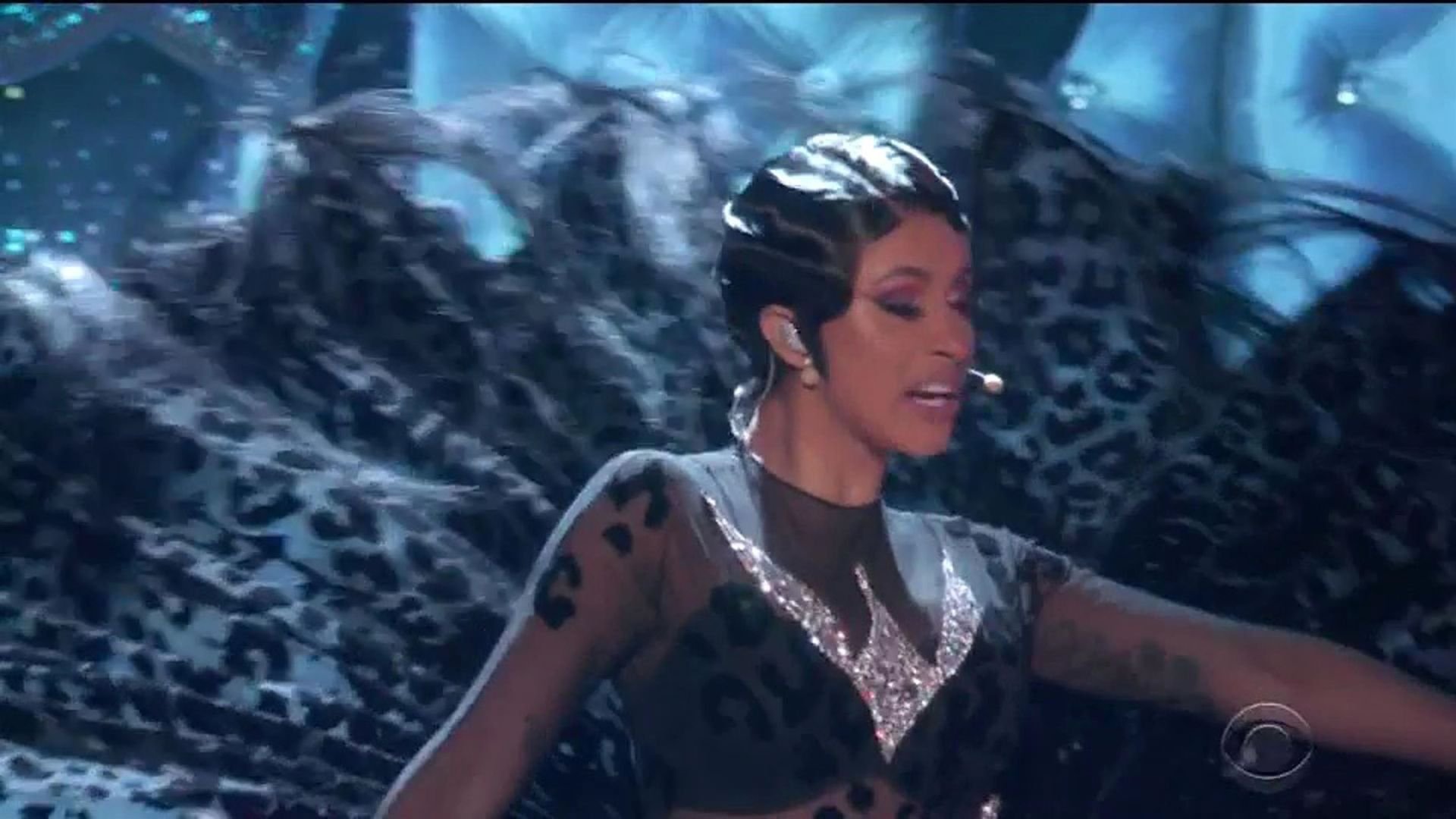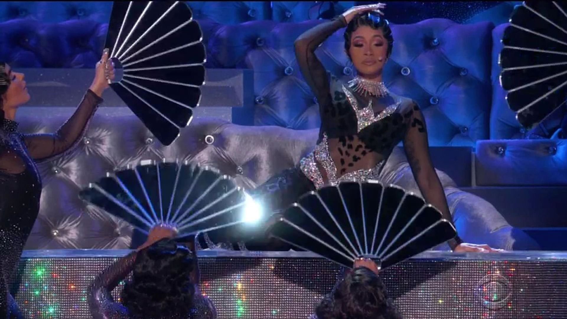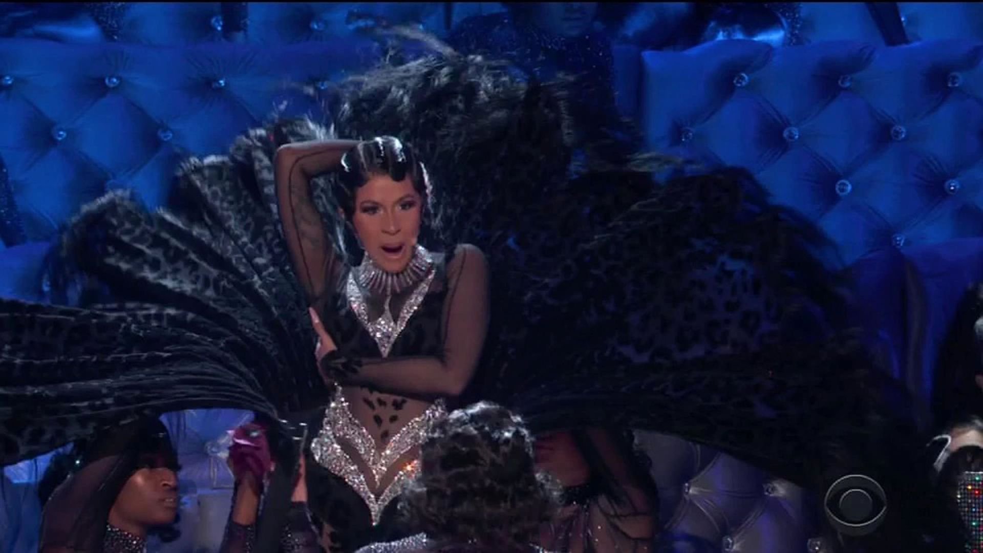 Карди Би справляется с проблемой с гардеробом, связанной с бриллиантовым ожерельем, во время выступления на церемонии Grammy Awards, 02/10/2019.