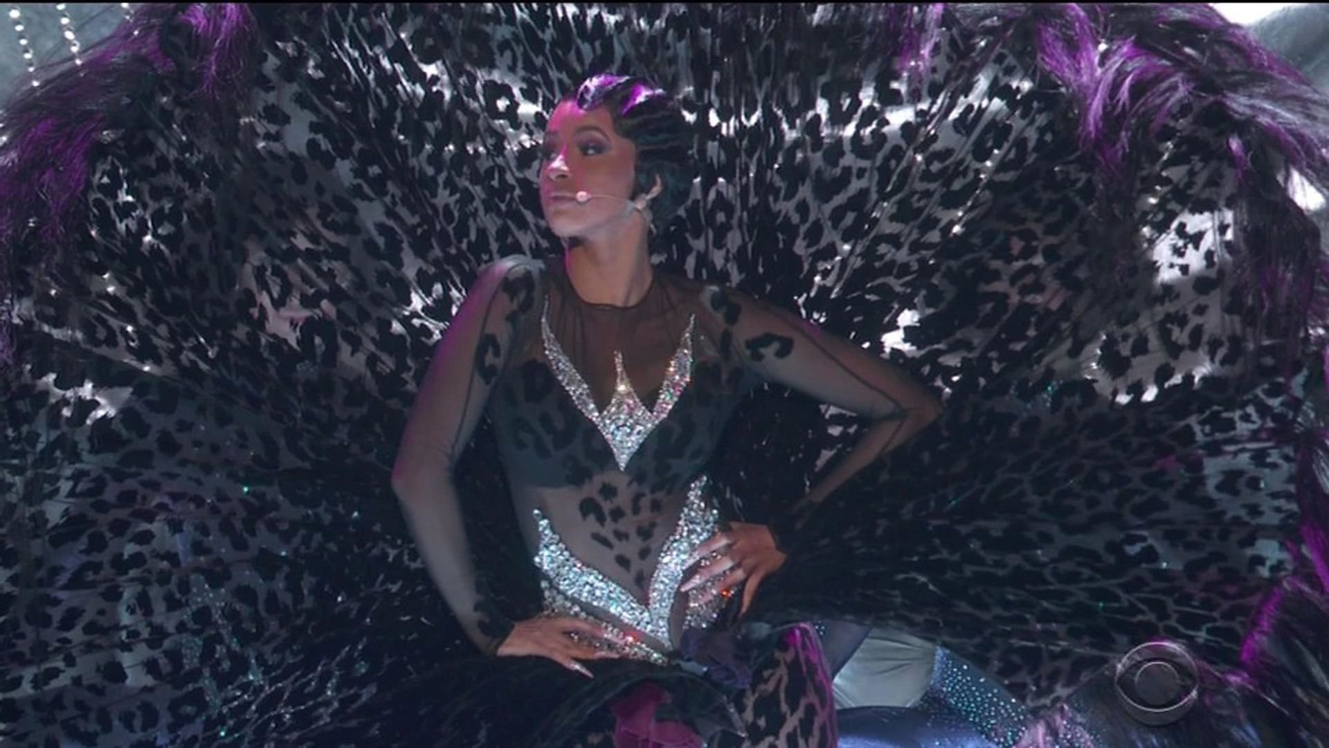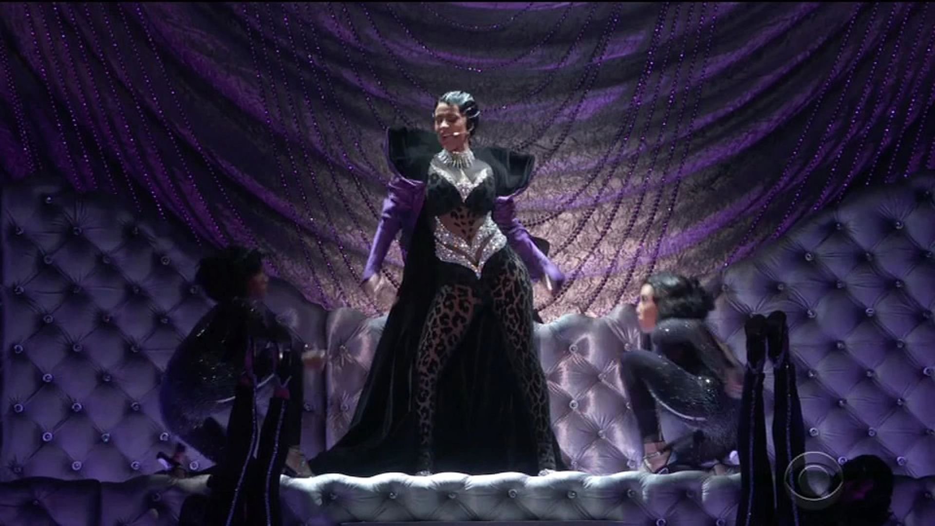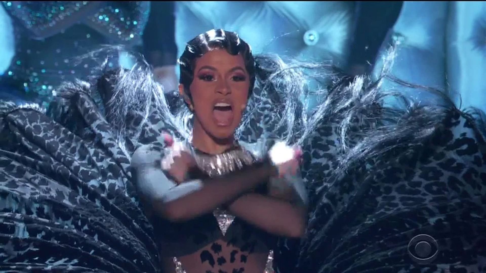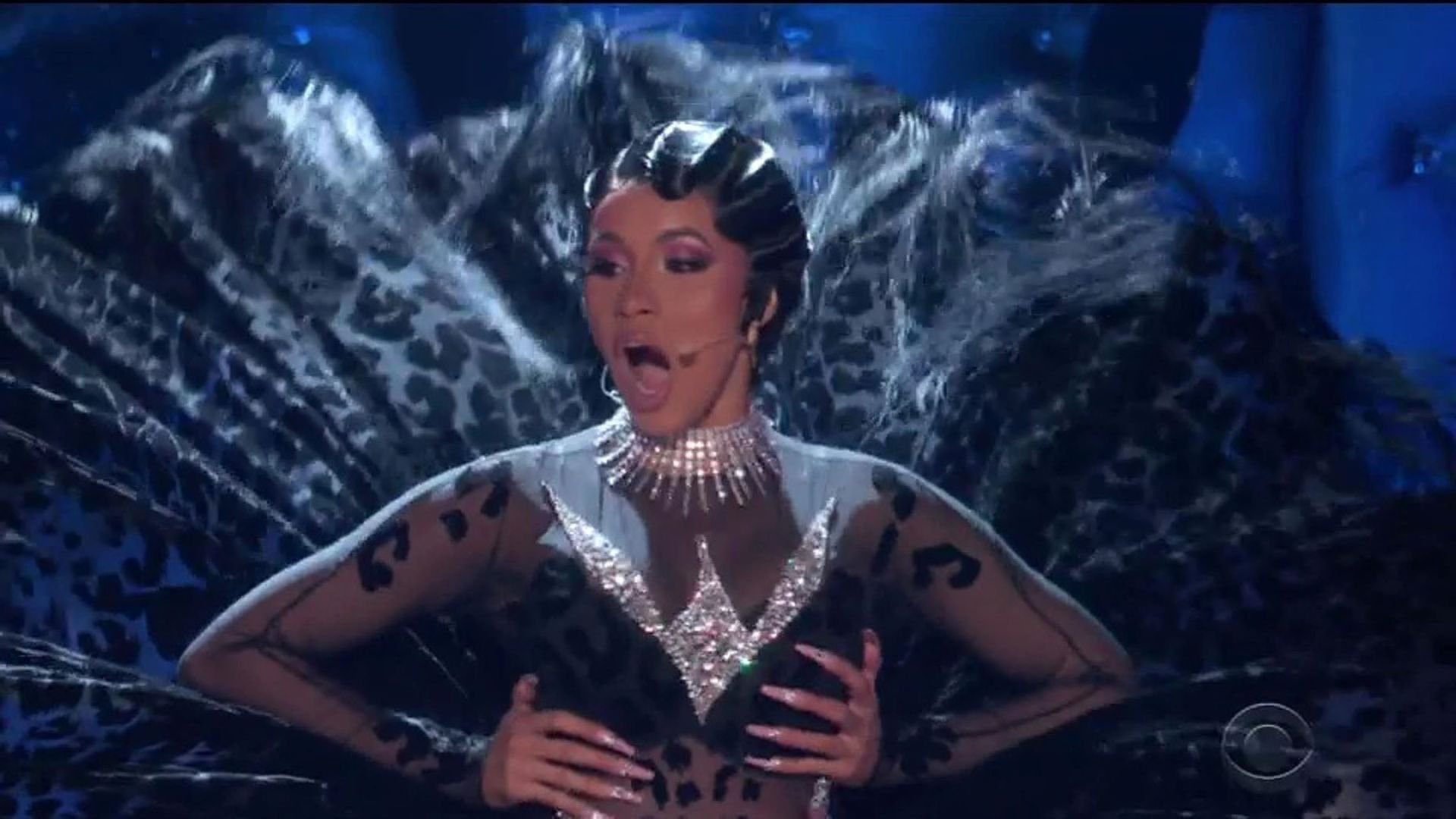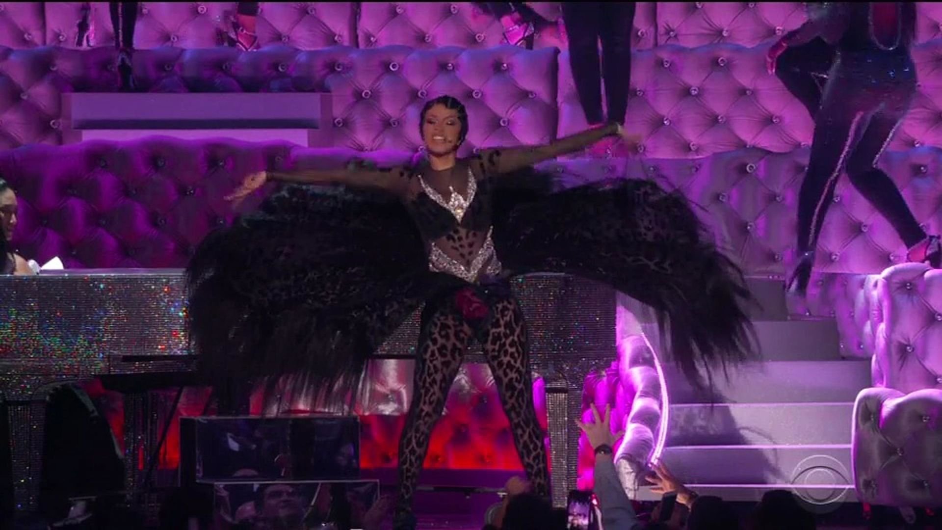 Карди Би справляется с проблемой с гардеробом, связанной с бриллиантовым ожерельем, во время выступления на церемонии Grammy Awards, 02/10/2019.