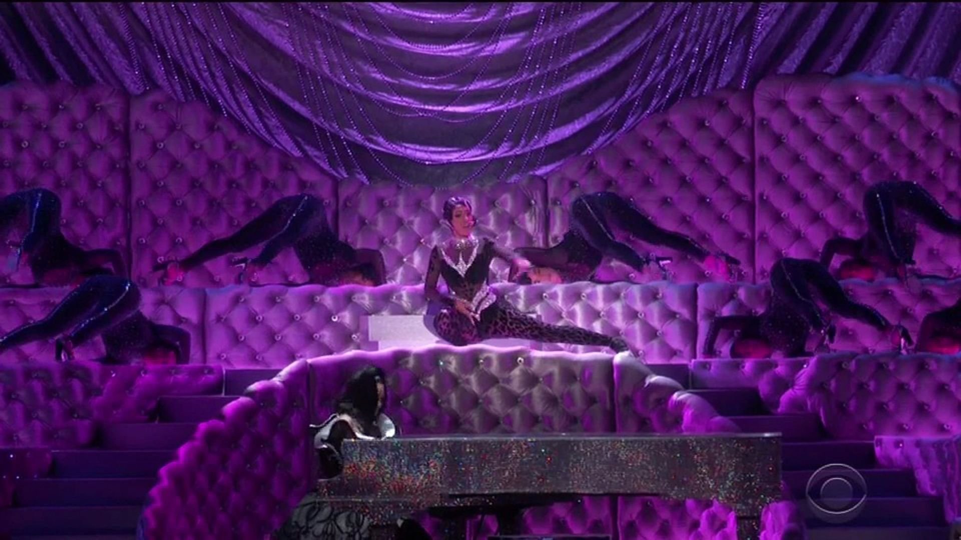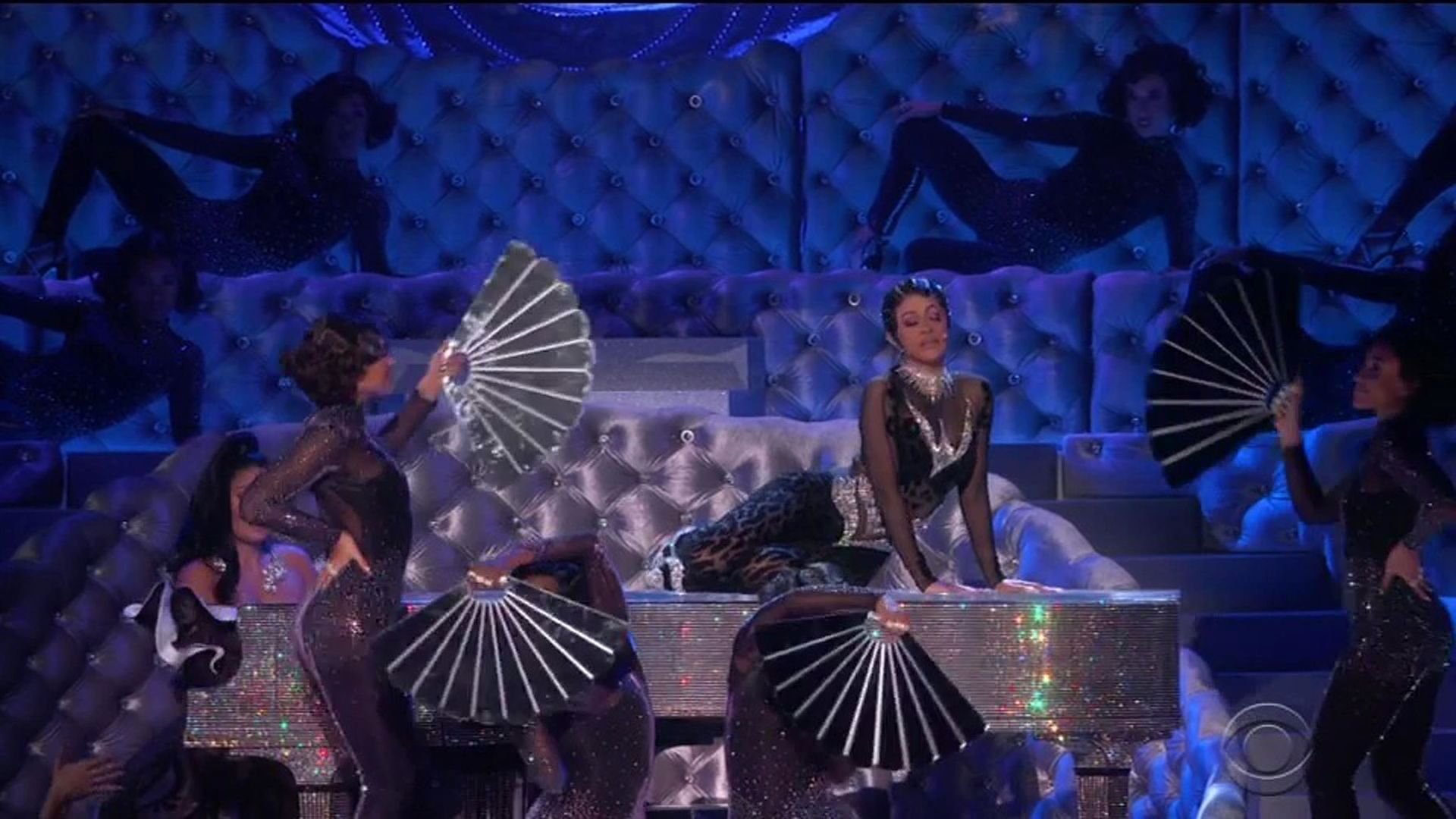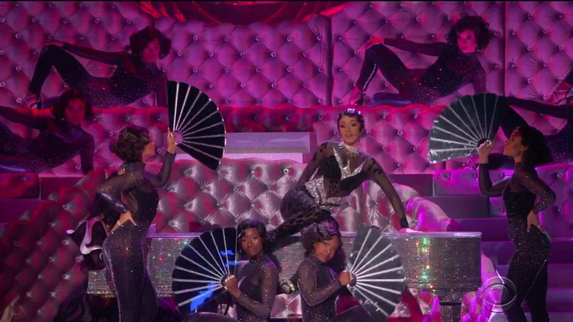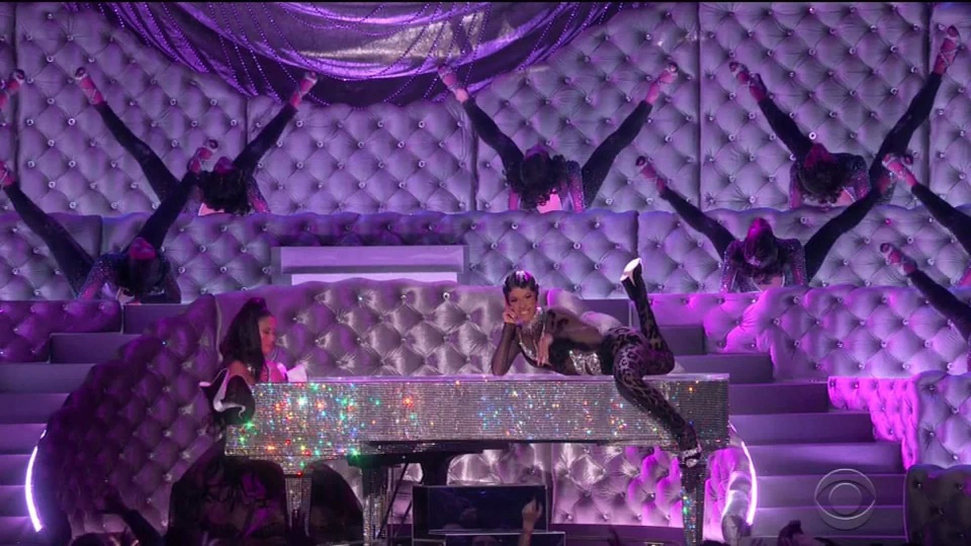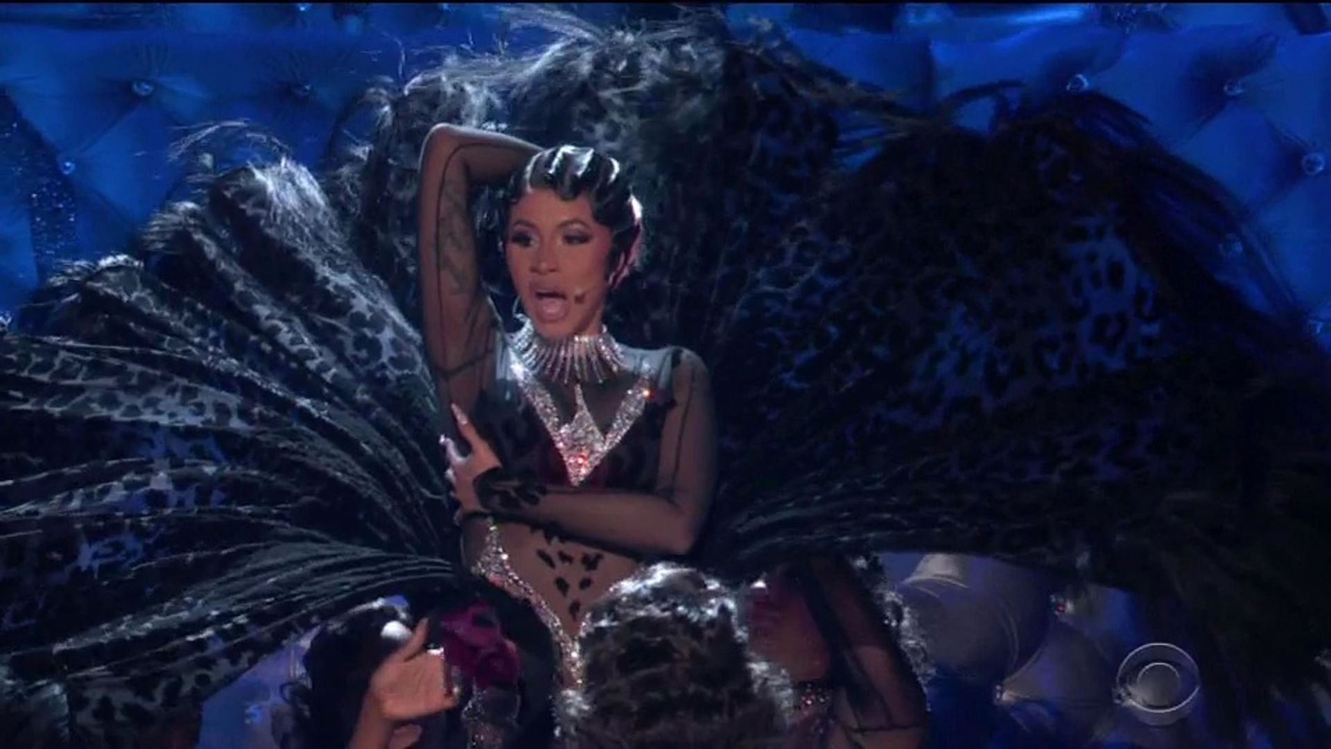 Карди Би справляется с проблемой с гардеробом, связанной с бриллиантовым ожерельем, во время выступления на церемонии Grammy Awards, 02/10/2019.
