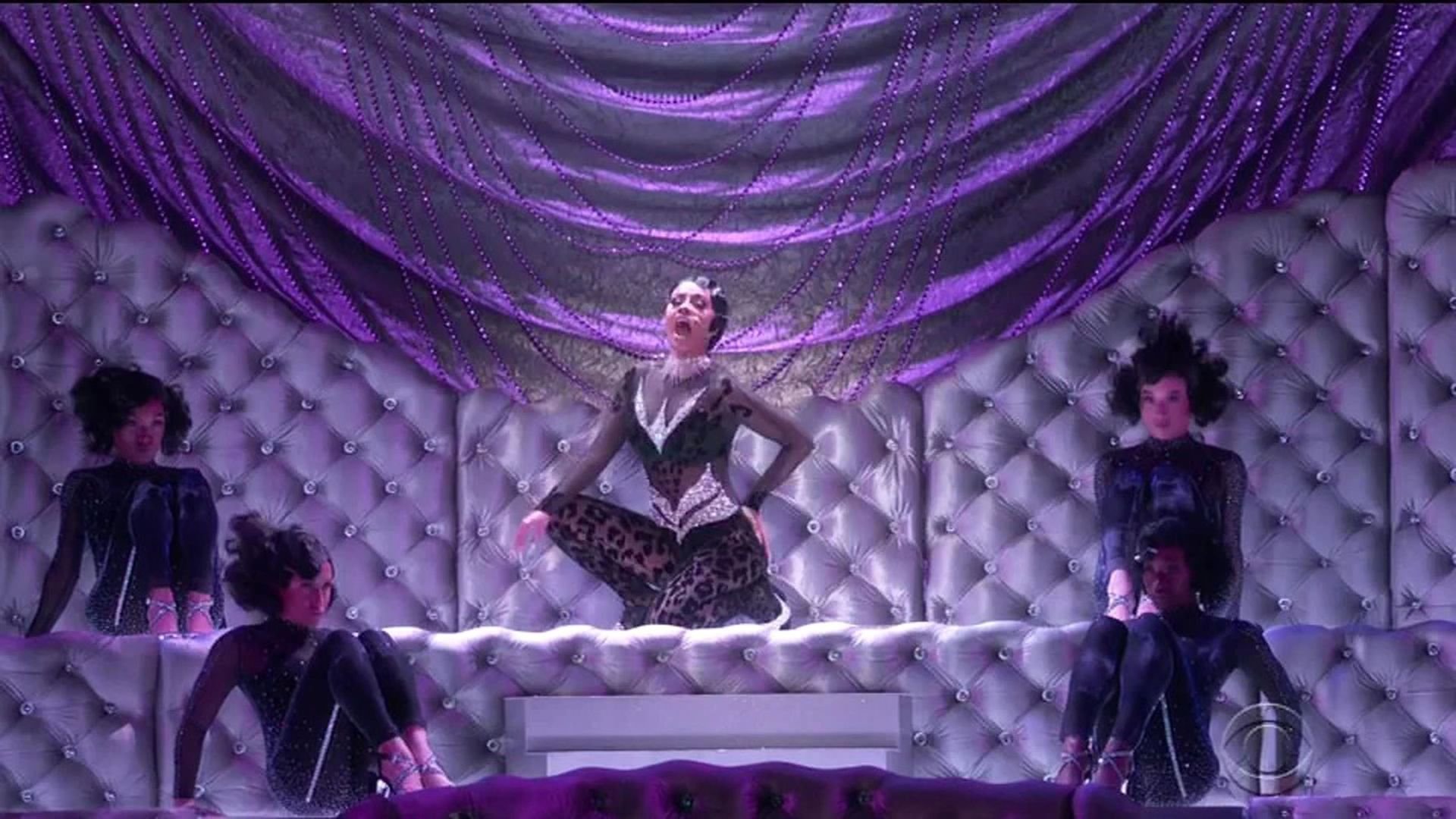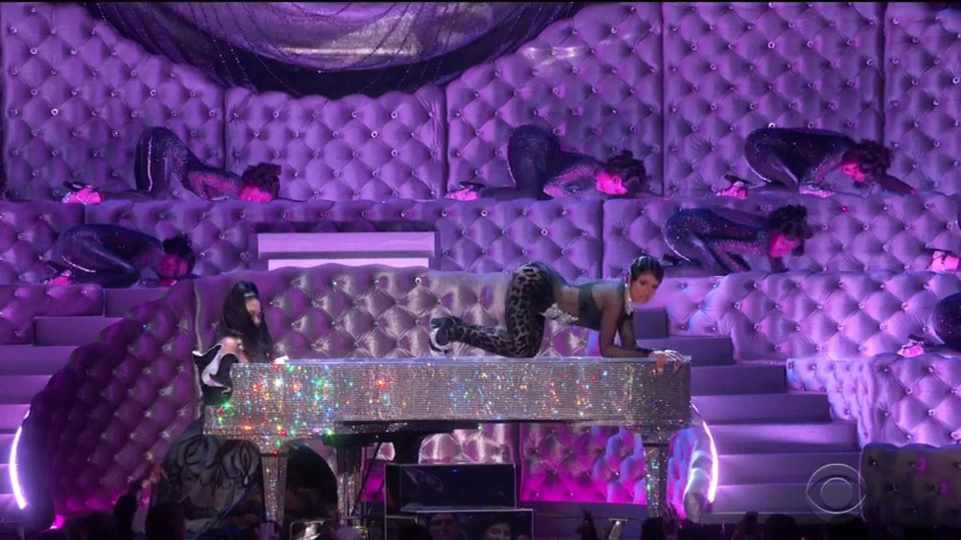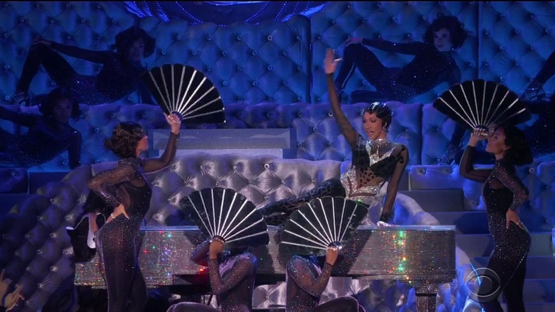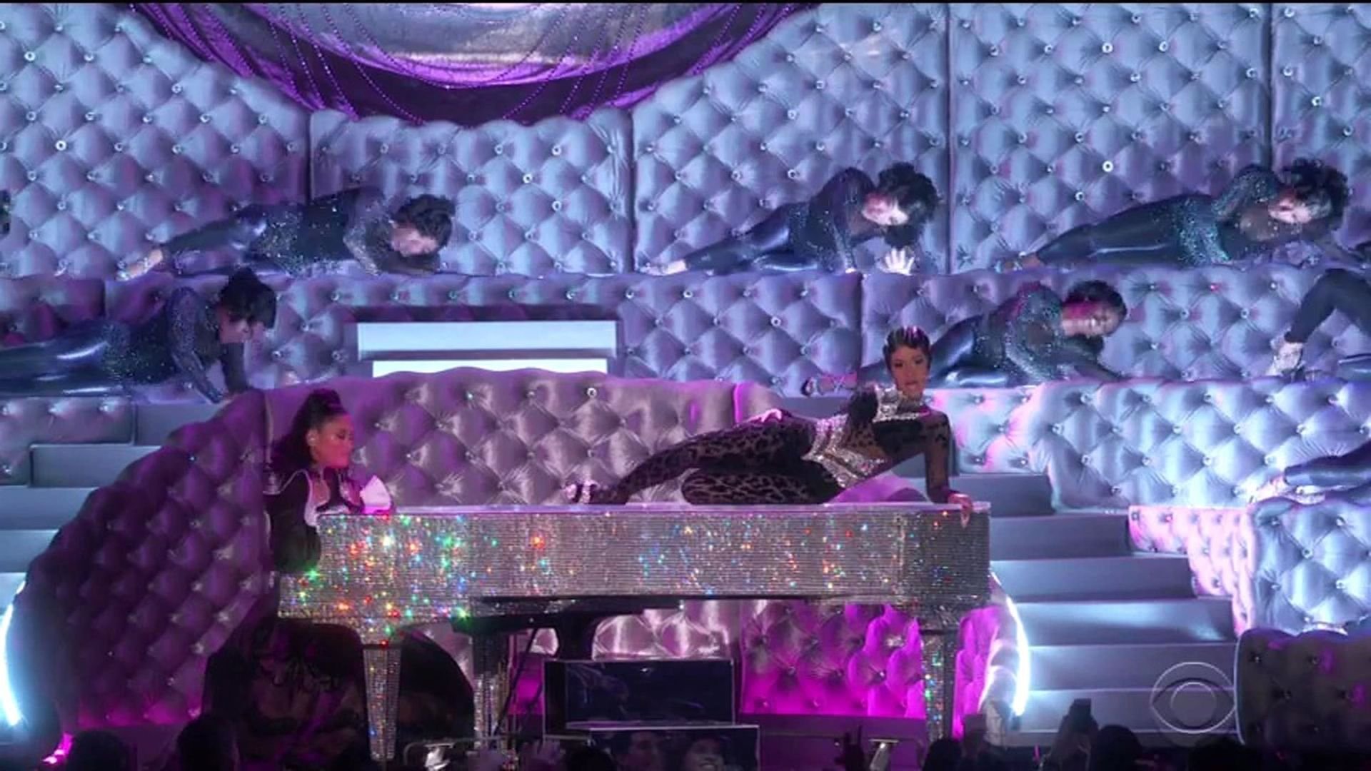 Карди Би справляется с проблемой с гардеробом, связанной с бриллиантовым ожерельем, во время выступления на церемонии Grammy Awards, 02/10/2019.