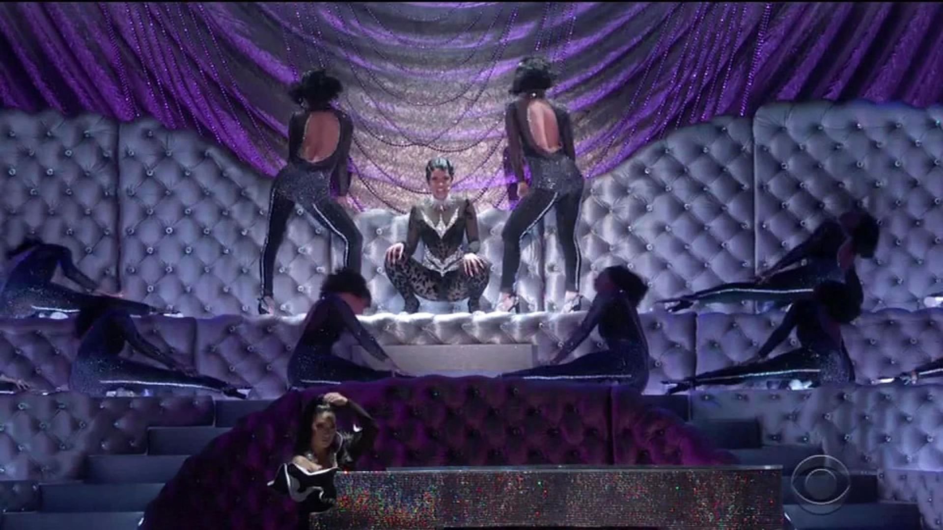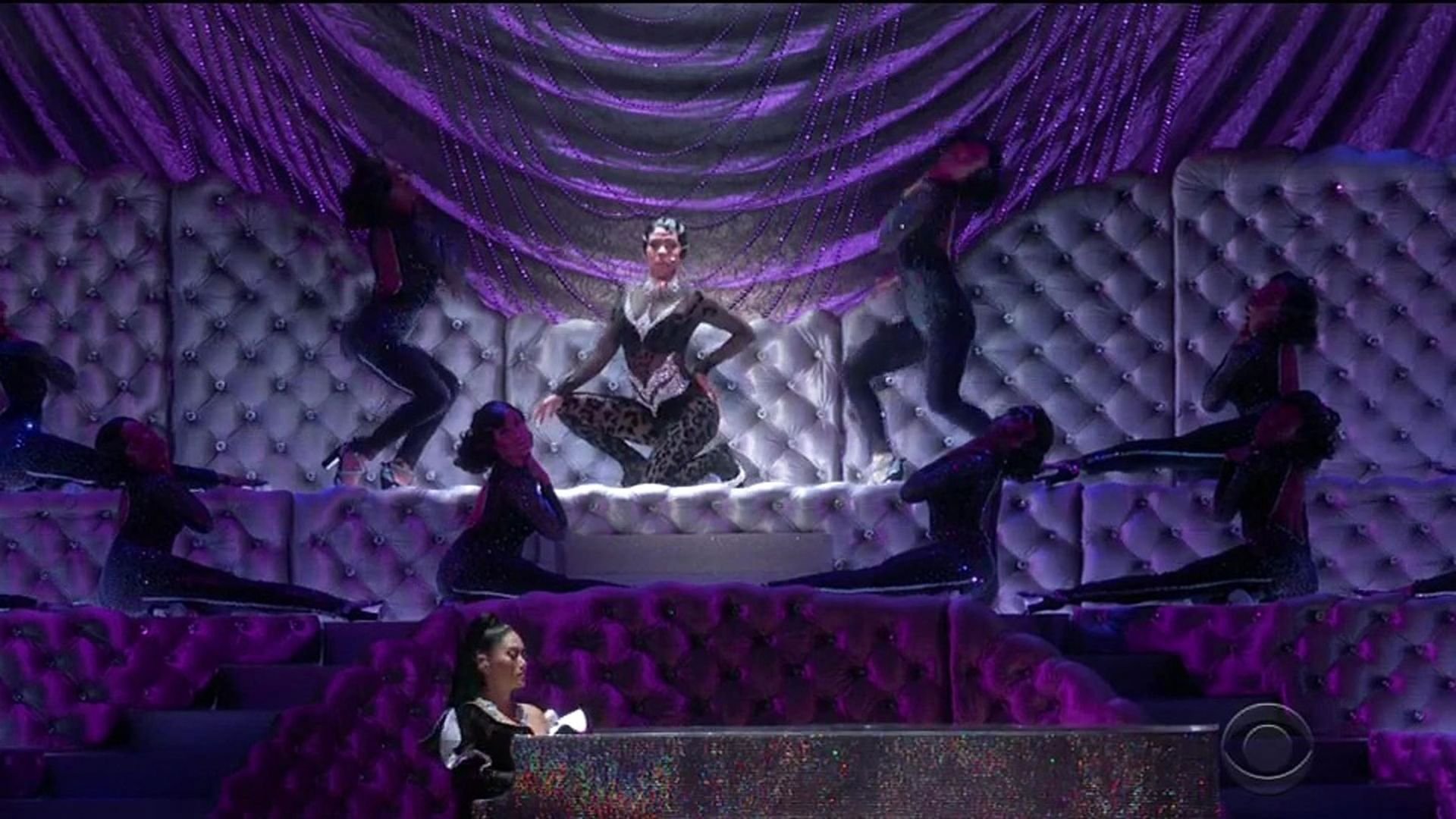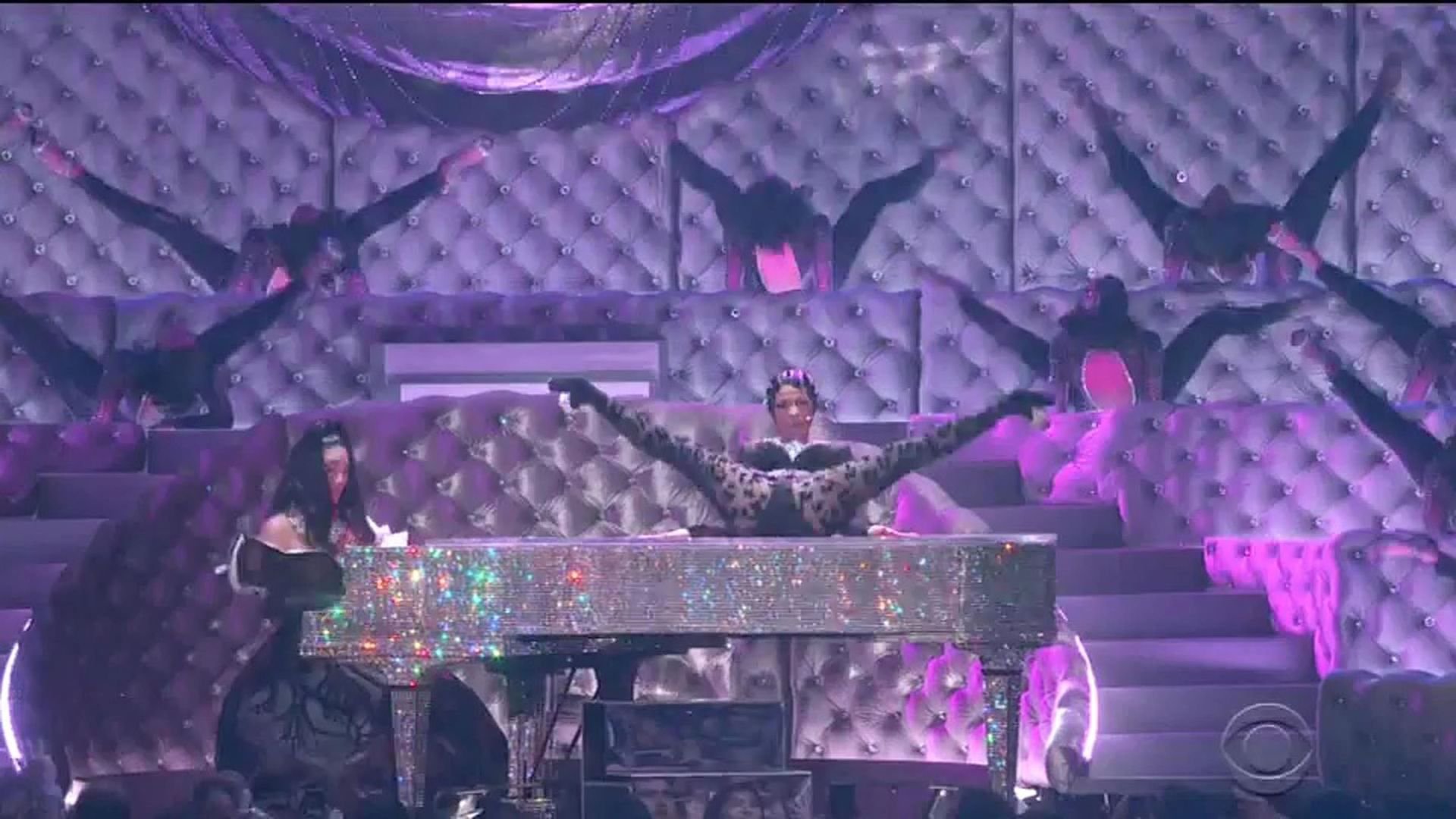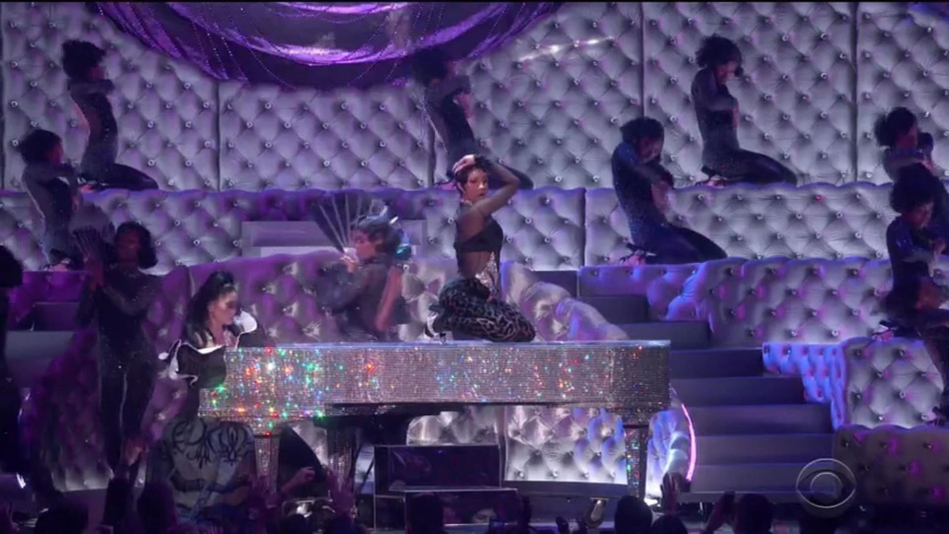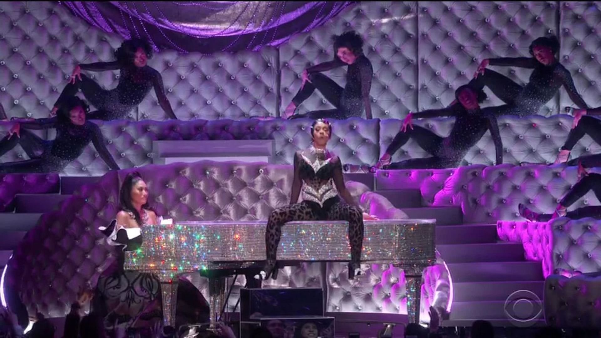 Карди Би справляется с проблемой с гардеробом, связанной с бриллиантовым ожерельем, во время выступления на церемонии Grammy Awards, 02/10/2019.