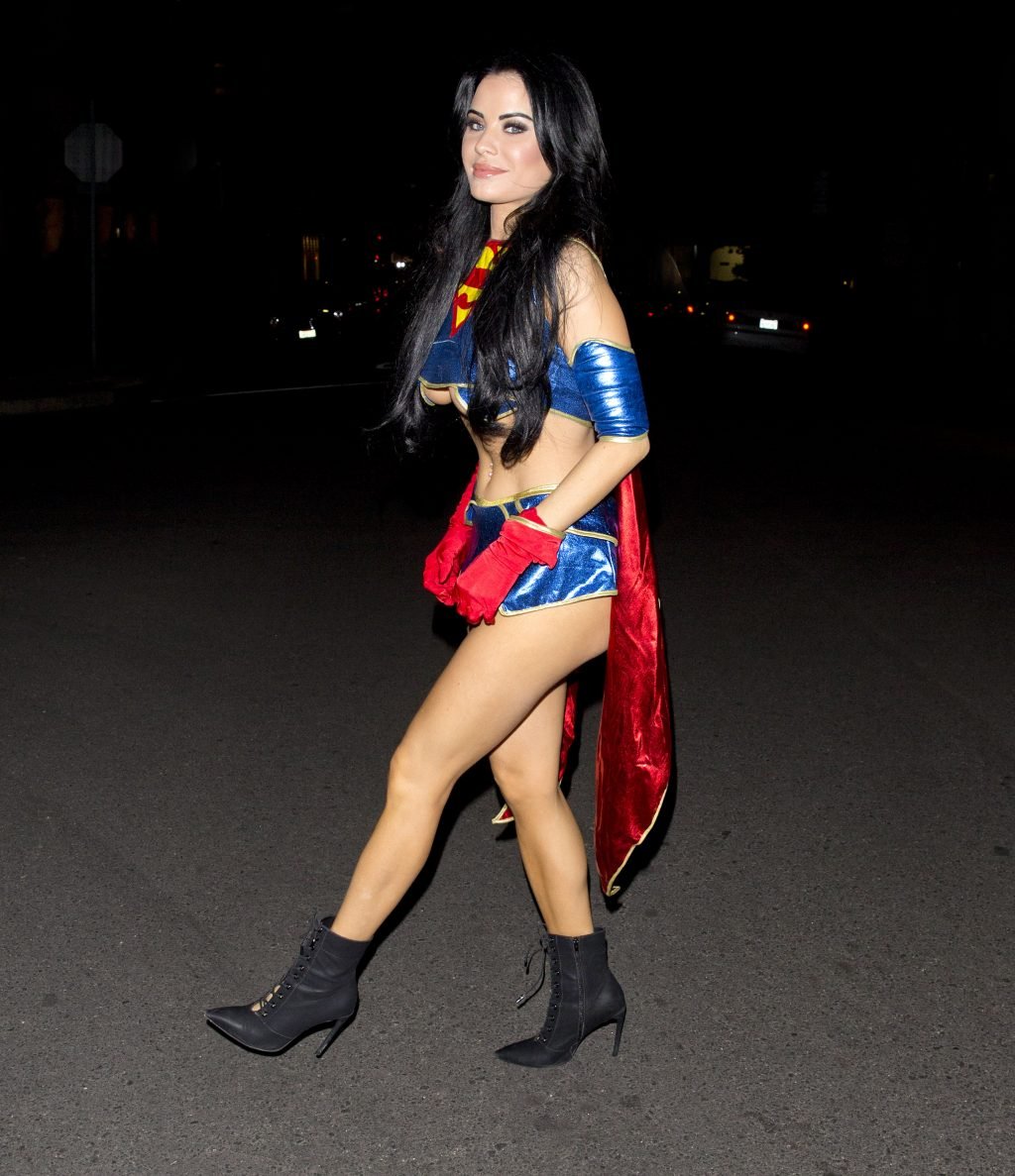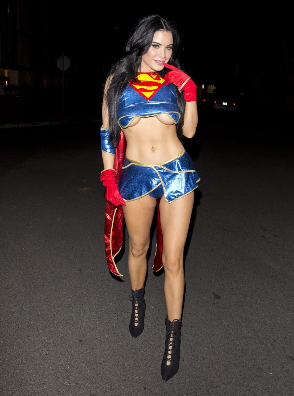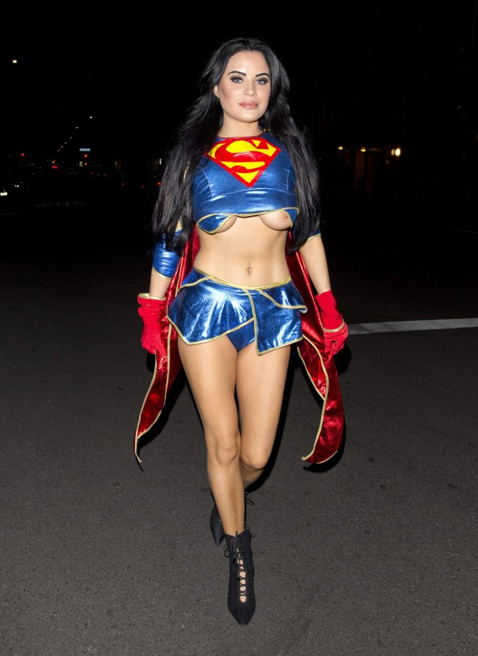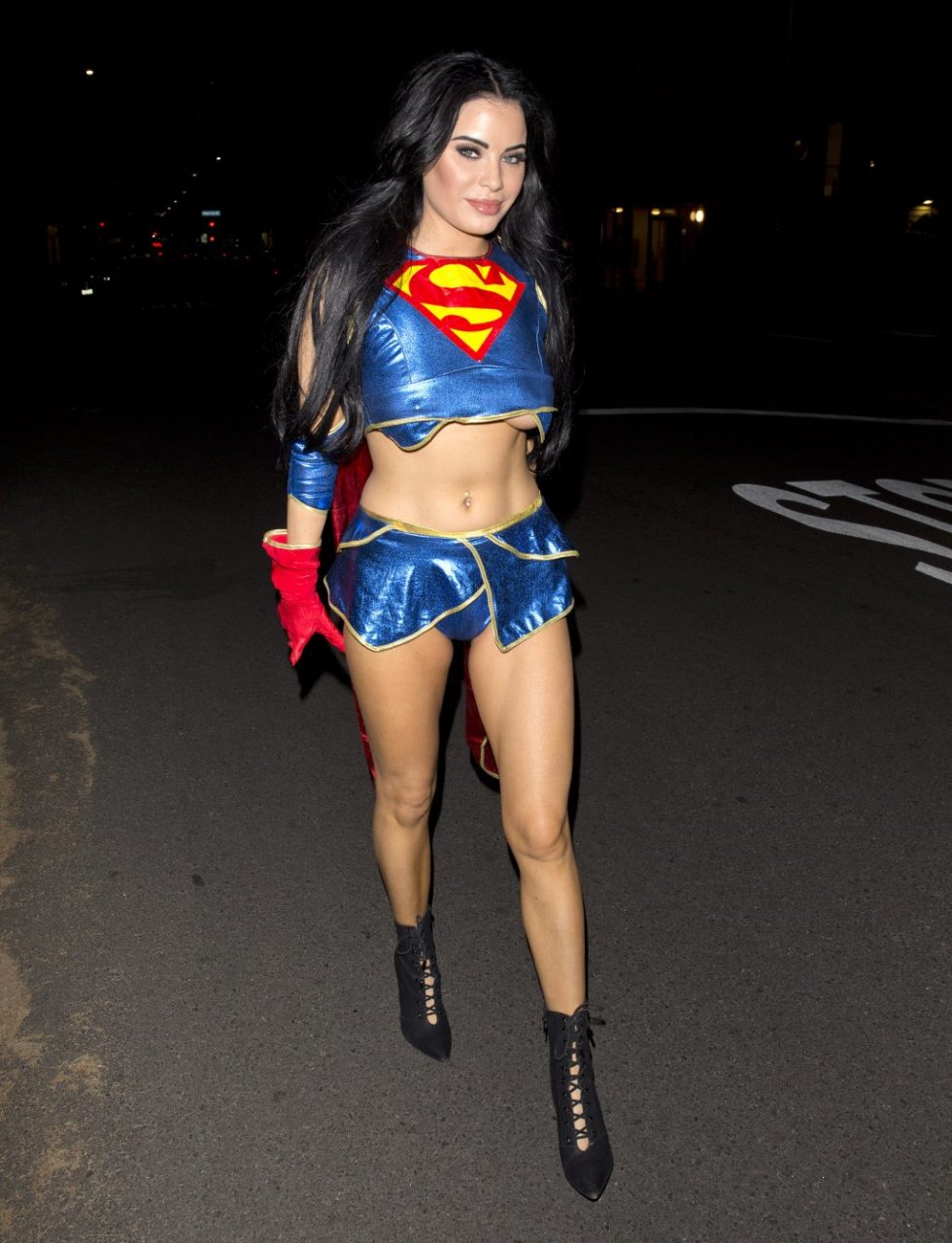 Брюнетка Карла Хоу позирует на красной дорожке на вечеринке The Karma Halloween Party в Лос-Анджелесе, 20.10.2018. 28-летняя сексуальная модель/актриса продемонстрировала свои сексуальные ягодицы и грудь в сексуальном костюме Супермена.