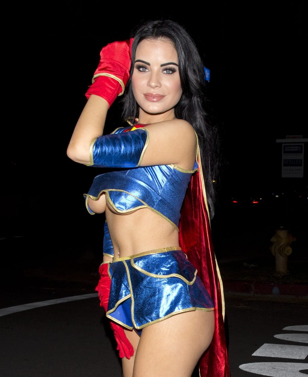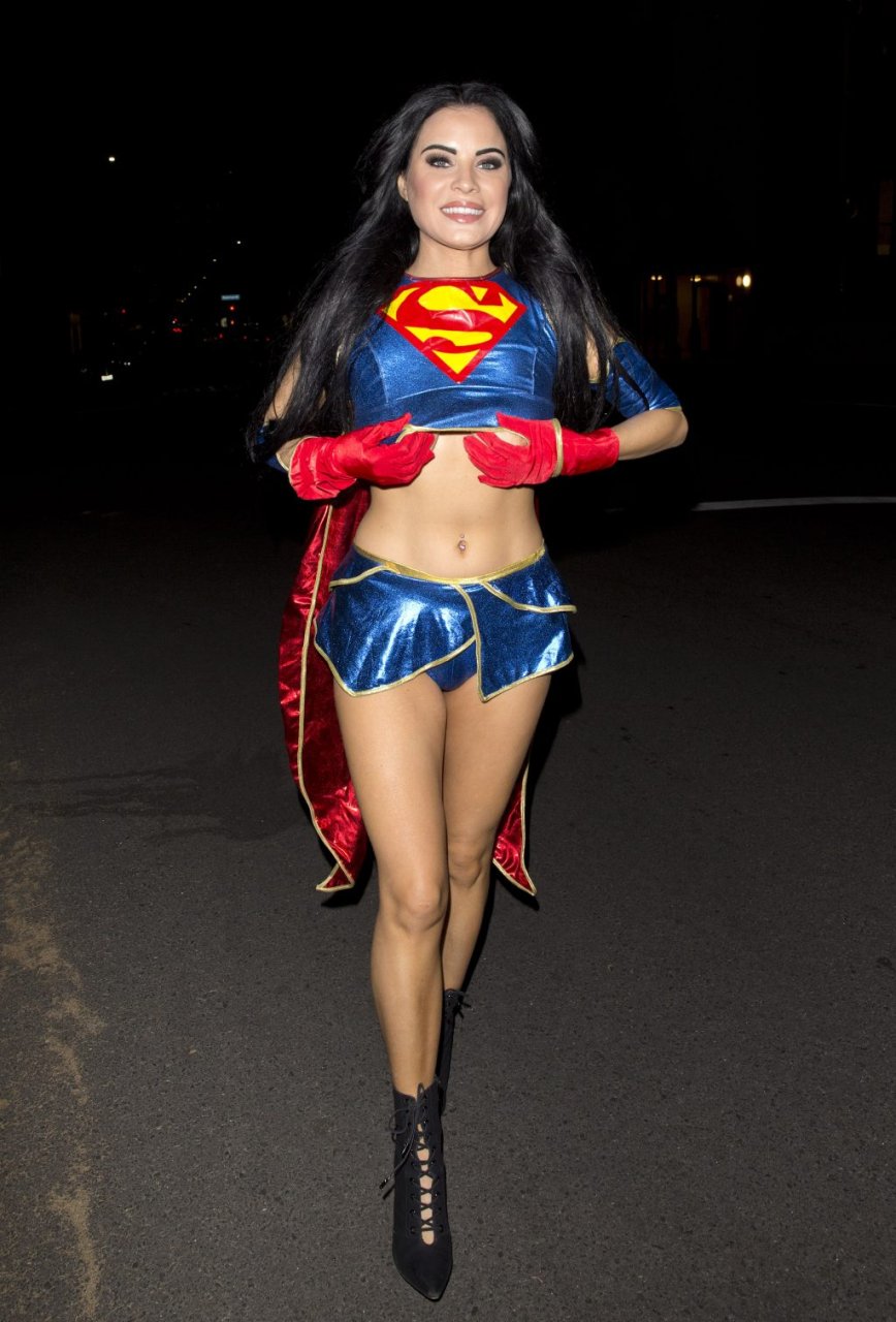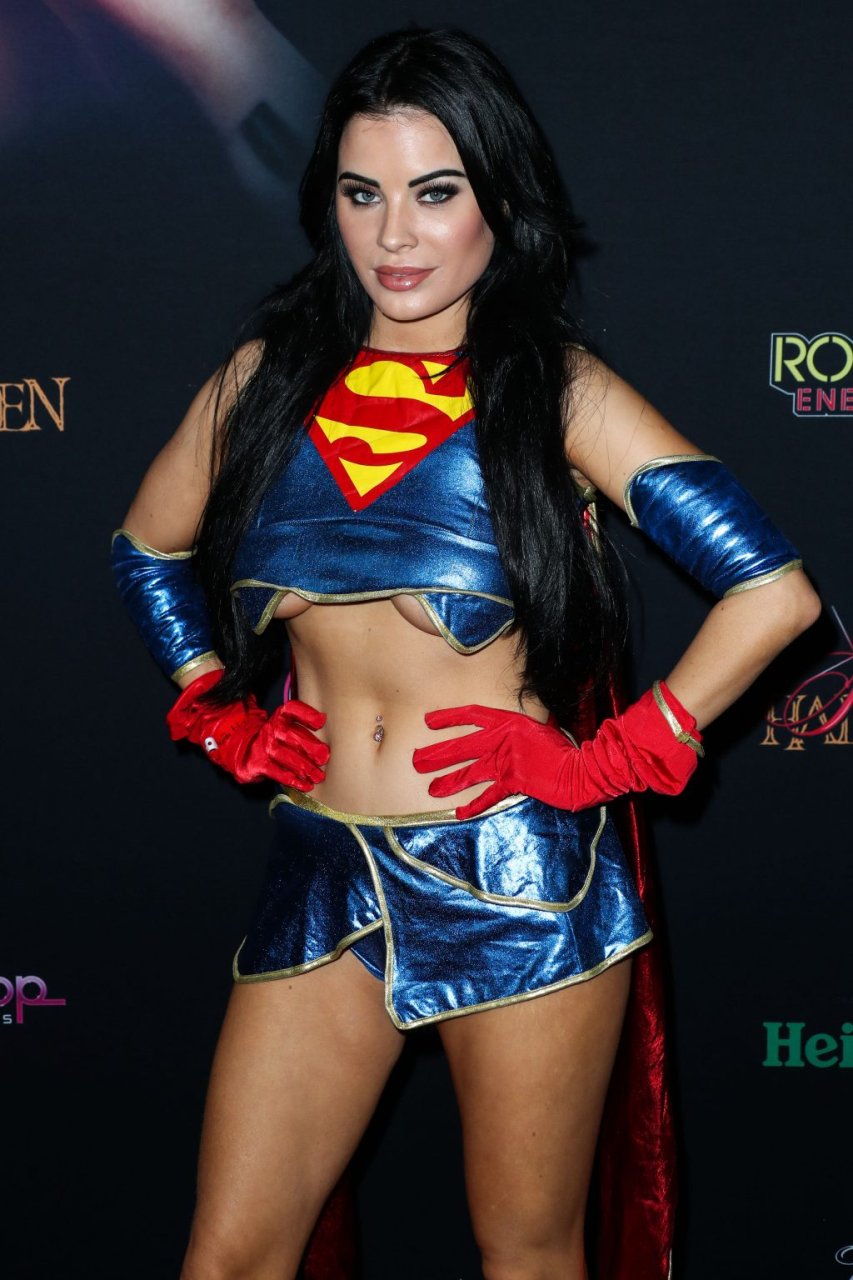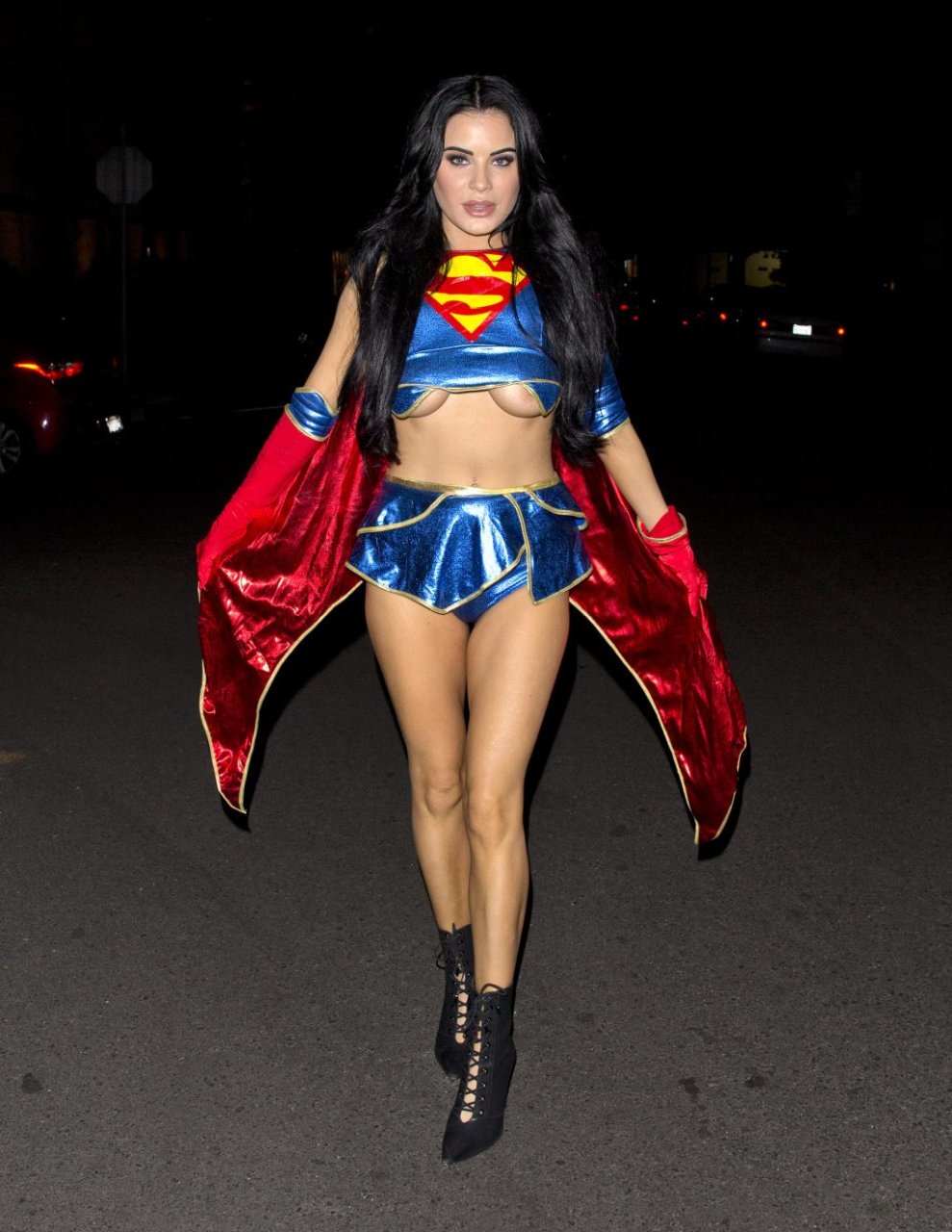 Брюнетка Карла Хоу позирует на красной дорожке на вечеринке The Karma Halloween Party в Лос-Анджелесе, 20.10.2018. 28-летняя сексуальная модель/актриса продемонстрировала свои сексуальные ягодицы и грудь в сексуальном костюме Супермена.
