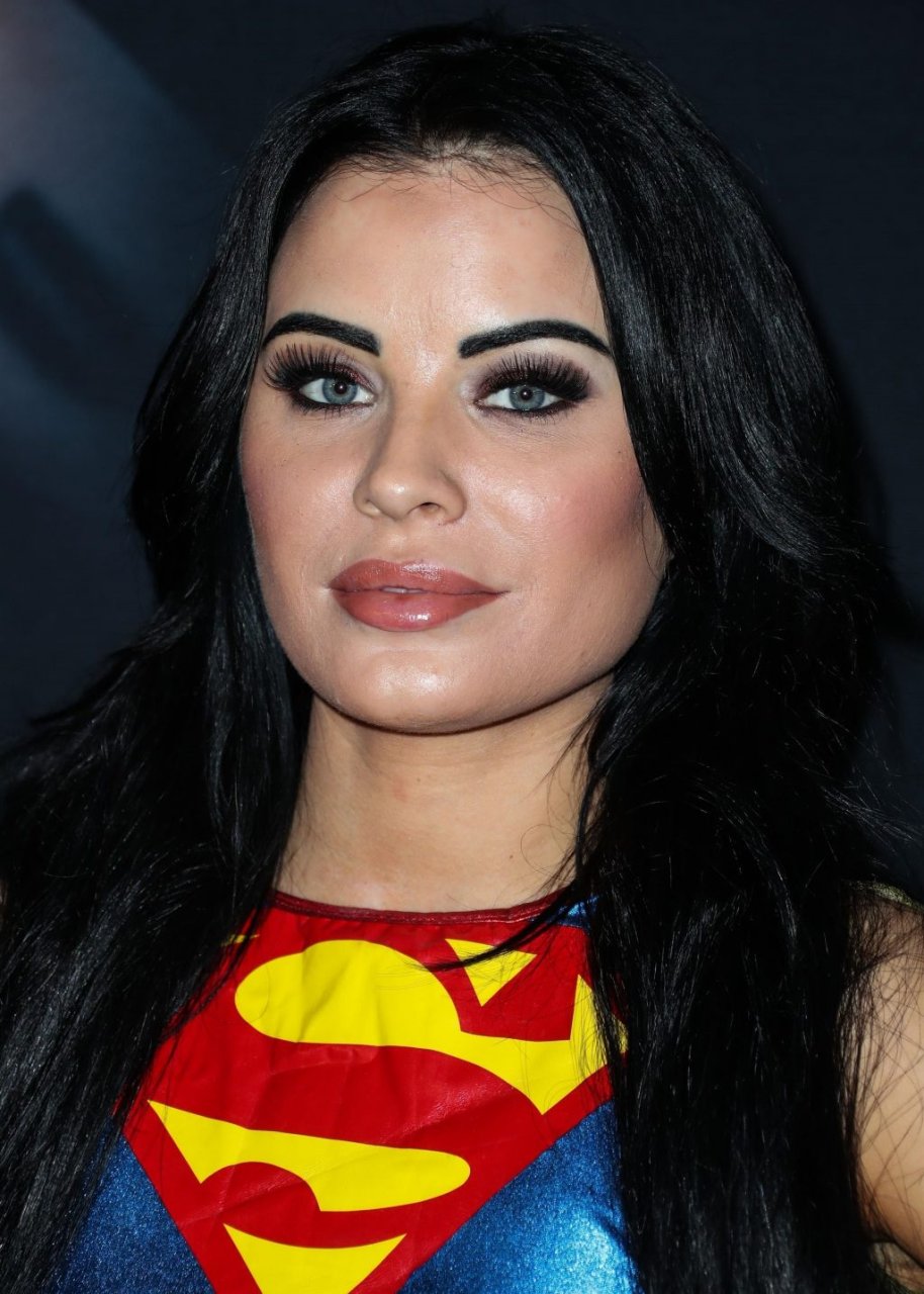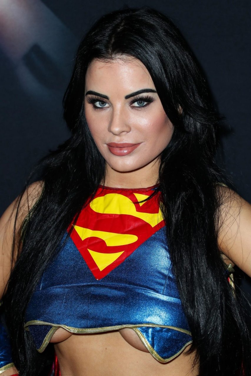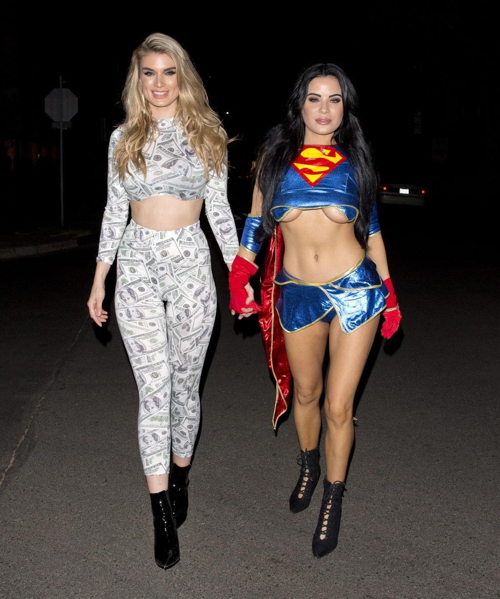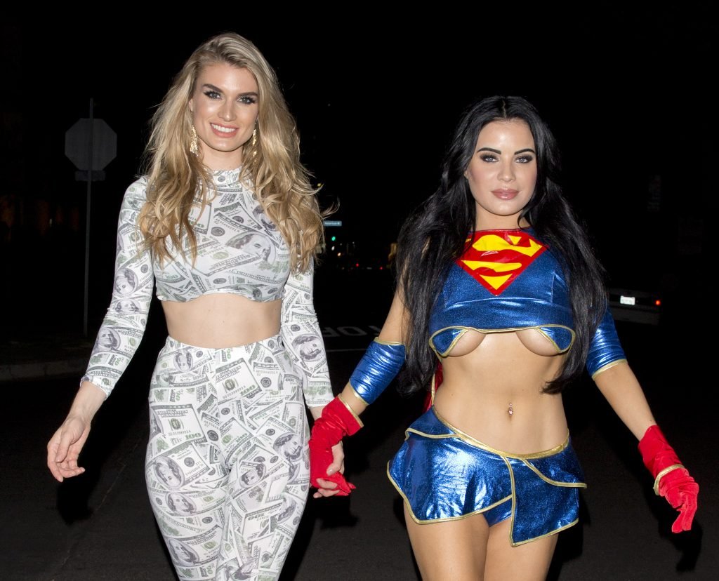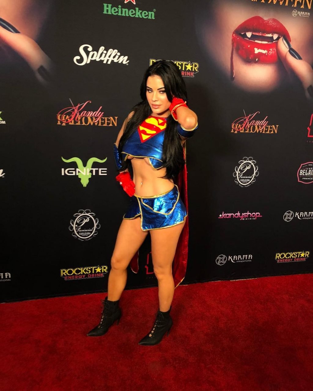 Брюнетка Карла Хоу позирует на красной дорожке на вечеринке The Karma Halloween Party в Лос-Анджелесе, 20.10.2018. 28-летняя сексуальная модель/актриса продемонстрировала свои сексуальные ягодицы и грудь в сексуальном костюме Супермена.