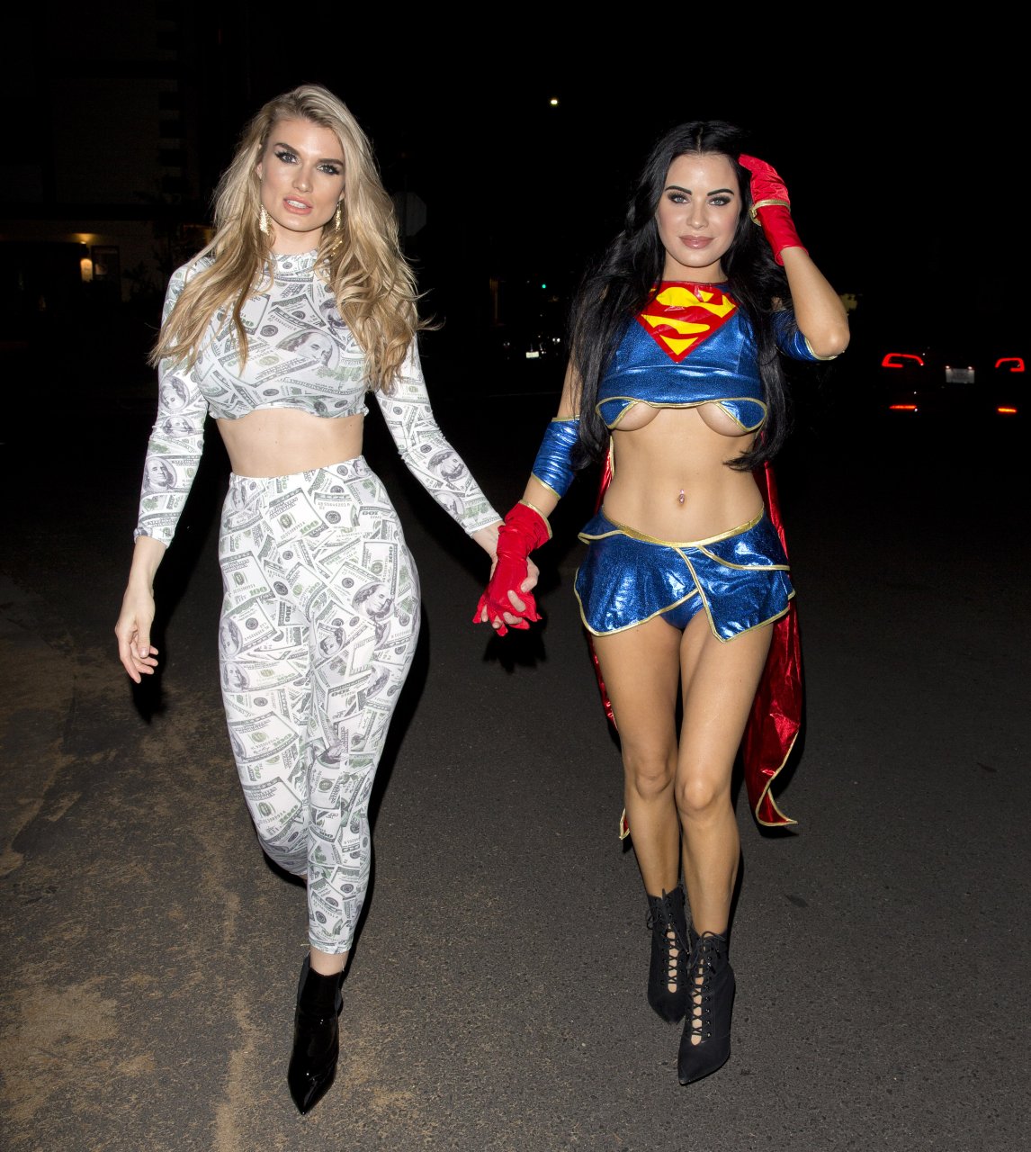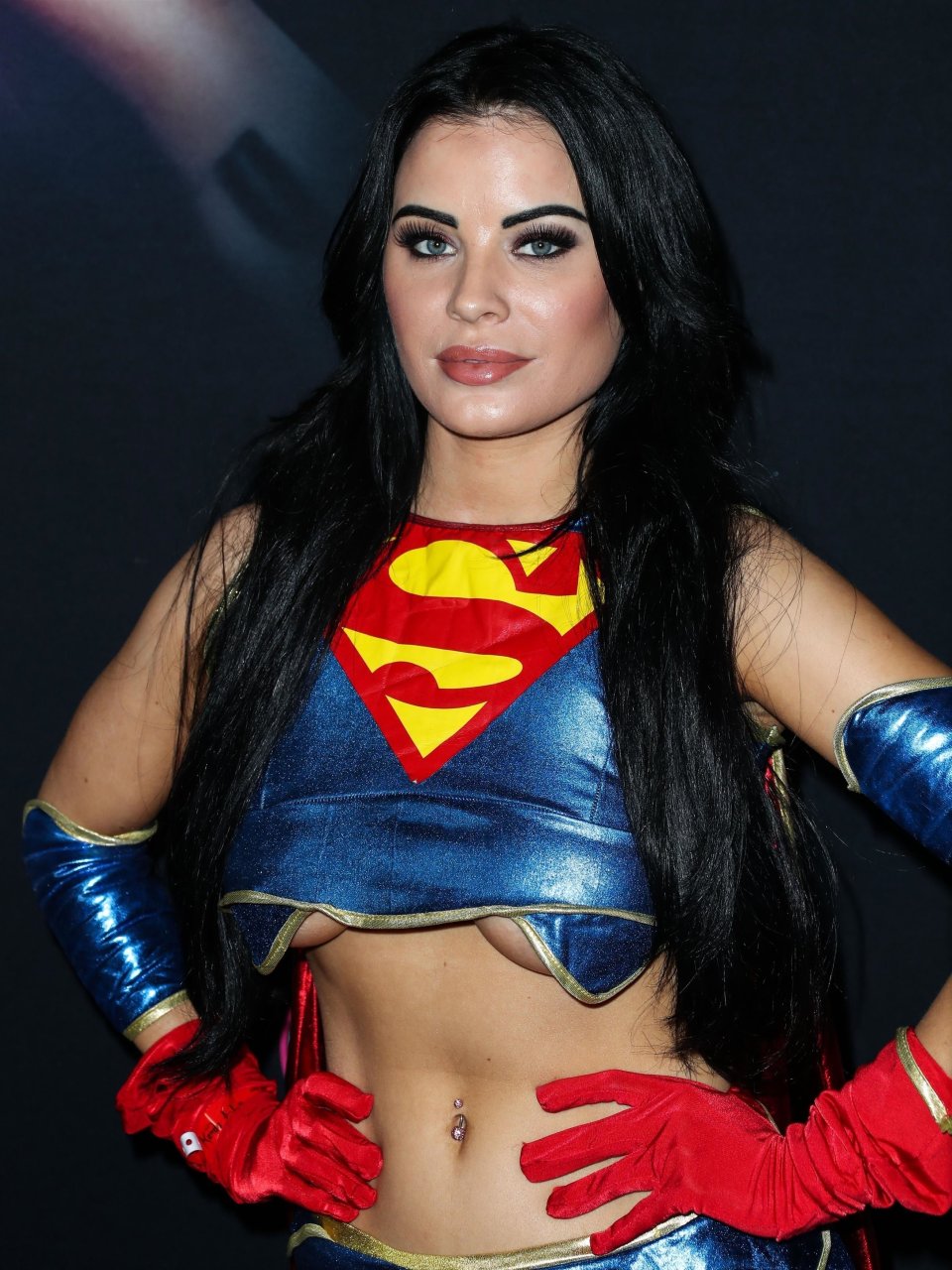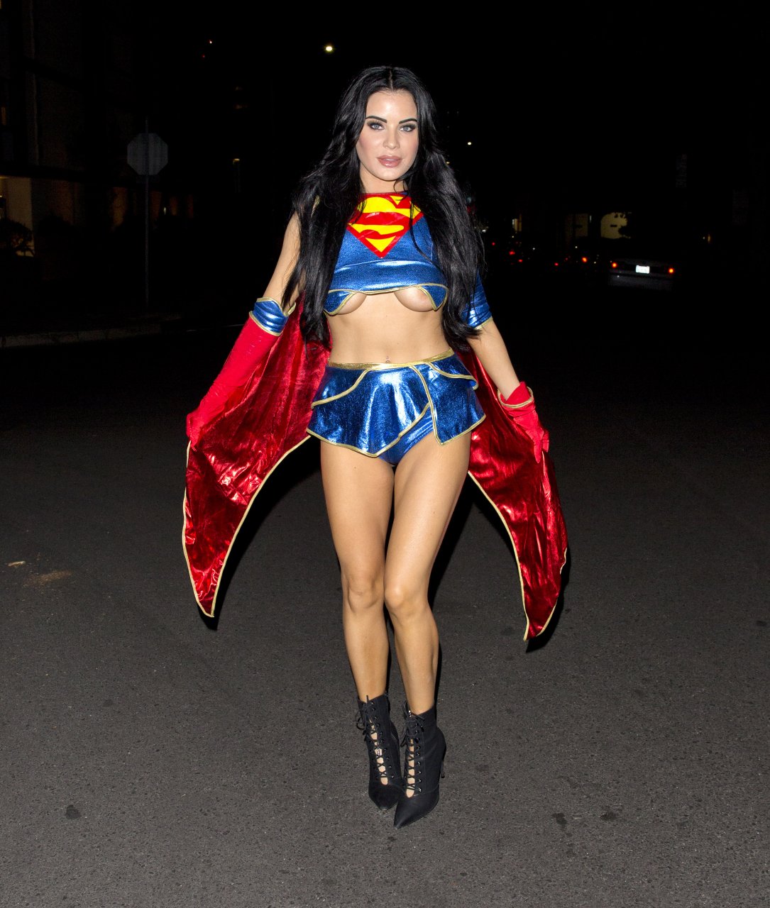 Брюнетка Карла Хоу позирует на красной дорожке на вечеринке The Karma Halloween Party в Лос-Анджелесе, 20.10.2018. 28-летняя сексуальная модель/актриса продемонстрировала свои сексуальные ягодицы и грудь в сексуальном костюме Супермена.
