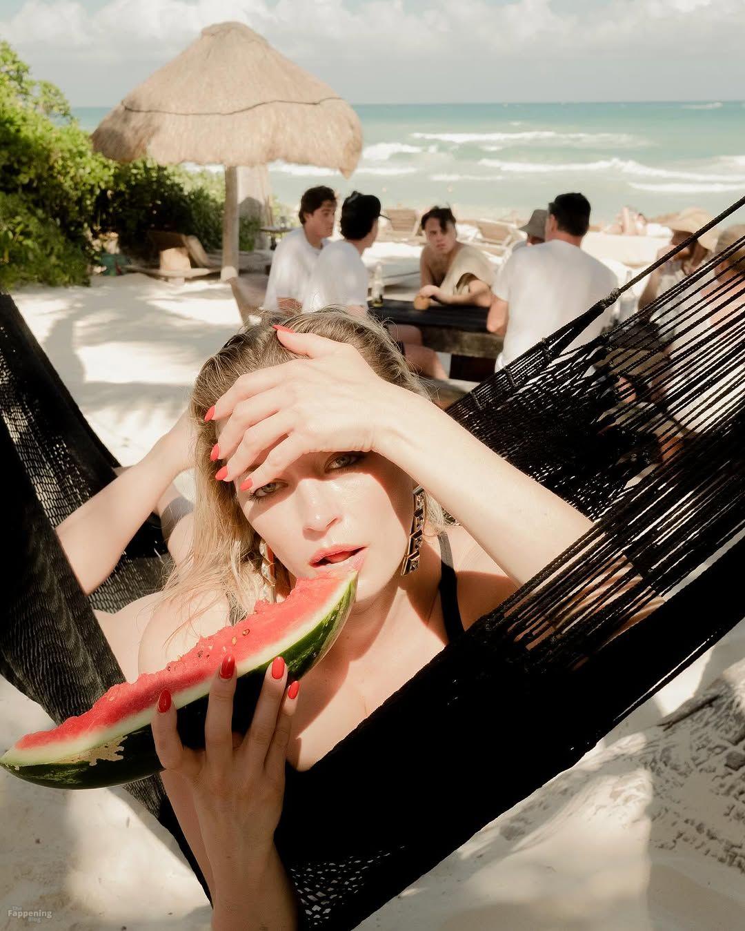 Модель Каролин Вриланд демонстрирует свою потрясающую фигуру в черном купальнике, отдыхая на пляже Тулума.