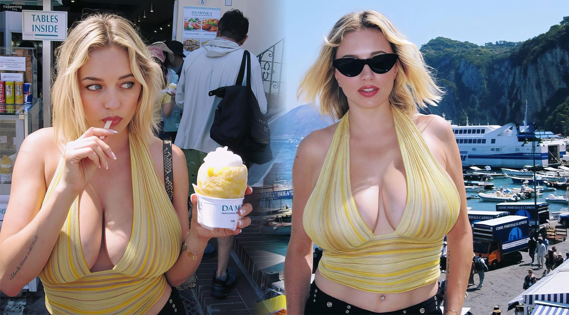 Британская модель, музыкант и актриса Каролин Вриланд показывает глубокое декольте на Капри, эффектно выглядя в желтом топе с глубоким вырезом.