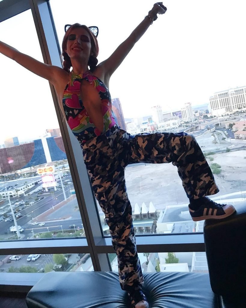 Дикая модель, актриса и звезда Instagram Белла Торн (20 лет) демонстрирует свои уникальные модные решения, гуляя с подругой в Body Electric Tattoo & Piercing в Вест-Голливуде, 10.10.2017.