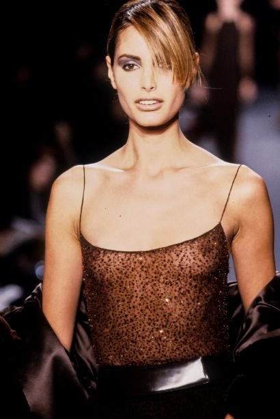 Эльза Бенитес носит прозрачное платье на показе Halston Runway Show (осень/зима 1997). Эльза Бенитес Яньес — мексиканская модель и телеведущая. Возраст: 40.