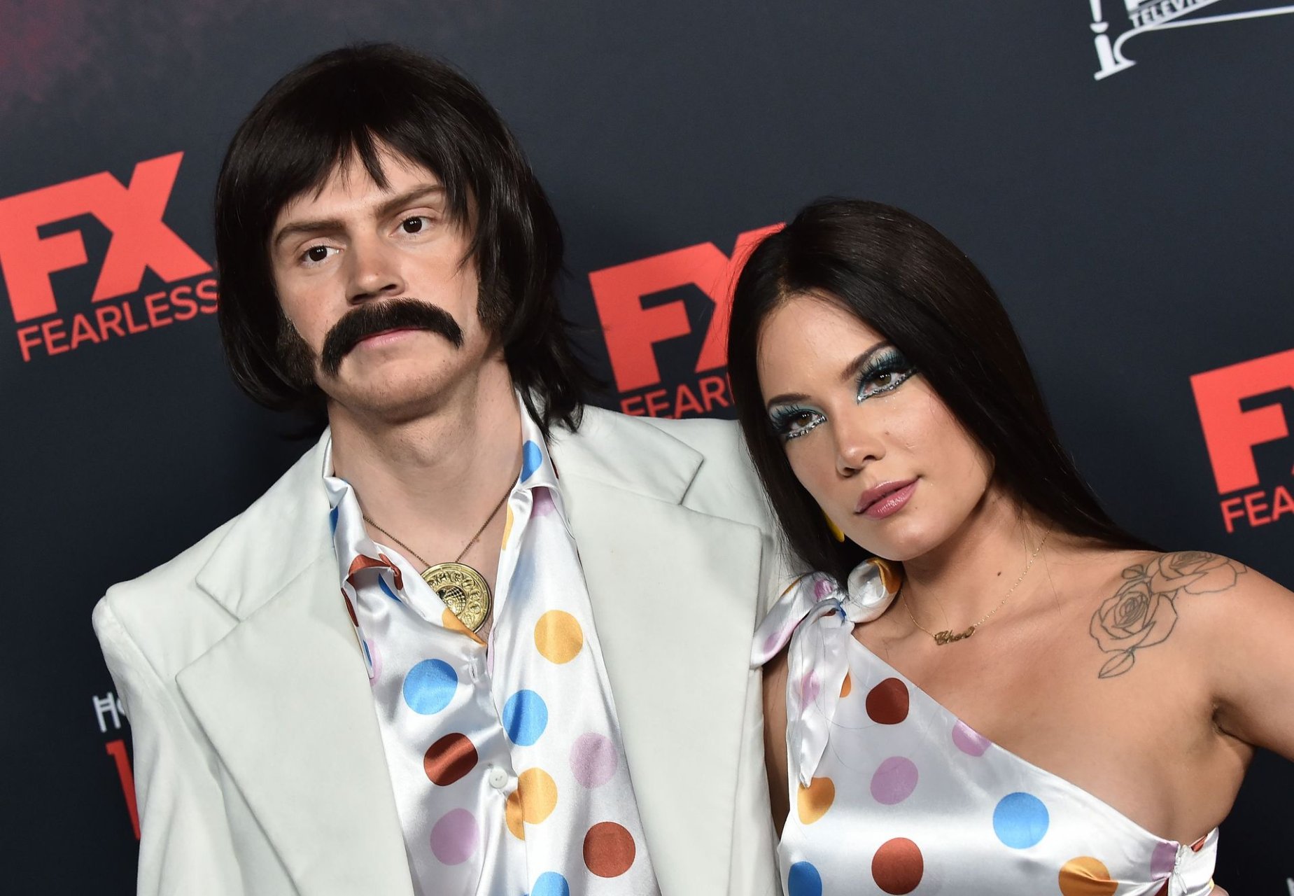 Американский актер Эван Питерс и певица/автор песен Холзи (Эшли Николетт Франджипани), как Сонни и Шер, прибывают на красную дорожку на мероприятии в честь 100 эпизодов сериала FX “Американская история ужасов” на кладбище Hollywood Forever в Лос-Анджелесе 26 октября 2019 года.