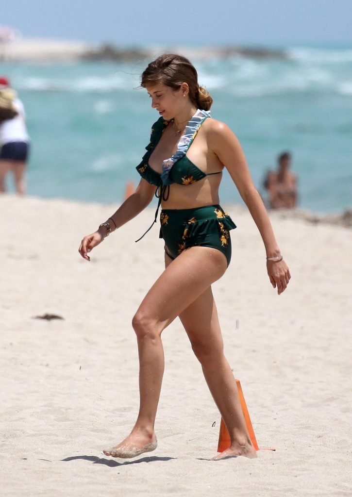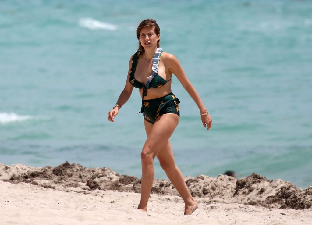Cathy Fisher, жена немецкого футболиста Матса Хуммельса, запечатлена на пляже в двухсекционном зеленом бикини с оборками, обнимая своего новорожденного сына Людвига в Майами-Бич, Флорида, 23.04.2018. Кэтрин “Кэти” Фишер-Хуммельс — немецкая телеведущая. Дата рождения: 31 января 1988 года.