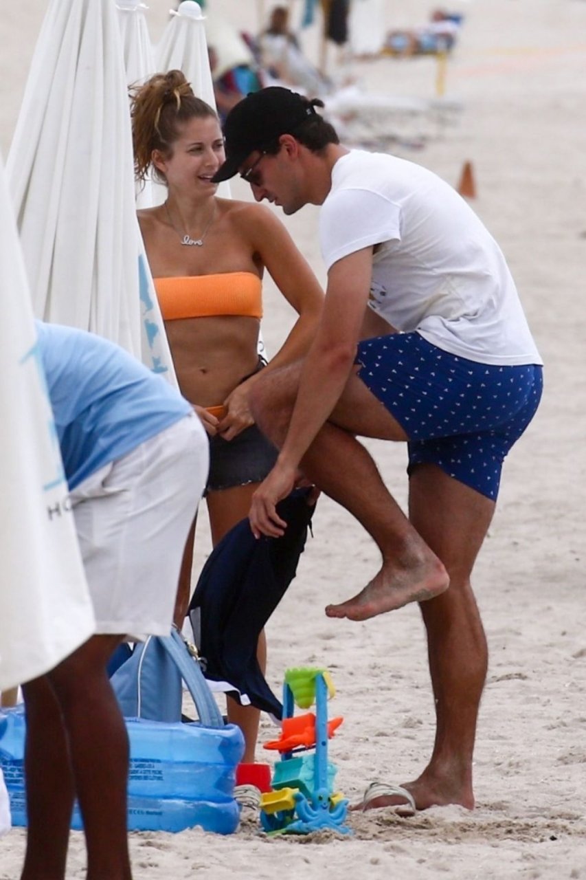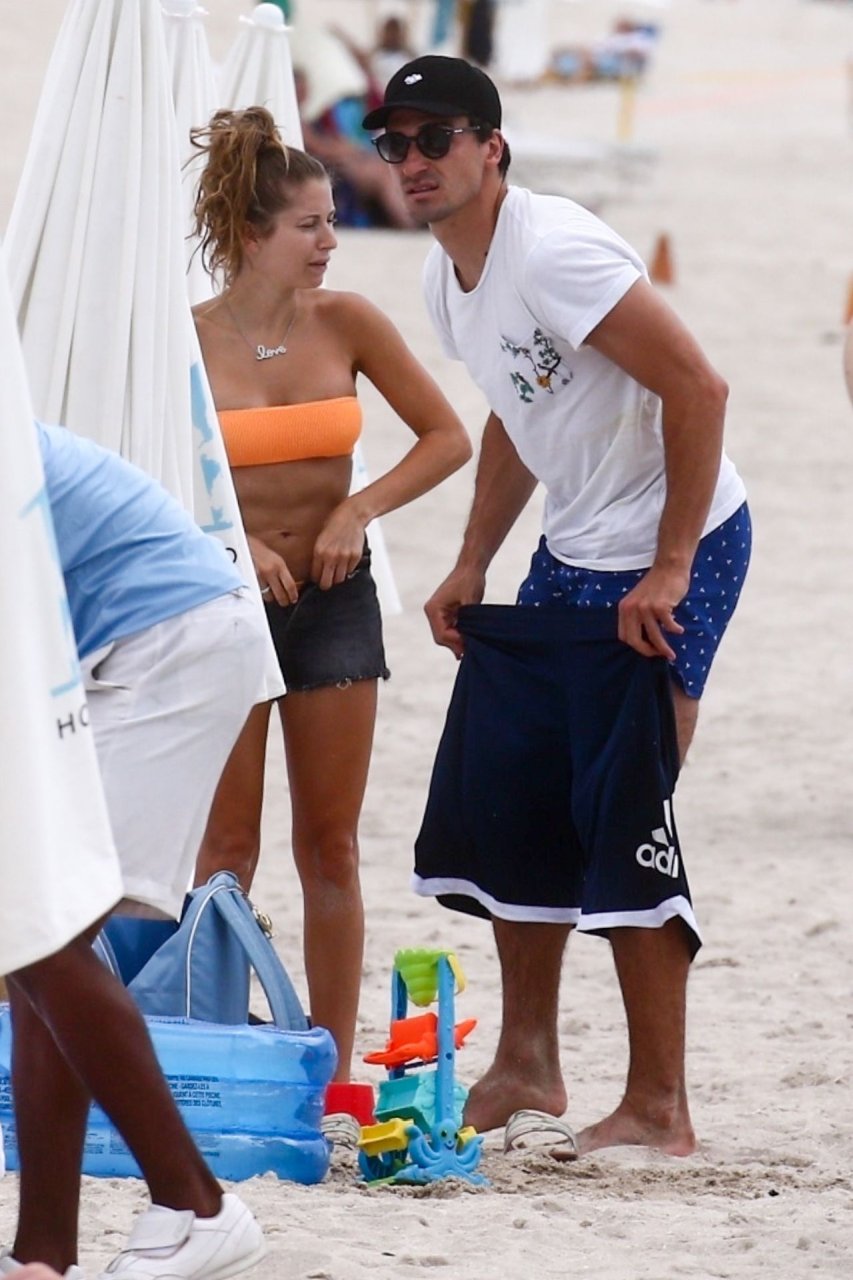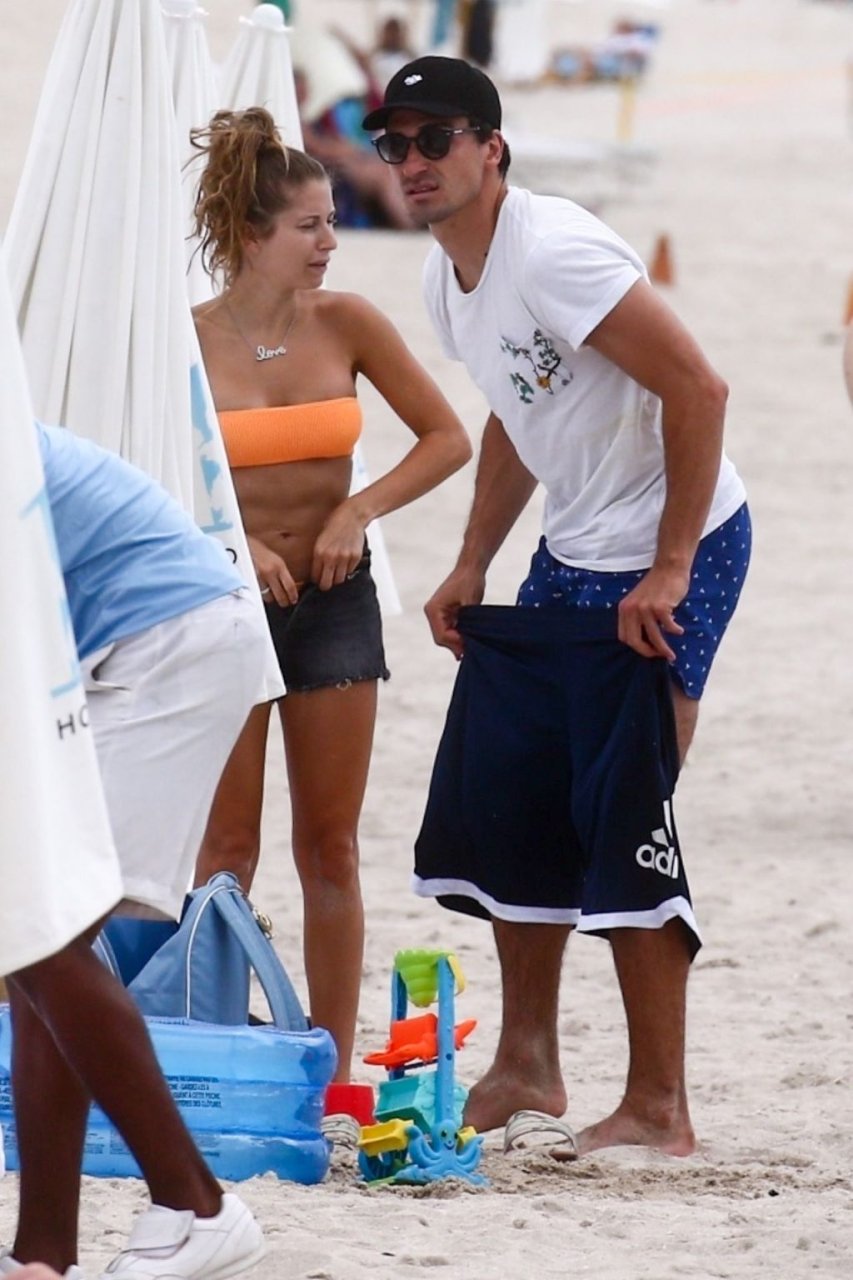 Кэти Хуммельс в оранжевом бандо-бикини на пляже с мужем Матсом Хуммельсом и их сыном в Майами, 13.06.2019. Кэти продемонстрировала свою фигуру после родов и освежилась в воде.